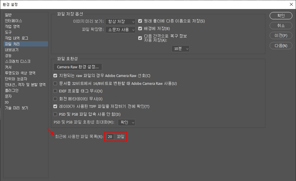 편집>환경설정>파일처리
