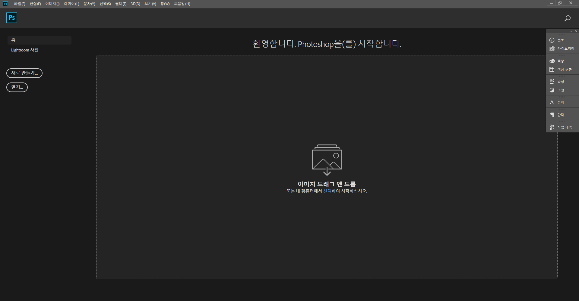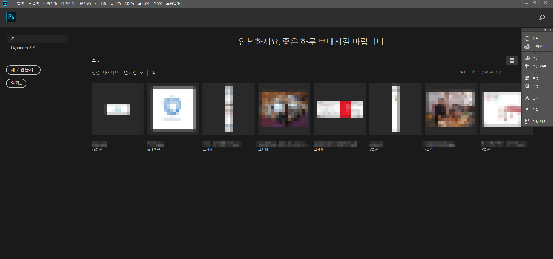 포토샵을 종료하고 다시 시작하면 최근파일 사라진 것을 볼 수 있습니다. 손쉽게 클릭 몇번으로 최근파일 리스트가 사라졌습니다. 다시 보이게 하고 싶다면 파일 목록에 값을 넣어주면 됩니다.