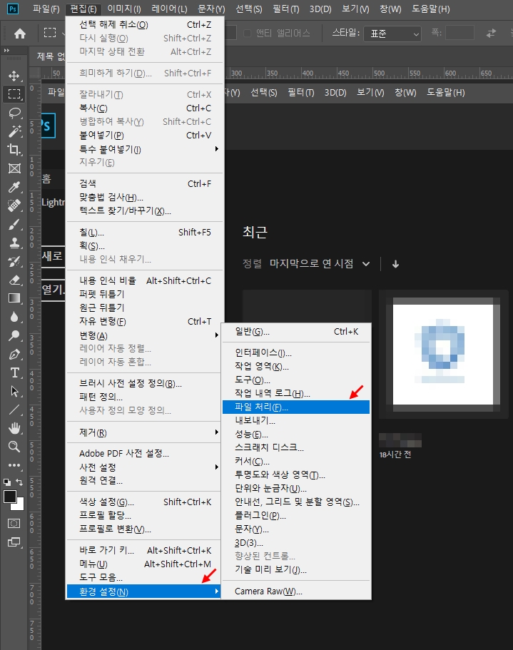 포토샵CC 2019 최근파일 삭제