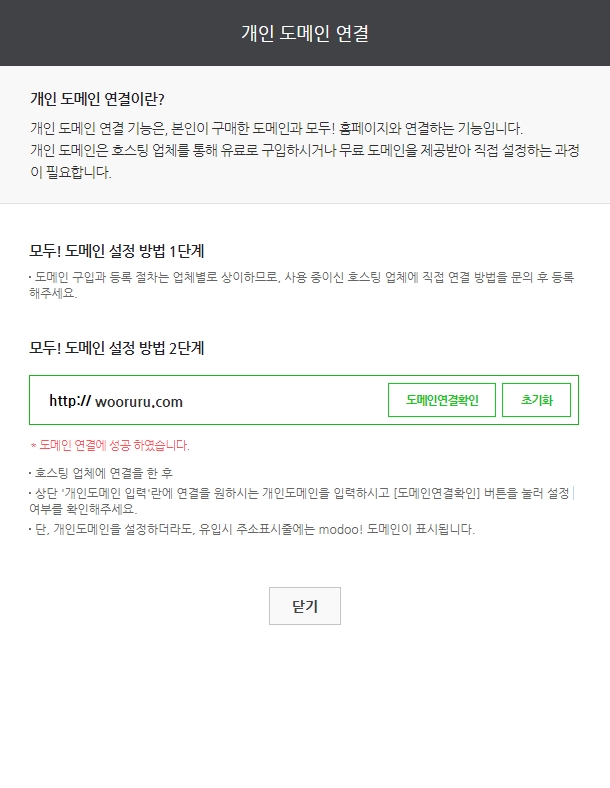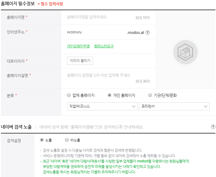 이렇게 검색을 하게 되면 개인도메인을 연결하고 싶은 욕심이 생깁니다. 홈페이지 필수정보에서 인터넷주소영역의 개인 도메인 연결을 선택하여 가지고 있는 도메인을 입력하면 됩니다. 개인도메인 연결시 알아둬야 할 점은 링크가 연결되면서 도메인 주소가 modoo 도메인으로 바뀌게 됩니다.