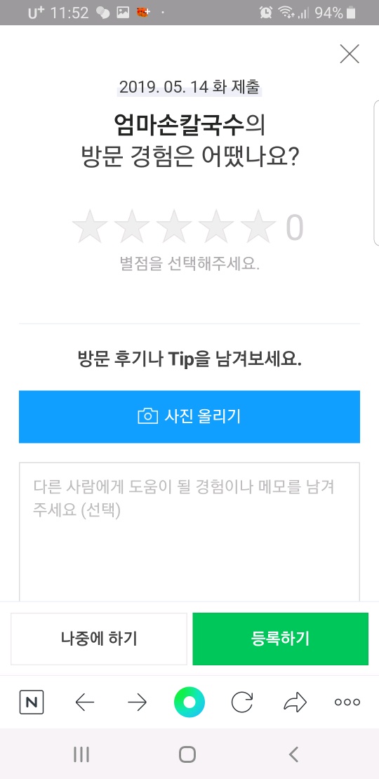 영수증과 같은 장소인지 확인하고 나면 이용했던 서비스에 대한 별점평가, 사진을 첨부하고 후기 내용을 입력해야 합니다. 후기 내용은 400글자 이내로 써야 되며 짧게 써도 됩니다. 사진은 1장이상만 올리면 됩니다. 영수증과 방문장소가 일치할 경우 후기를 작성하면 바로 포인트를 지급하게 됩니다.