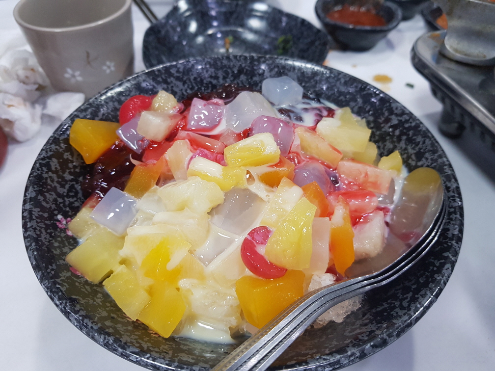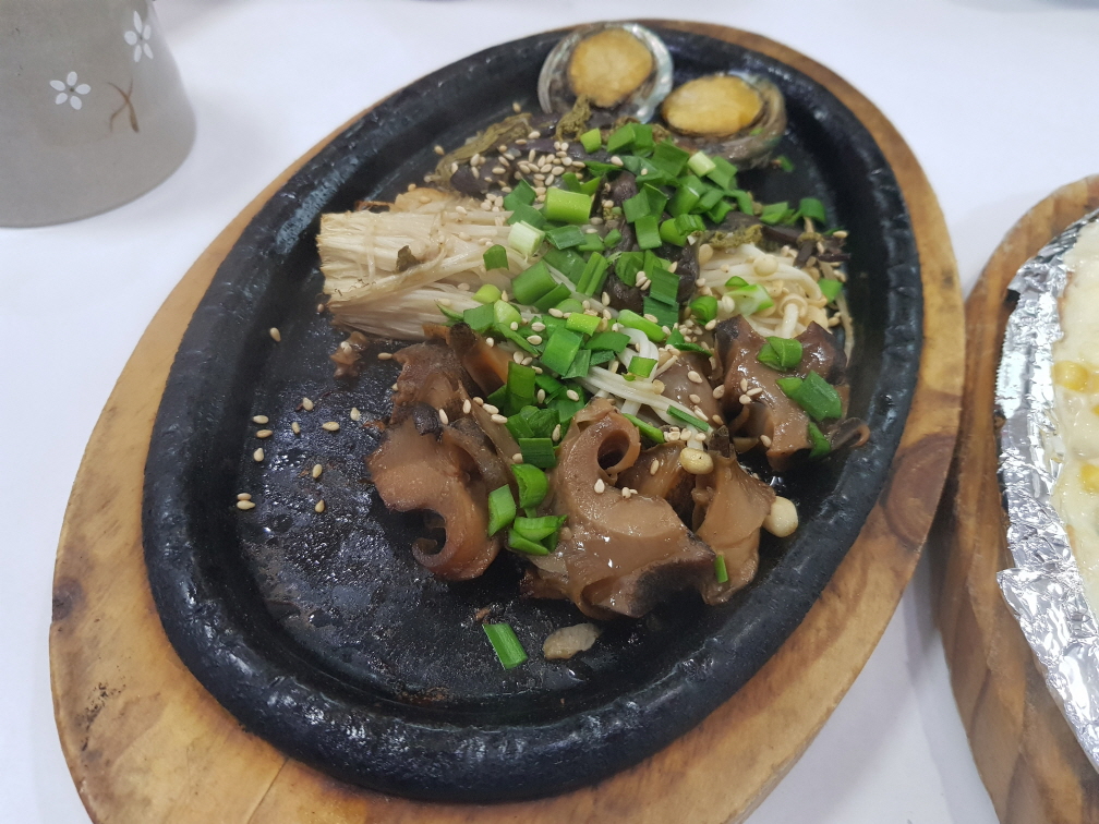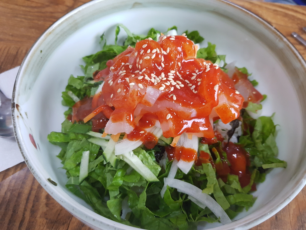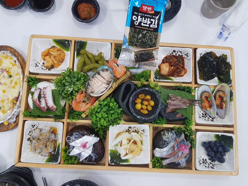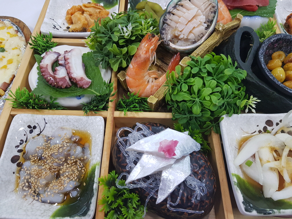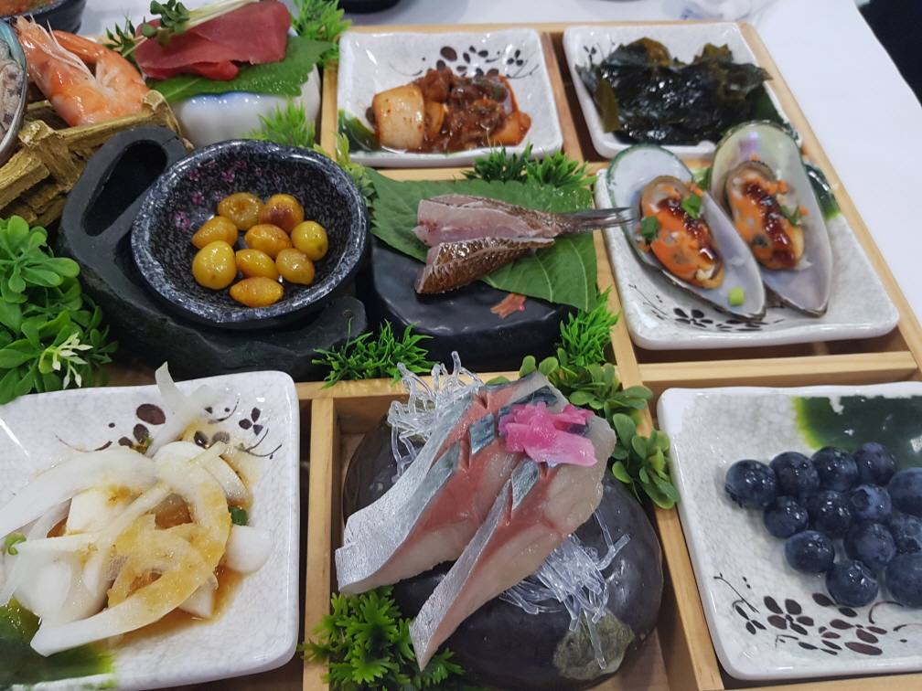 3인가족이 가서 2인분을 주문해도 됩니다. 우리는 '특2인모듬스페셜'을 주문했습니다. 전체적인 메뉴를 설명하자면 맛이 없던 메뉴는 콘치즈, 미역국, 비빔국수, 은행, 홍합같은 미리 준비해놓은 음식입니다. 그외에 찹살떡, 전복, 갈치회, 고등어회, 낙지탕탕이, 회, 볶음밥, 해삼, 매운탕, 팥빙수는 괜찮았습니다. 초밥은 무한리필인데 다른 음식들 먹다보면 추가로 주문할 수 없을 정도입니다. 수요일에 정기휴무로 알고 애월에 숙박을 안하고 이곳까지 왔는데 "연중무휴"라는 소식에 잠시 기운이 빠졌습니다. 그래도 맛집을 소개해주셨으니 맛있게 먹고갑니다.