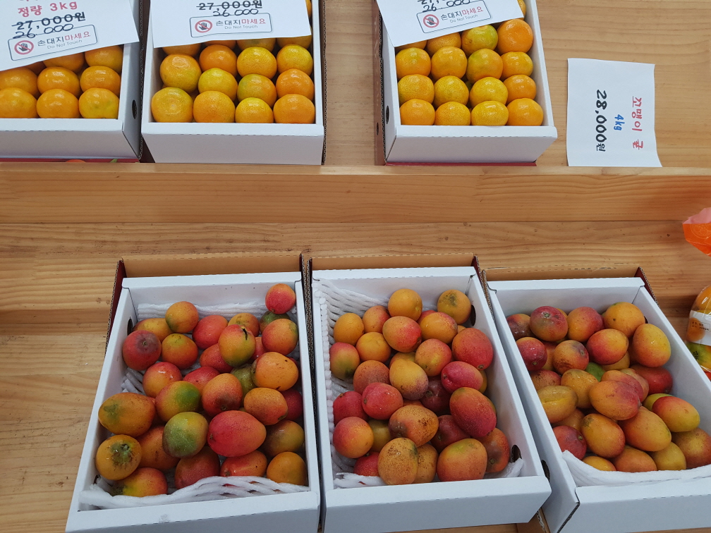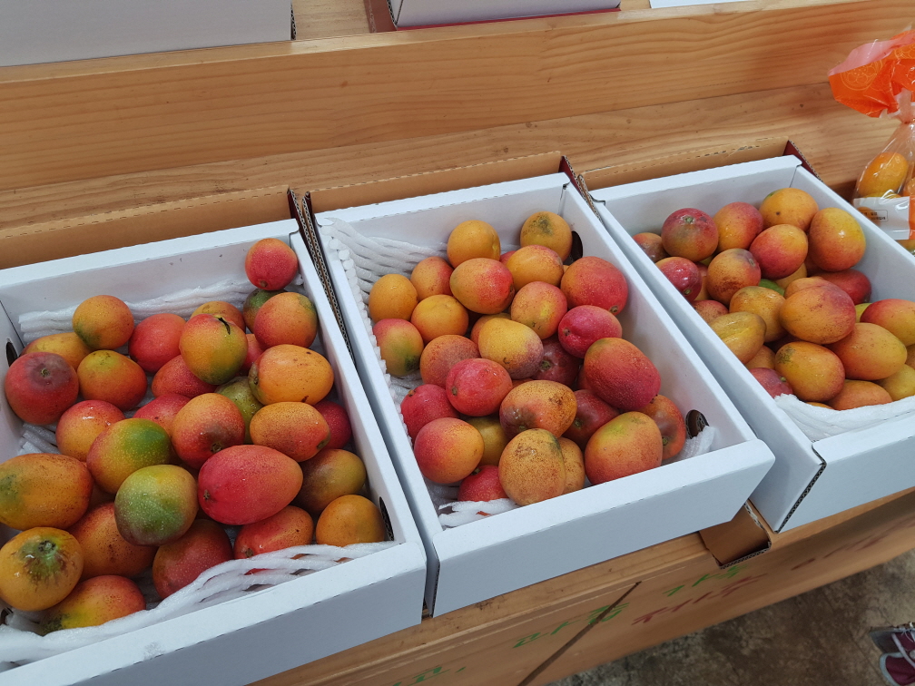 느영나영은 공항에 가까운 곳에 있는데 지금 인기있는 과일은 애플망고입니다. 애플망고는 옛날 80년대 바나나를 생각하면 될 정도로 비싼 과일이다. 사과크기만한 애플망고는 수박보다 비싸다. 동문시장에서 상품성이 떨어진 애플망고는 4~5개에 20,000원정도 판매할 정도로 고가의 과일인데 느영나영에서는 30~40개를 20,000원~30,000원정도에 살 수 있다. 덜 익은 것을 미리 따와 판매하는게 아니다보니 여행하면서 먹을 정도만 사던가 집으로 돌아오는 날 사는 것을 추천합니다.
