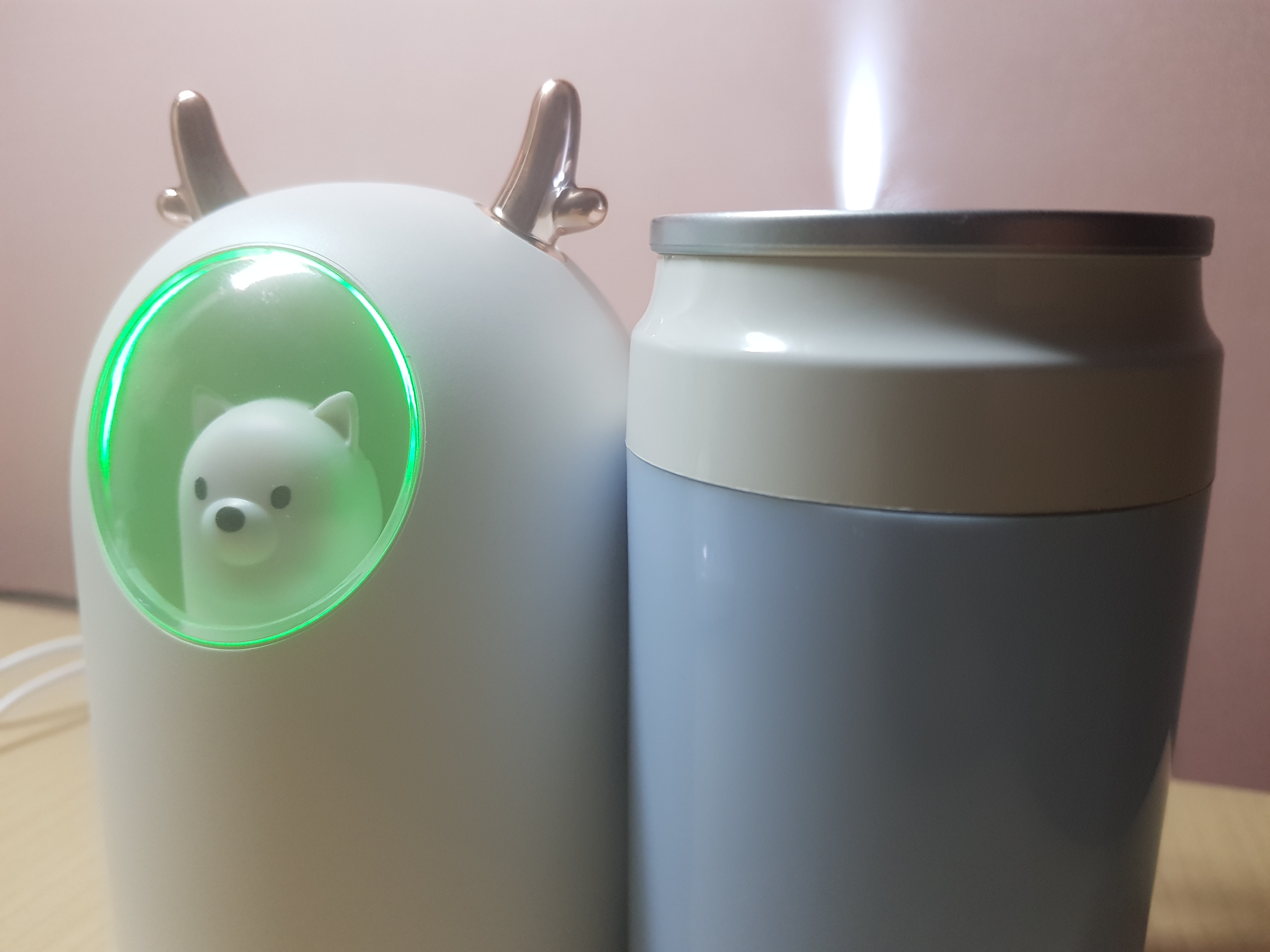 스미다 캔 미니 가습기는 불빛의 변화는 없지만 분무되는 물에 비춰 더 많이 분사되는 느낌입니다. 불을 꺼놓고 테스트하면 비슷한 분사량을 보입니다. 사무실에서 사용하기에는 스미다 캔 미니가습기가 사용하기에는 편리할 것으로 보여지고 아이방에서 사용시간이 길고 수조량이 많은 댕댕이 미니 가습기를 사용하는게 좋겠습니다.