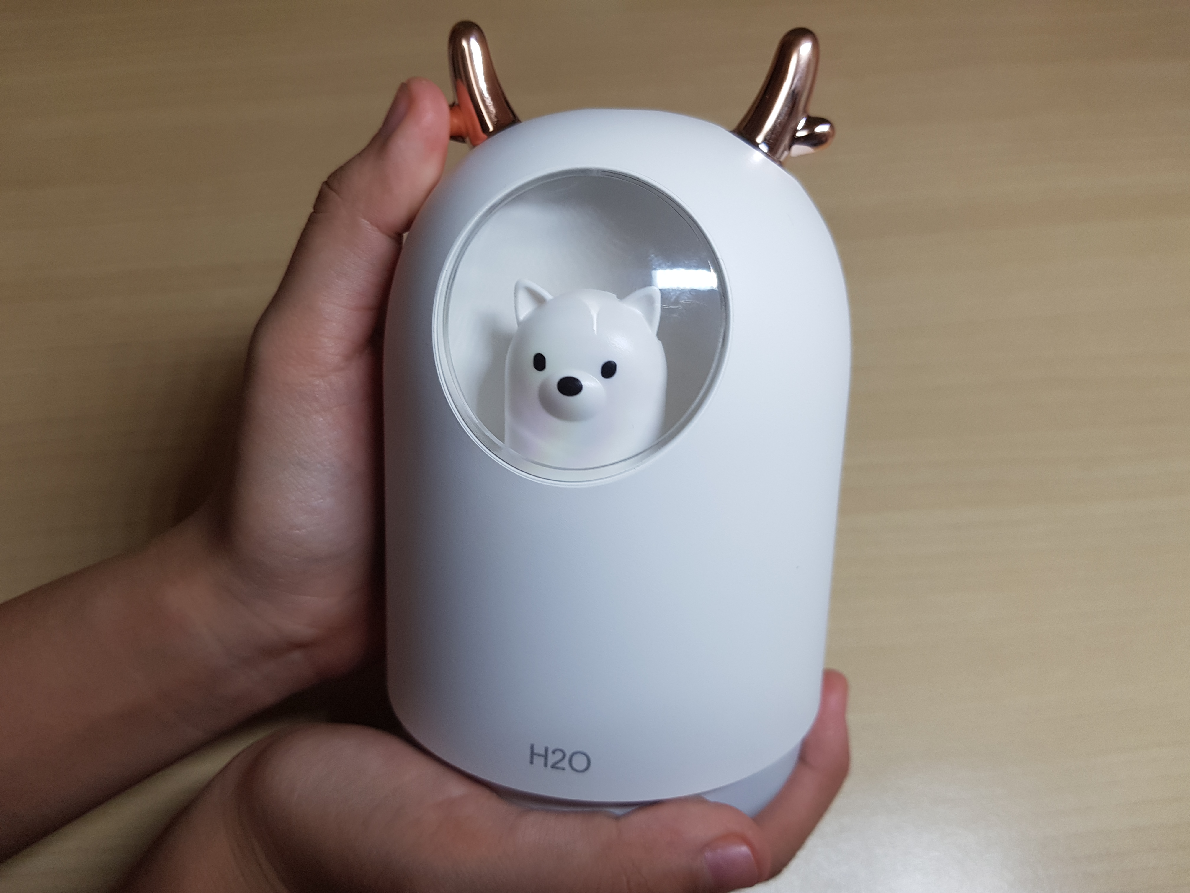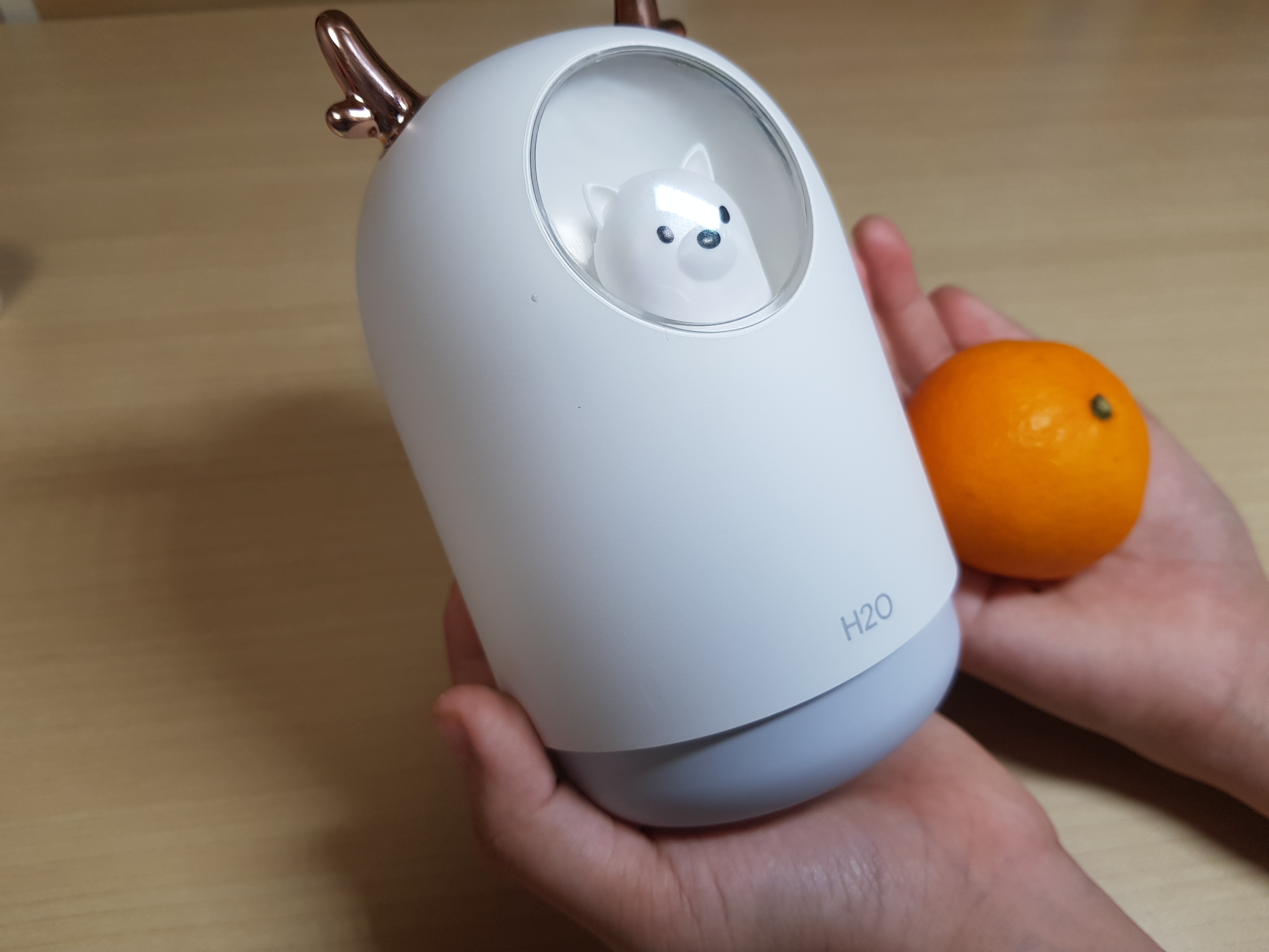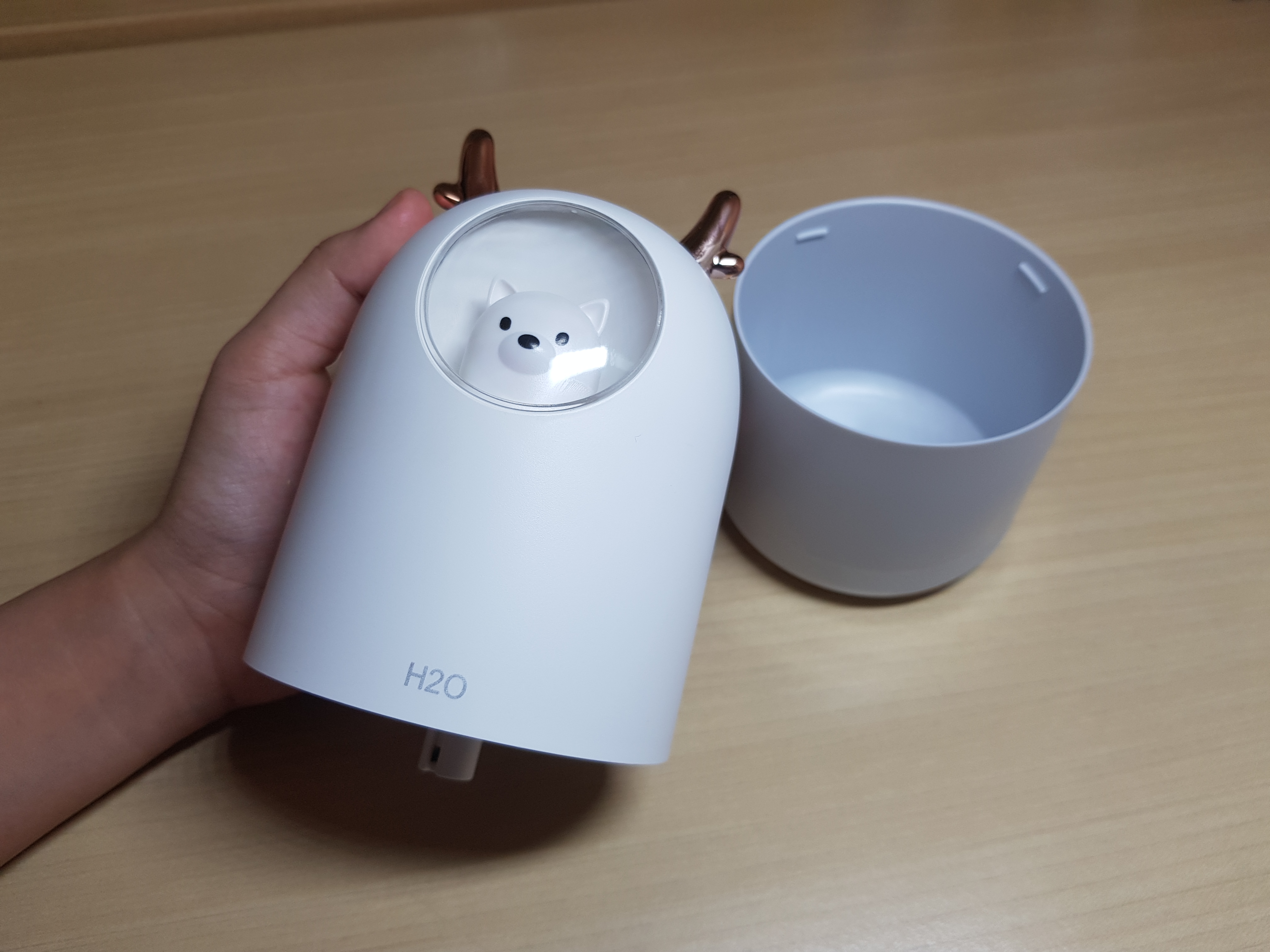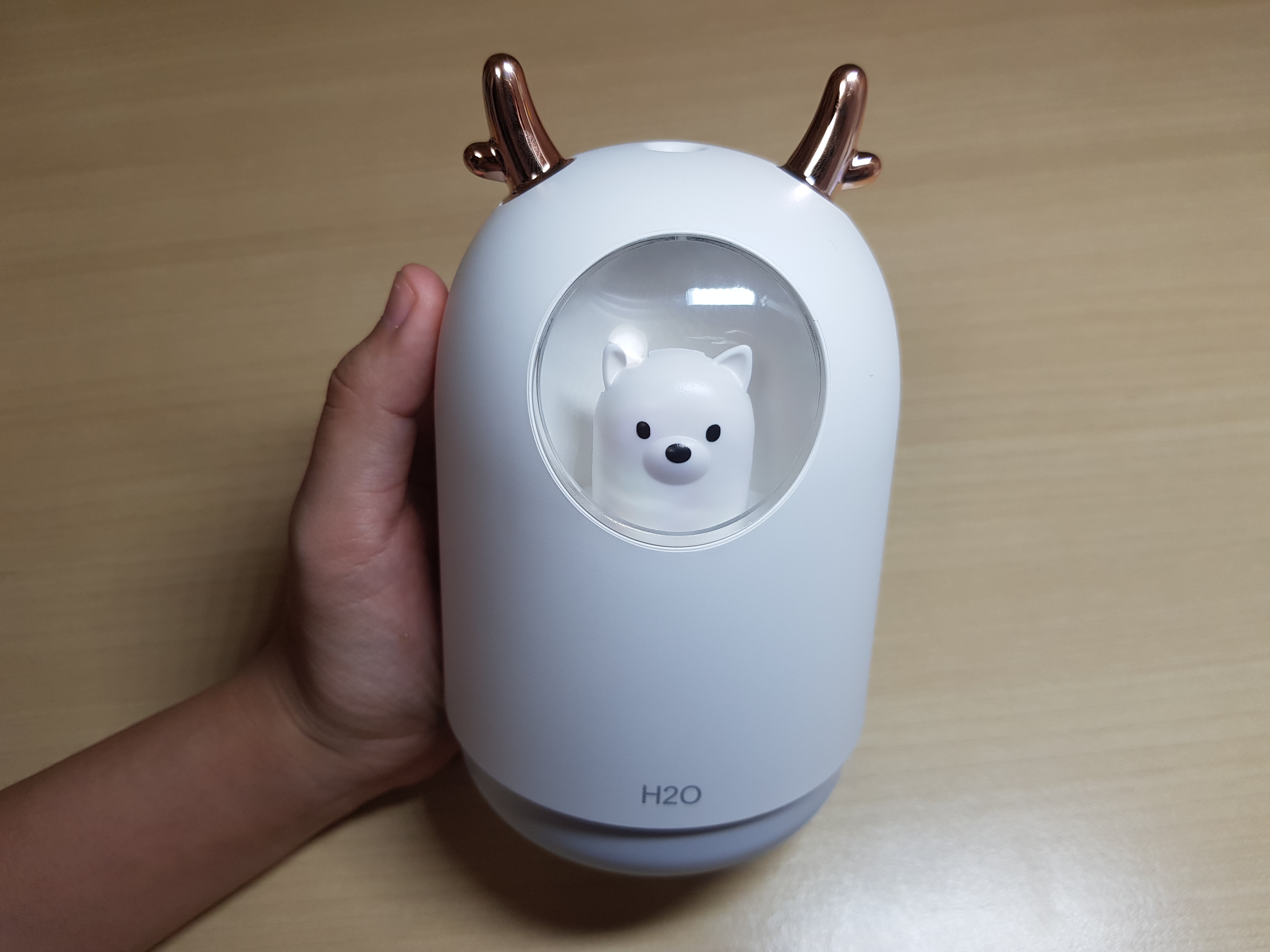 수조는 300ml로 4시간정도 사용할 수 있습니다. 사무실에서 사용시 하루에 2번정도 물을 채우면 하루 사용할 수 있습니다. 생수통 가습기보다 조금 작다고 보시면 될 것 같습니다. 무드등이 꺼져 있을때보다 켜져 있을때가 더 귀엽습니다. 댕댕이 미니가습기는 300ml, 스미다 미니가습기는 200ml의 수조량입니다.