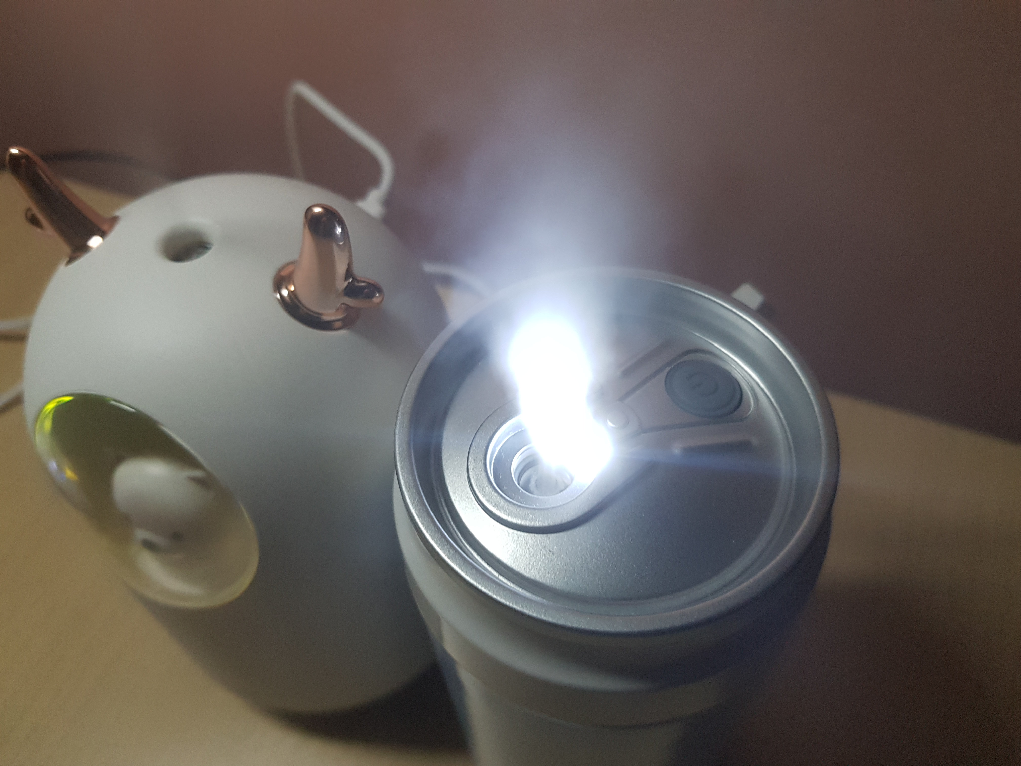 가지고 있던 깡통 캔 모형의 가습기와 비교시 비슷한 사이즈입니다. 토출구가 모두 위로 향해 있는데 캔모형의 가습기는 토출구에 LED 불빛 흰색을 켤 수 있습니다. 분사되는 물의양과 물의 양도 비슷한 사양입니다. 사무실에서 미니 가습기로 쓰는 초음파 가습기는 거의 비슷한 수조 (300~500ml)입니다.