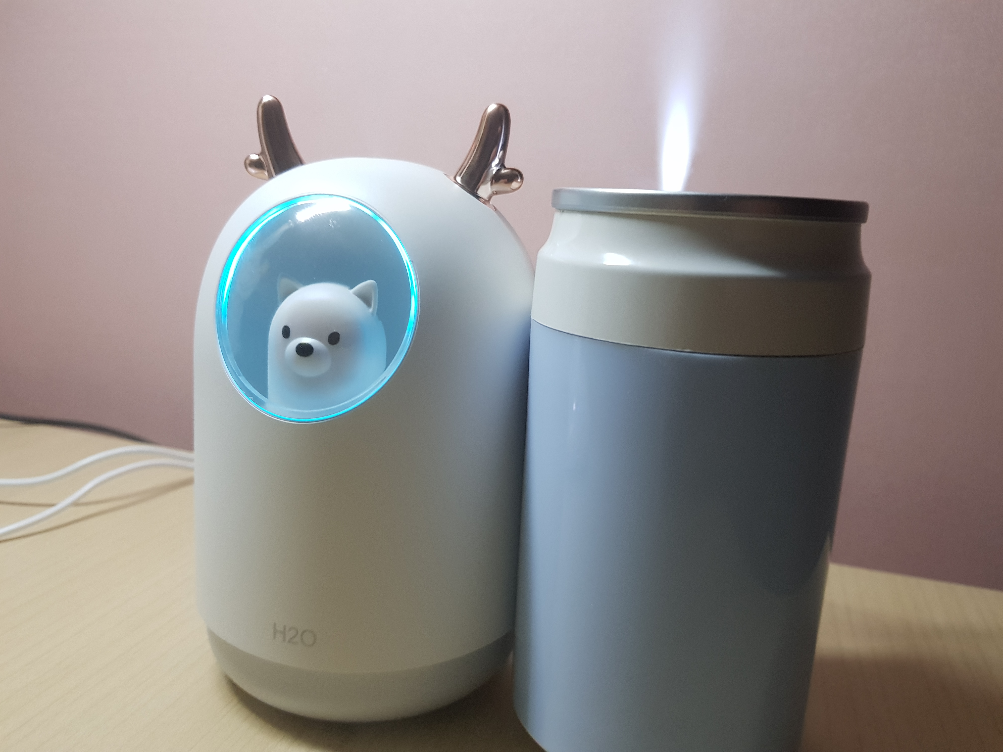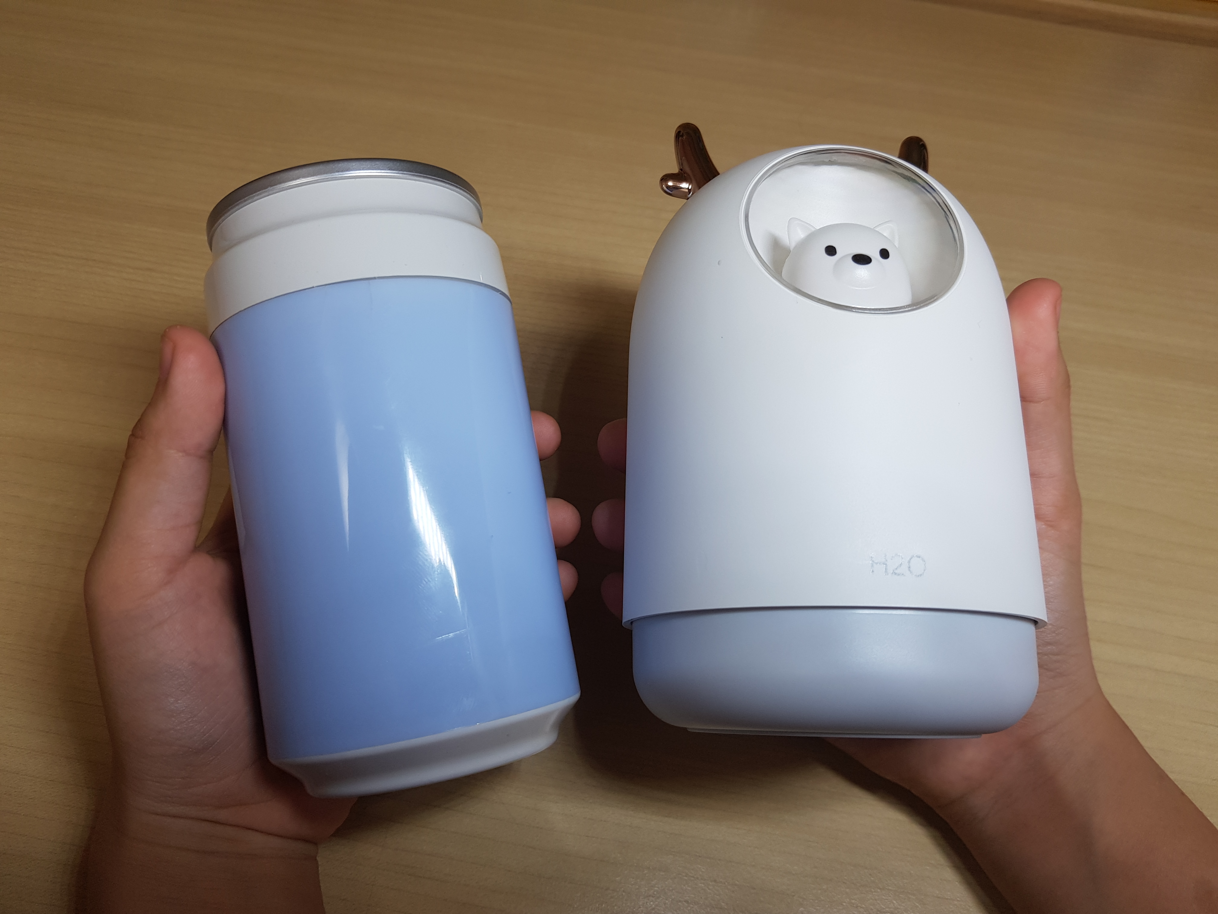 외관은 댕댕이 미니 가습기가 예쁜데 수조구조가 캔모형으로 된 미니가습기가 고무패킹이 있어 더 안전할 것 같습니다.