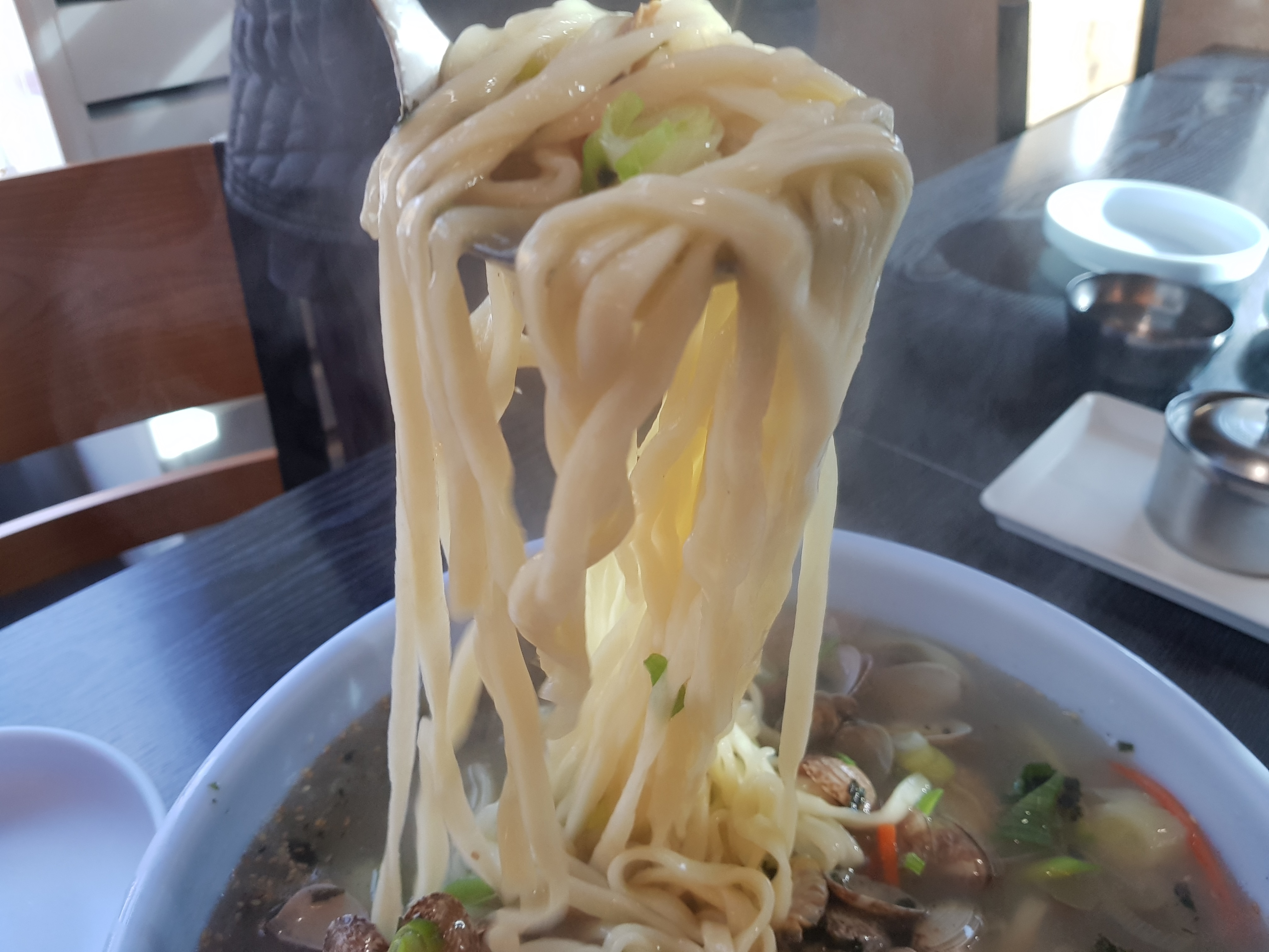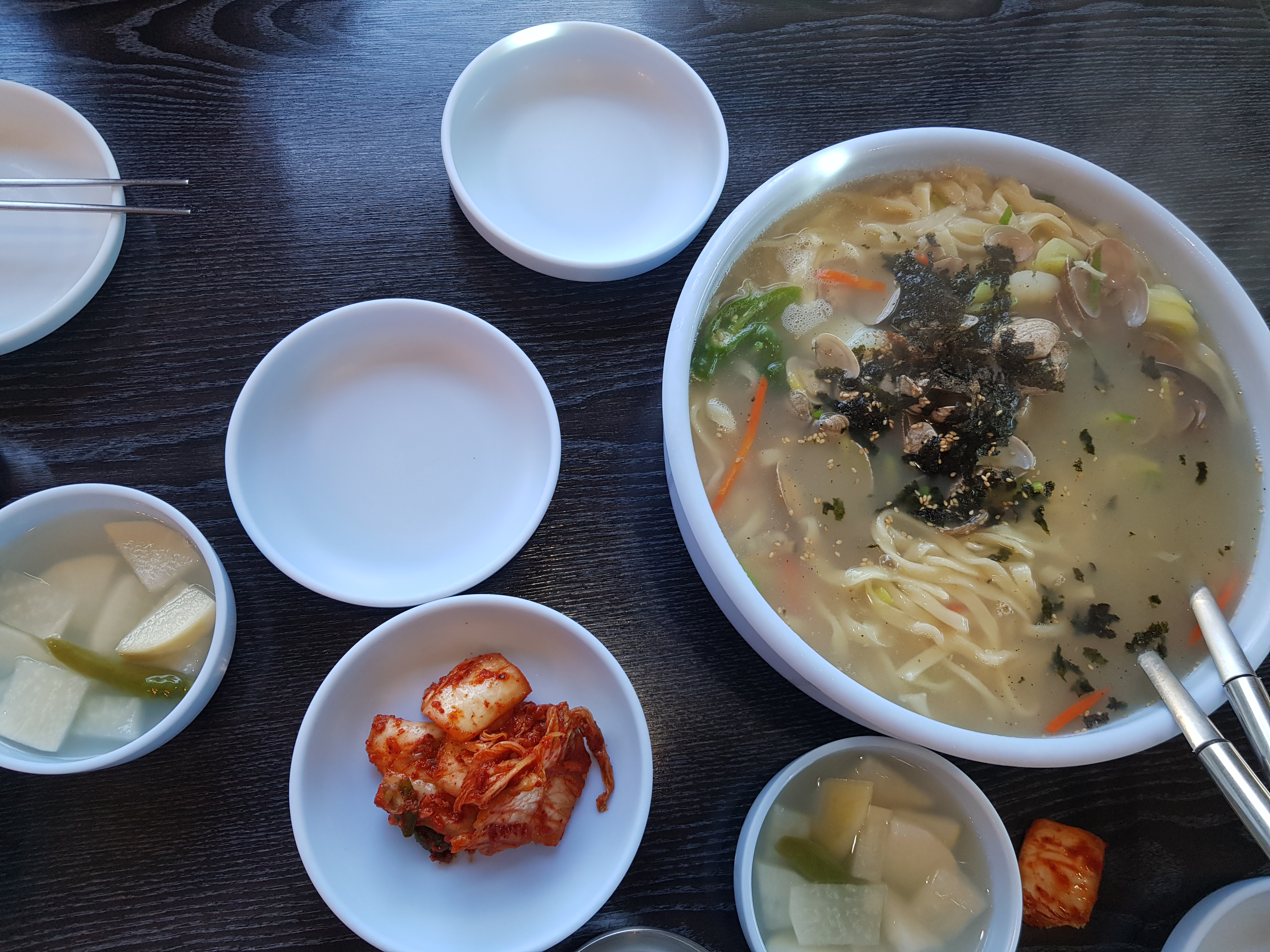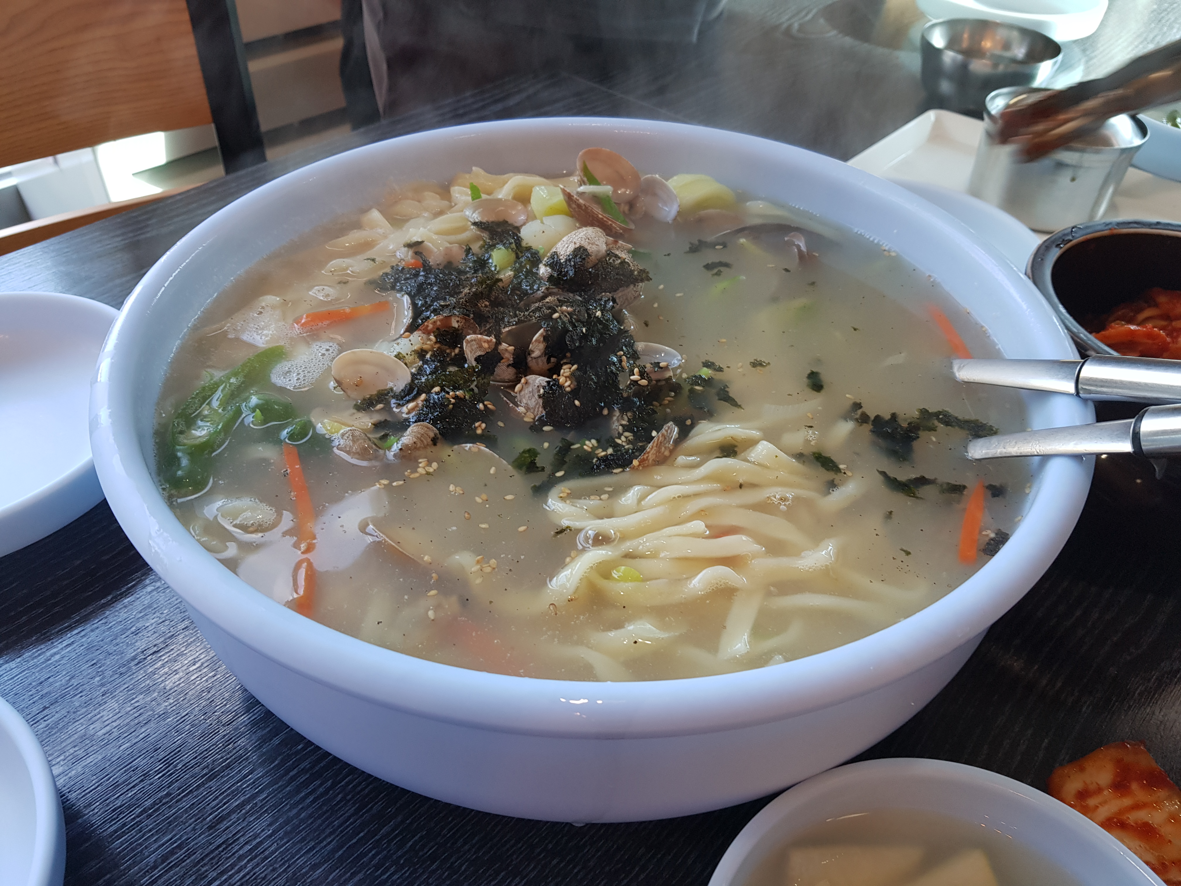 3인분 주문하면 4인이 먹을 수 있을 정도로 나오기 때문에 인원에 맞춰 주문하지 않아도 됩니다. 쉽게 면이 불지 않아 천천히 먹어도 될 정도로 면발이 좋앗습니다. 특이하게도 바지락 칼국수인데 김가루가 뿌려져 있습니다.