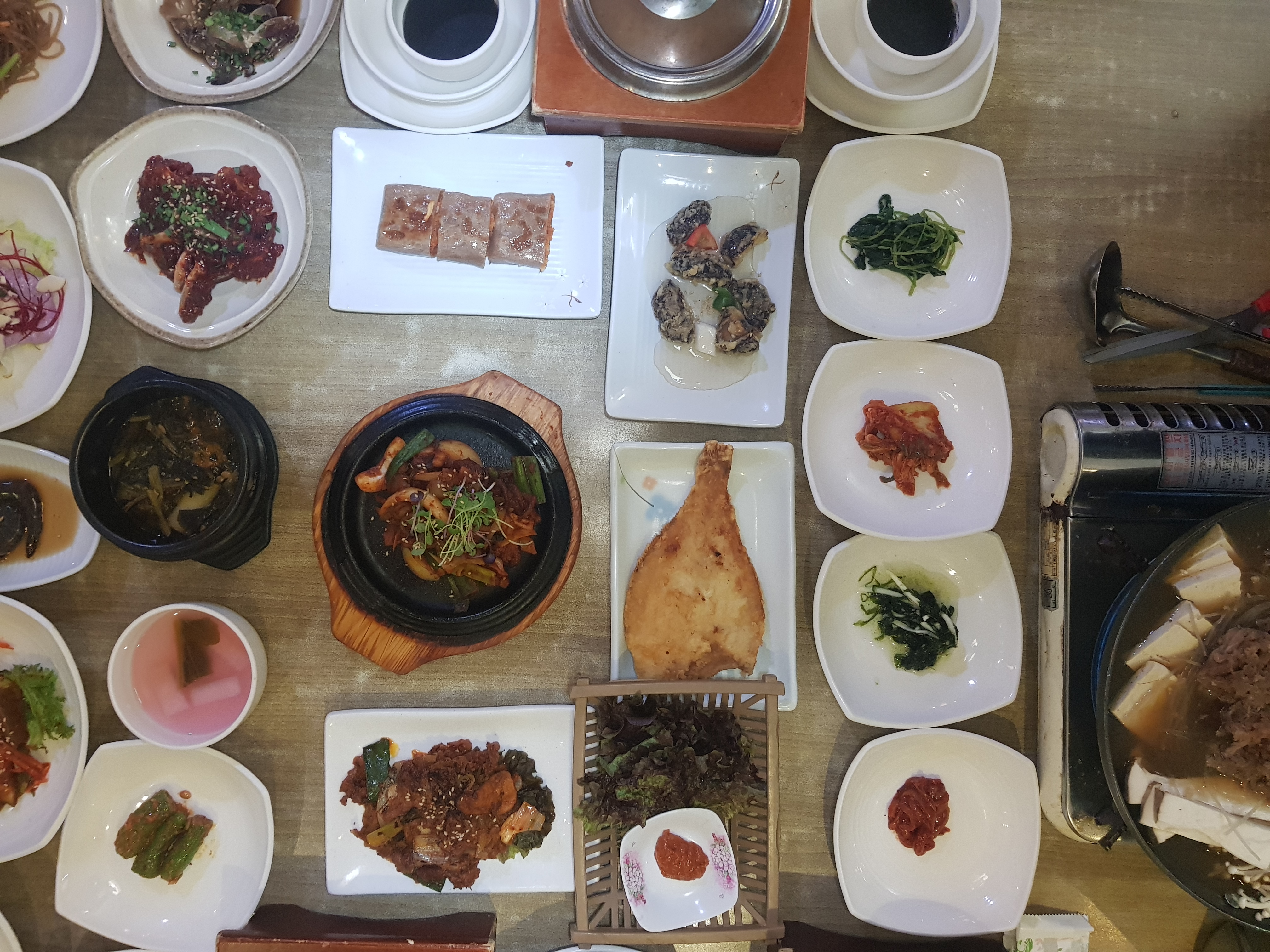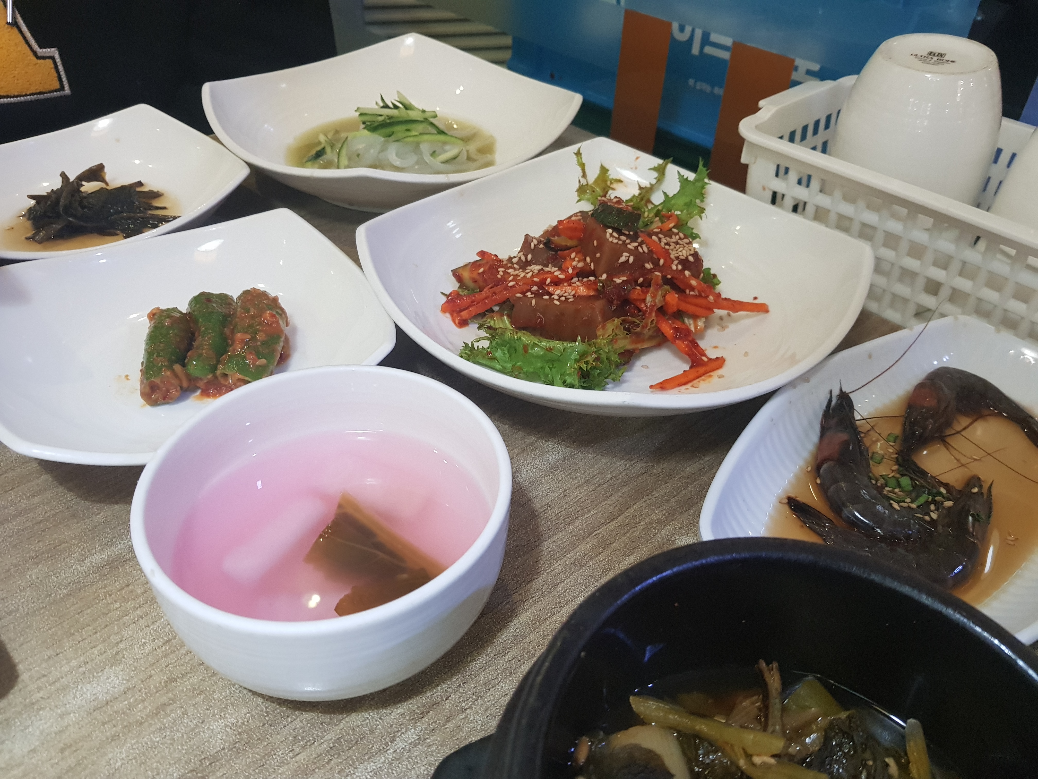 간장게장, 양념게장, 가자미구이, 메밀전병, 제육볶음, 간장새우, 버섯튀김, 불고기전골, 묵, 더덕구이, 샐러드, 흑미죽, 쌈, 오이김치, 젓갈, 해파리냉채, 동치미, 나물반찬, 돌솥밥, 강된장등 20여가지 나오는 것 같습니다. 아주 맛있는 느낌은 아니고 집밥과 비슷하면서 가짓수가 많은 밥상같은 느낌입니다.