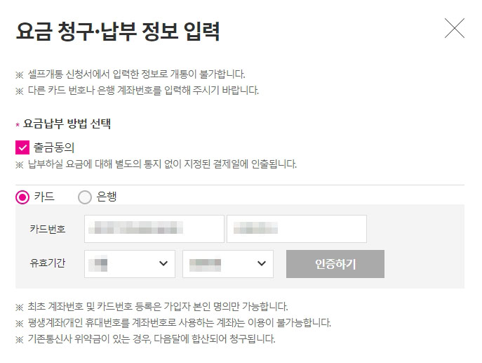 알뜰요금제 요금납부정보입력
