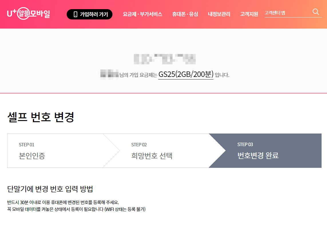 회원가입을 정상적으로 마치면 임의번호로 개통된 번호가 있고 그 번호로 인증을 받아야 하기때문에 개통된 휴대폰을 준비합니다. U+알뜰모바일에서는 [내정보관리>내정보변경>번호변경]으로 이동합니다.