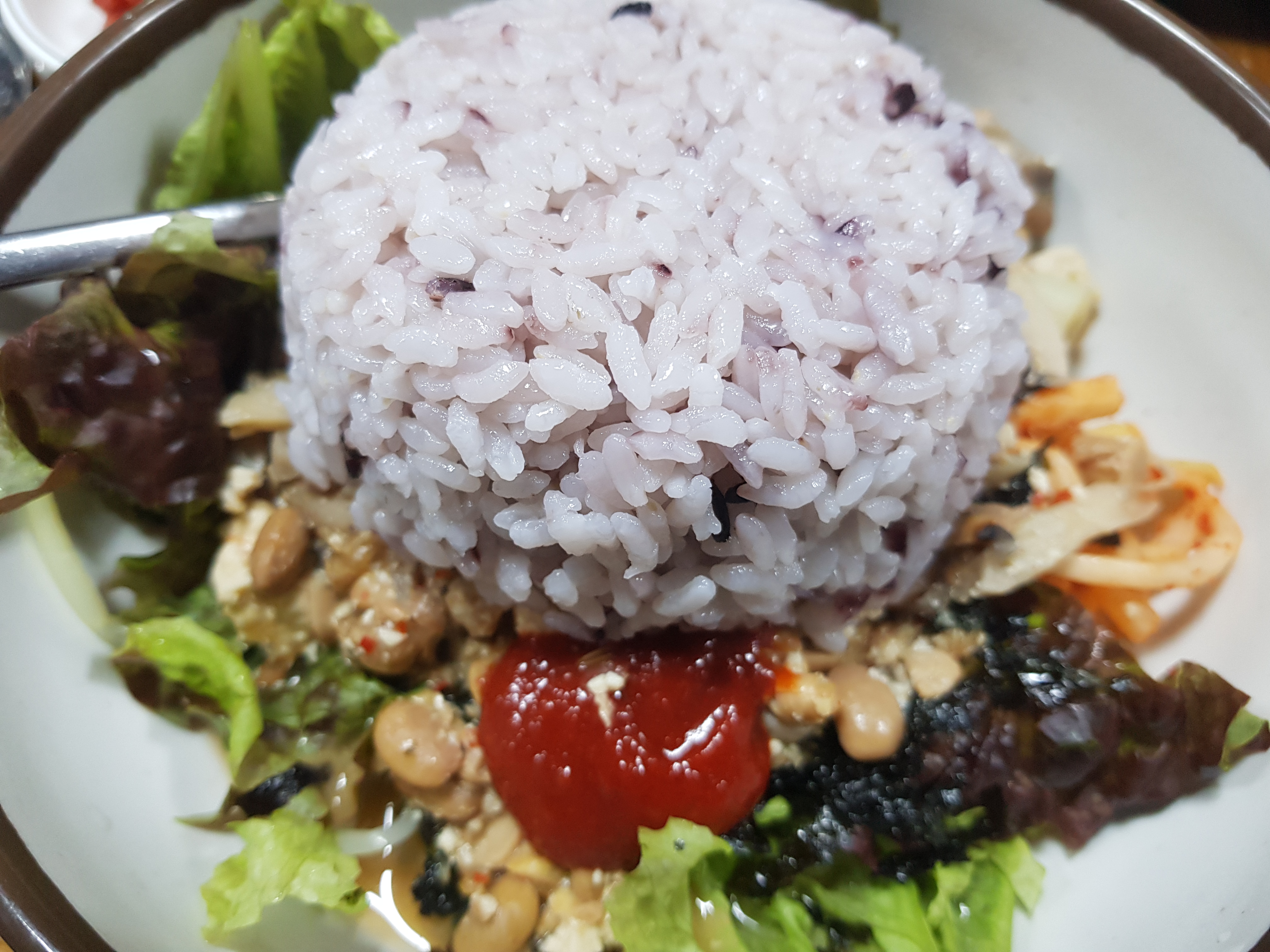 비빔나물이 따로 나오는데 청국장과 고추장을 넣으면 되는데 다 넣고 말씀해주셨습니다. 청국장 건더기를 많이 넣으라고 알려주셨는데 이미 국물을 많이 넣어 싱거웠습니다. 보고 가시는 분들은 청국장건더기를 많이 넣어주십시오. 참기름은 비빔나물에 들어가 있는 것 같습니다.