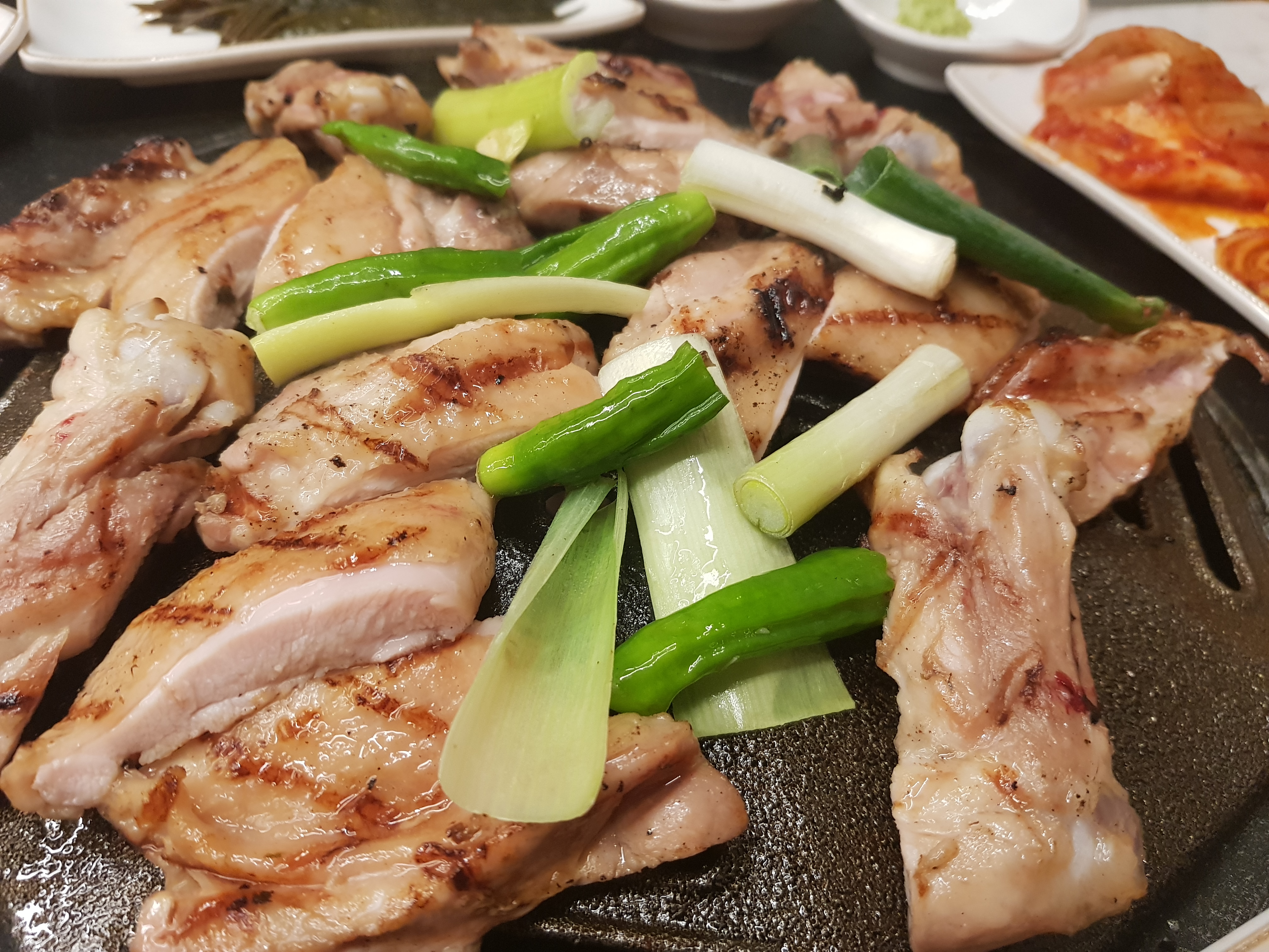 닭갈비가 초벌해서 나오는데 그동안 생김이 있는데 이걸 미리 구워놓습니다. 쌈대신 김으로 싸먹는 곳입니다. 초벌해서 나오다보니 약간 시간이 걸리는 편입니다. 김을 다먹고 또 달라고 했습니다. 김은 '무한리필~' 됩니다. 김을 타지 않게 굽고 나온 초벌구이된 닭갈비를 올려주고 직원이 대파와 꽈리고추를 더 올려줍니다.