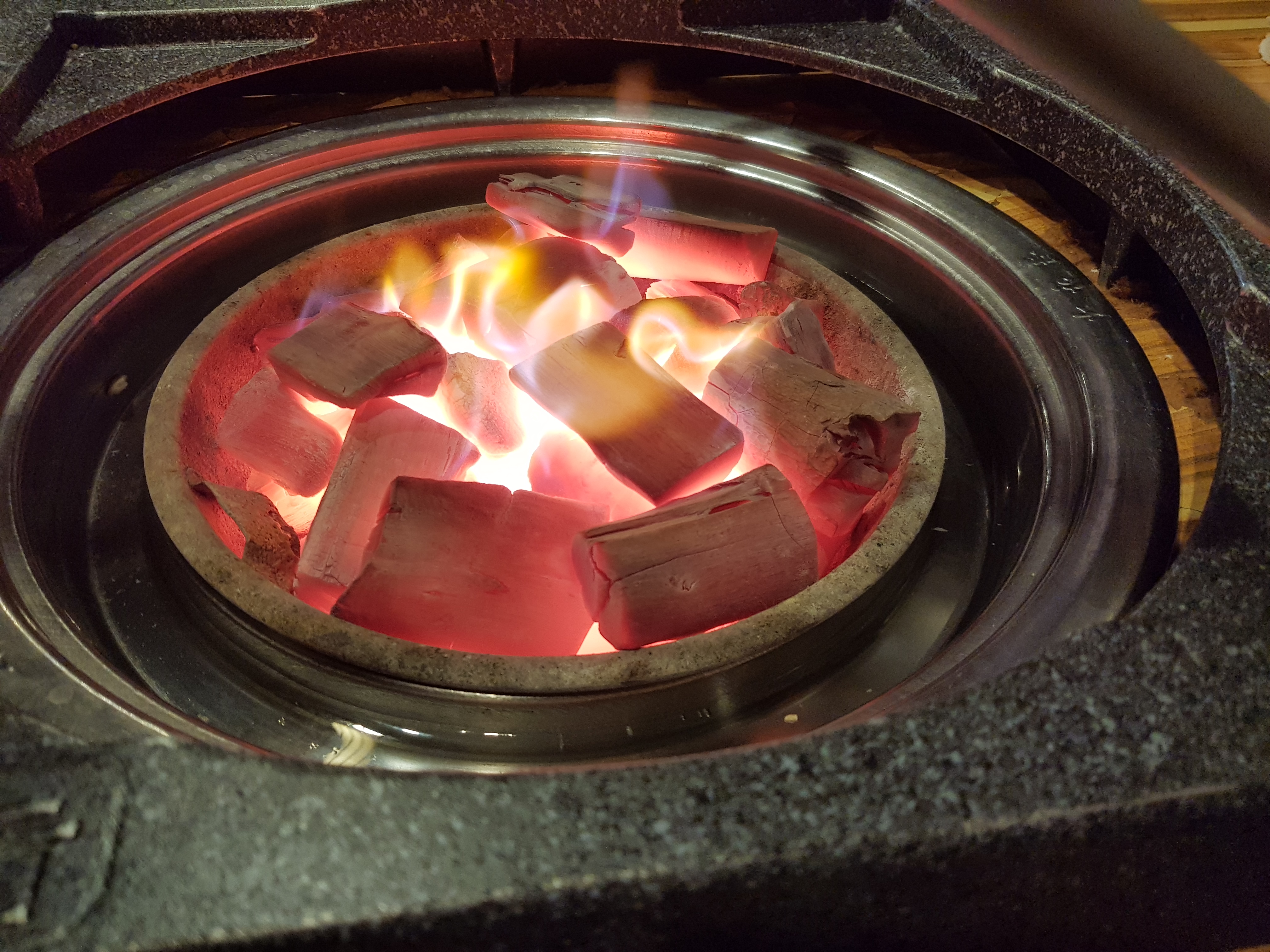 기본세팅이 되고 숯이 나오는데 숯불이 너무나 강해 사람은 물론 고기도 굽지 못하고 몇분뒤에 가장자리부터 고기를 놓고 구워먹어야 합니다. 숯불만 봐도 역시 잘 왔다라는 생각이 들정도로 숯이 예쁩니다.