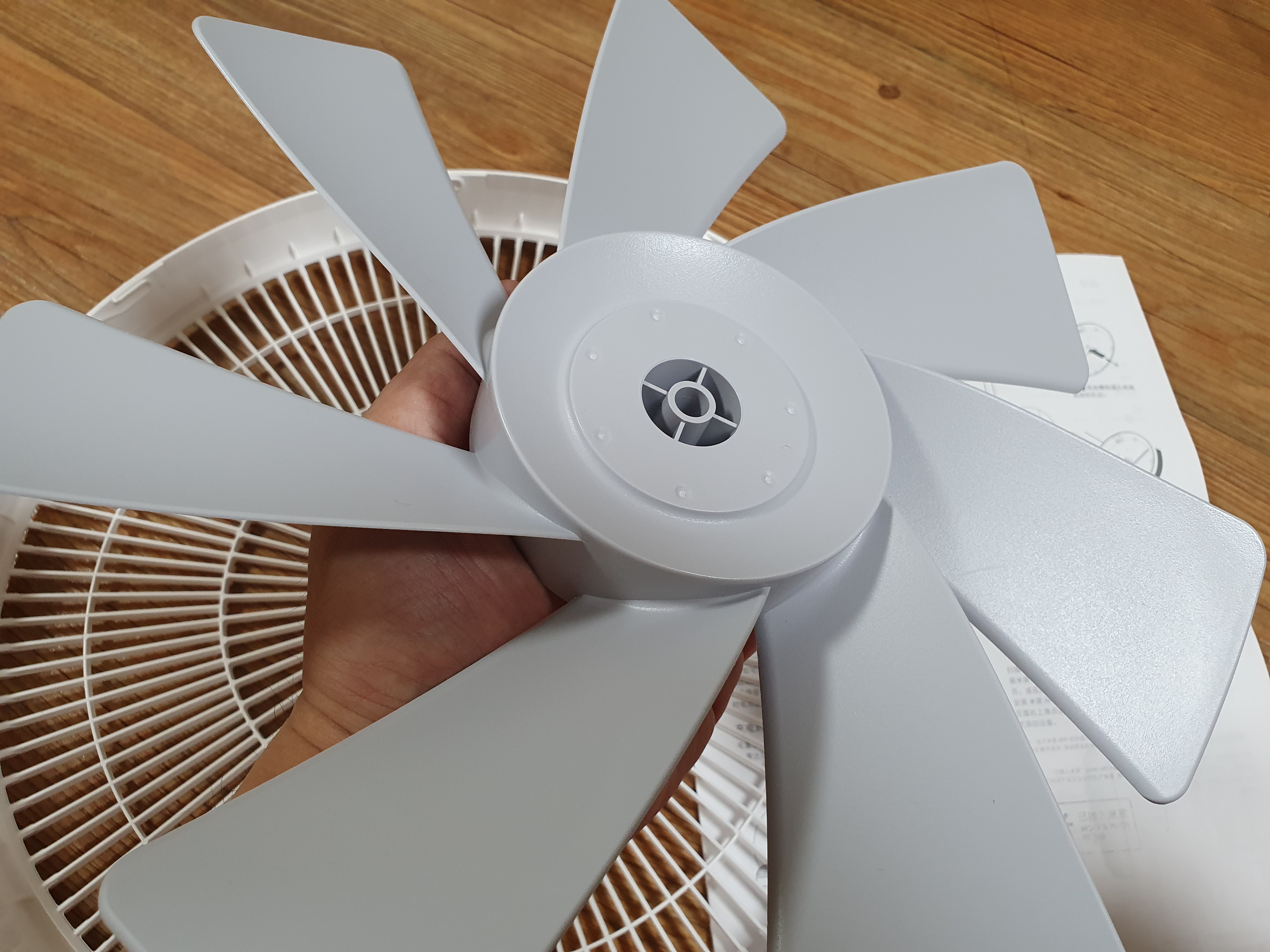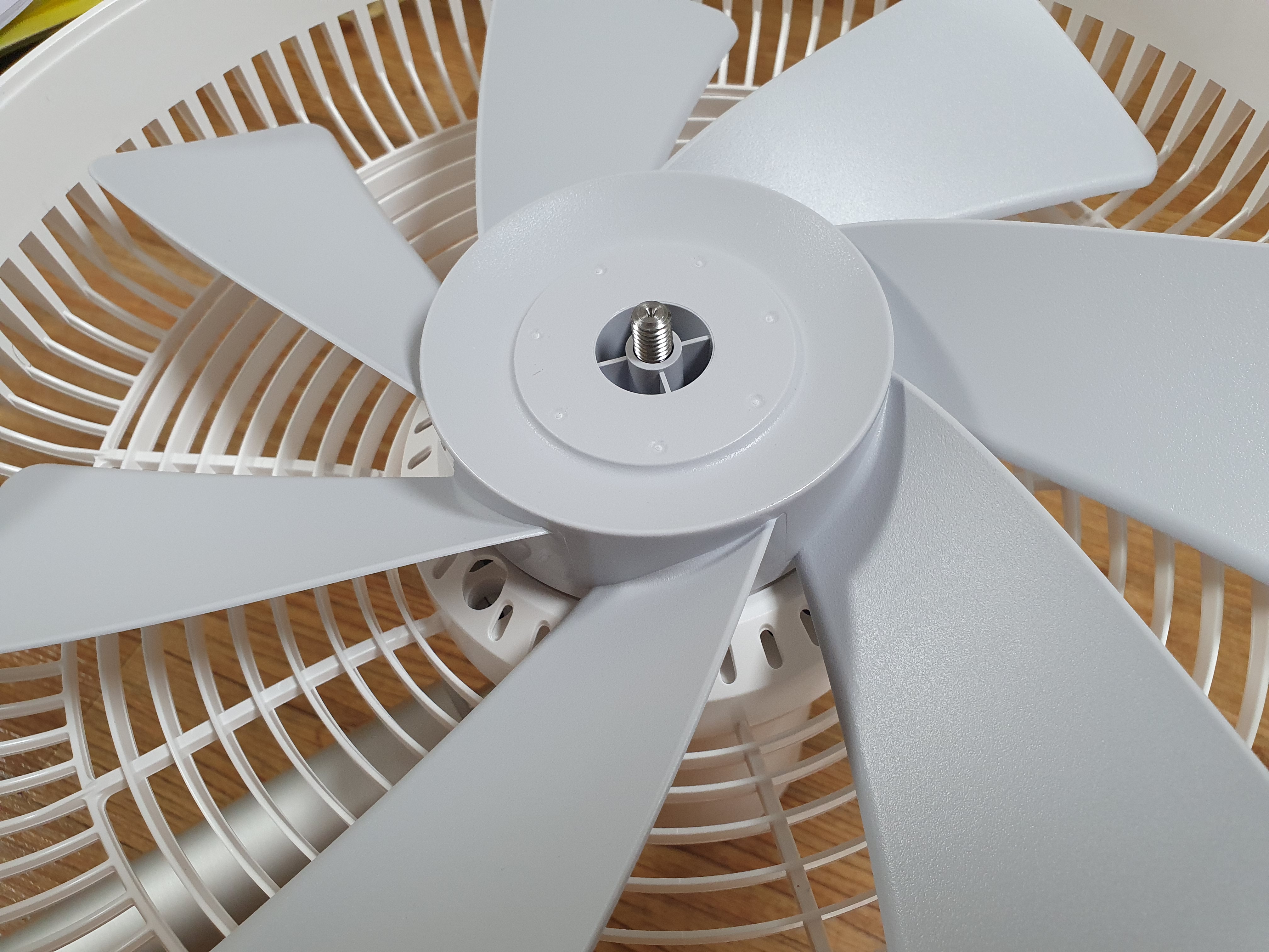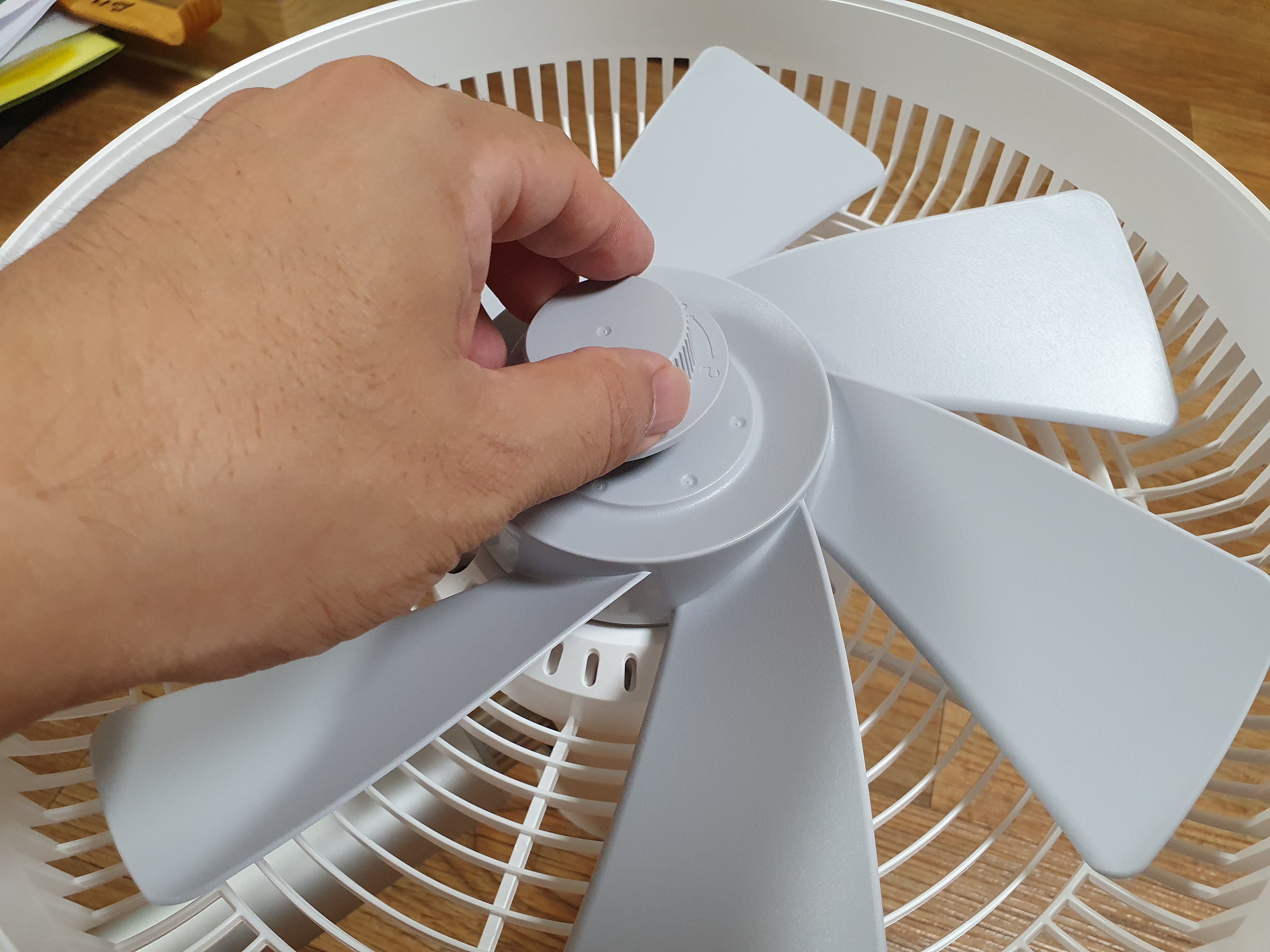 선풍기 날개와 겉망이 같이 조립되어 있는데 쉽게 풀 수 있습니다. 선풍기는 7엽팬으로 기존 AC선풍기에 비해 팬크기가 3인치 이상 줄어든 느낌입니다. 우선은 날개를 빼고 맨뒤에 있는 안전망을 모터부분을 껴줍니다.