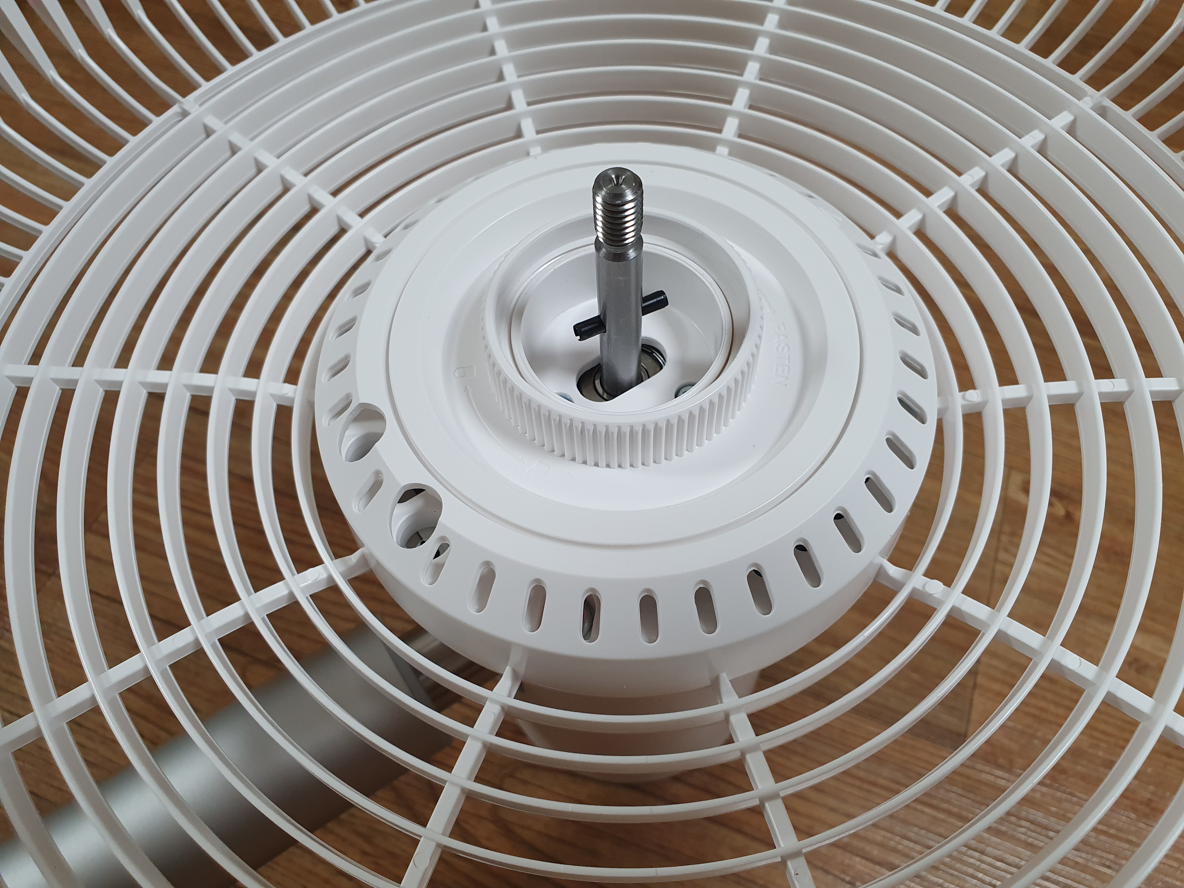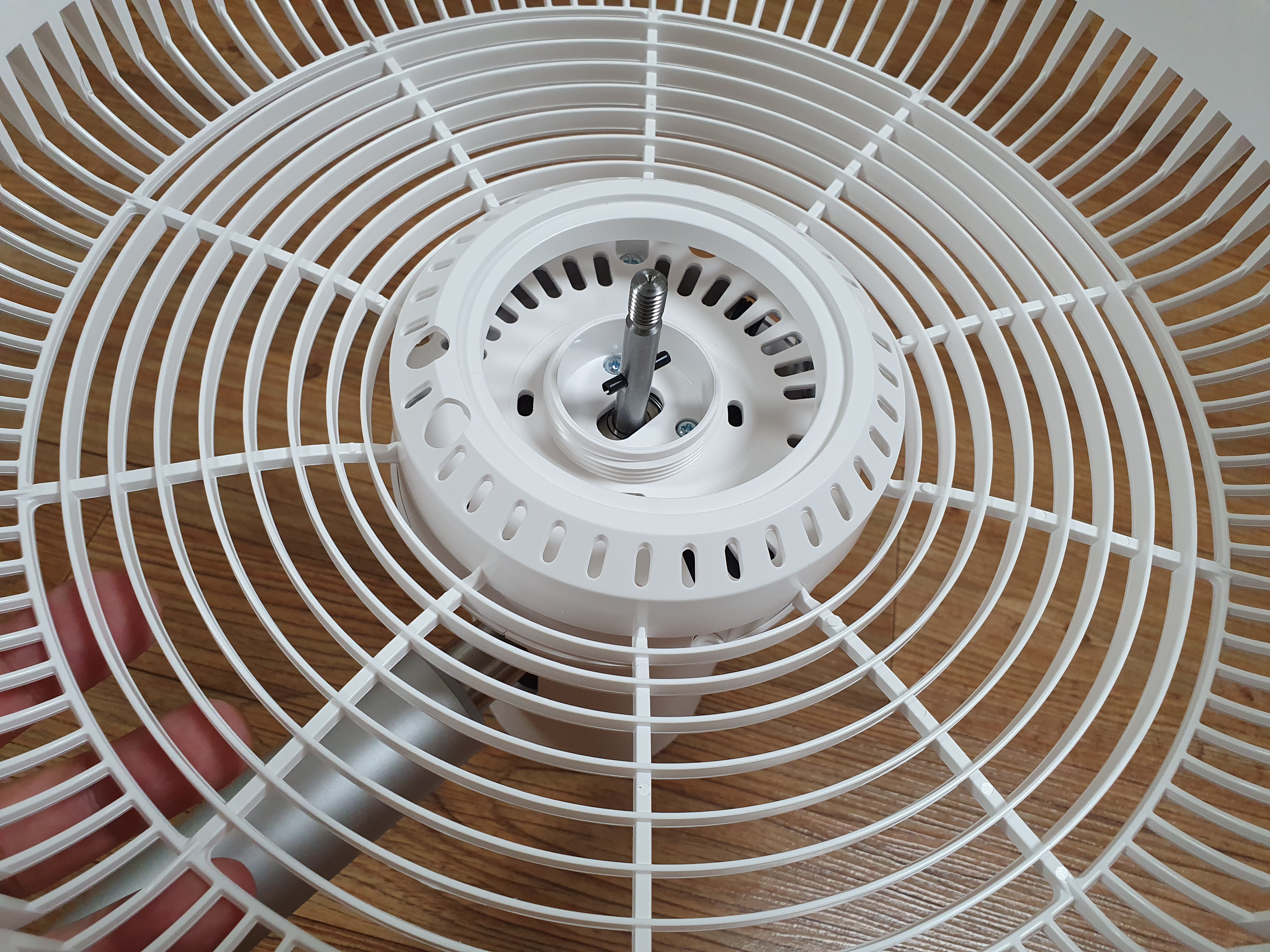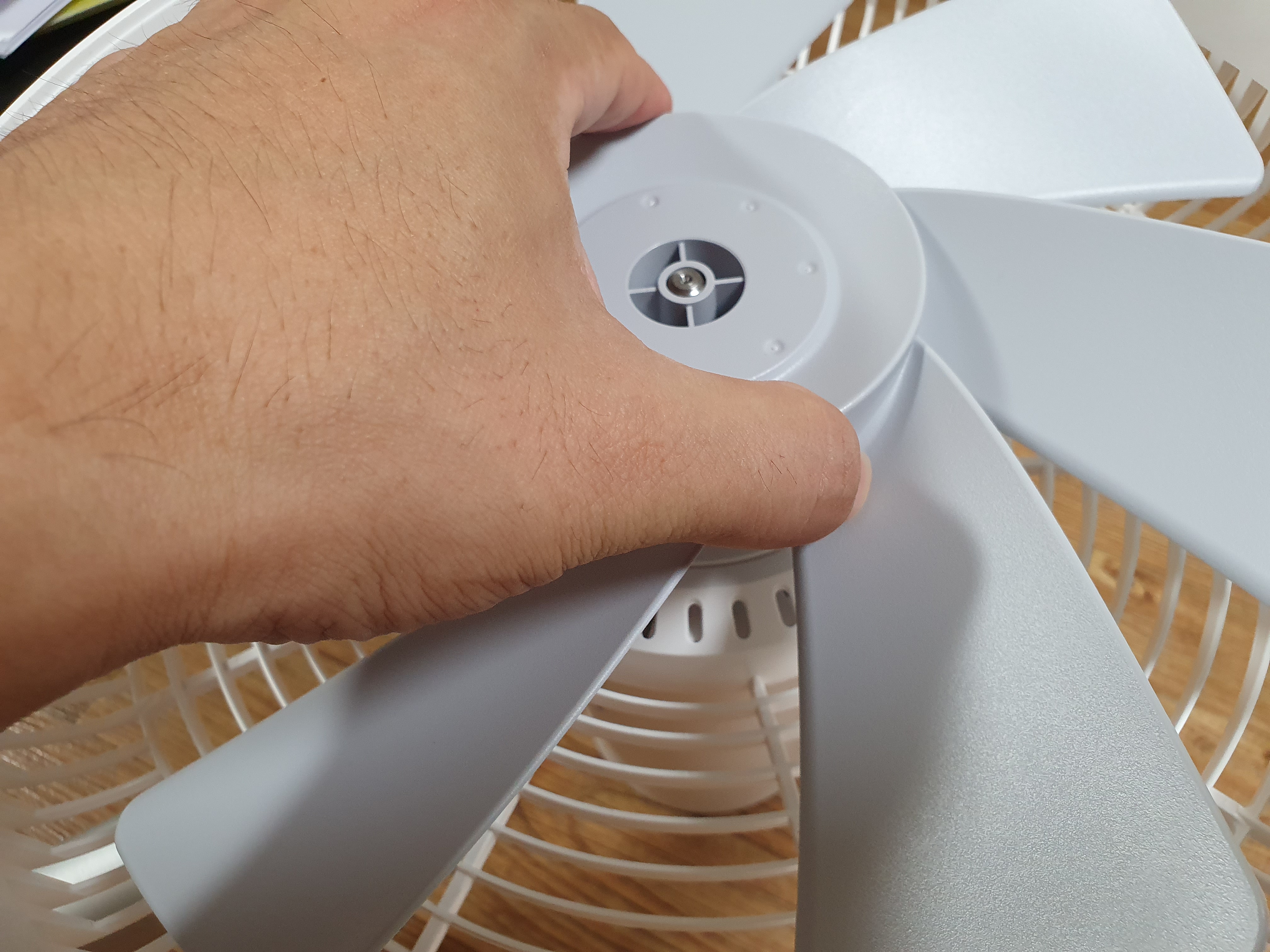 선풍기 날개와 겉망이 같이 조립되어 있는데 쉽게 풀 수 있습니다. 선풍기는 7엽팬으로 기존 AC선풍기에 비해 팬크기가 3인치 이상 줄어든 느낌입니다. 우선은 날개를 빼고 맨뒤에 있는 안전망을 모터부분을 껴줍니다.