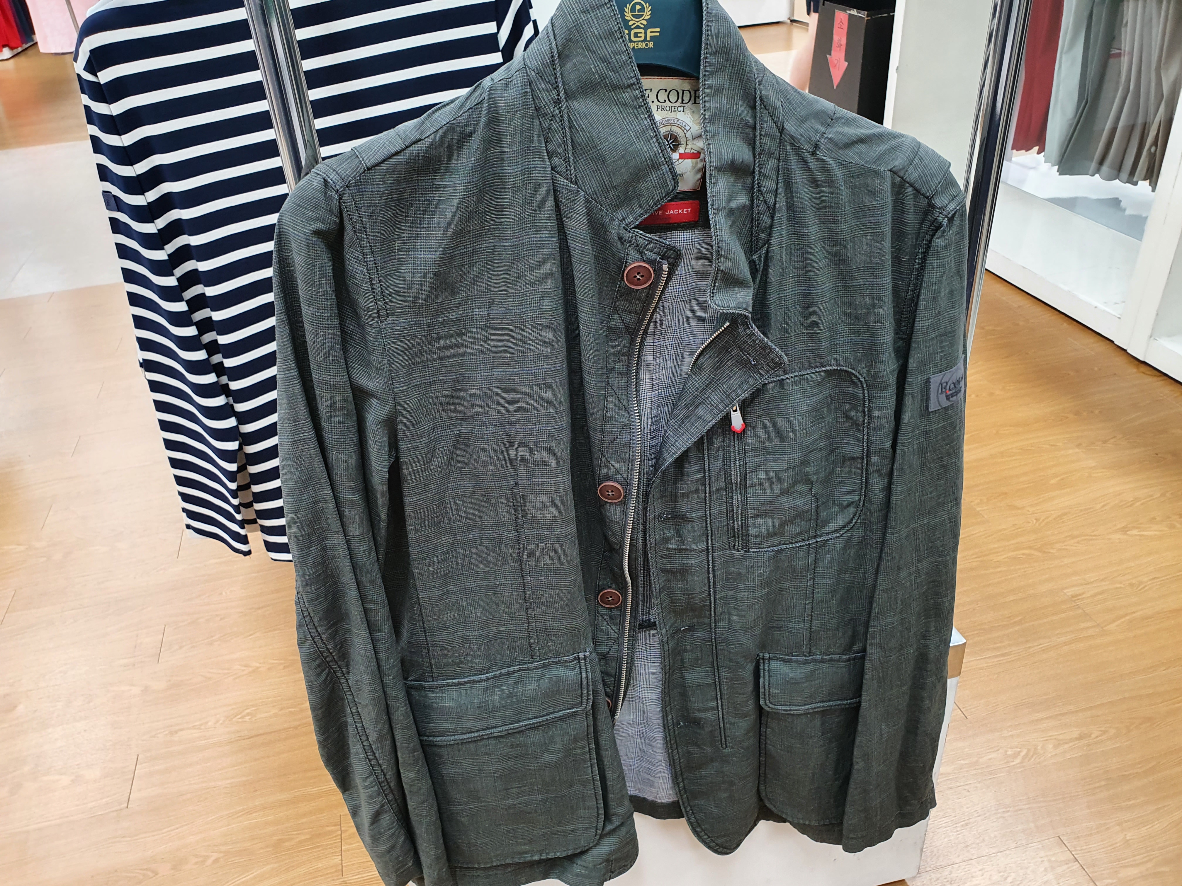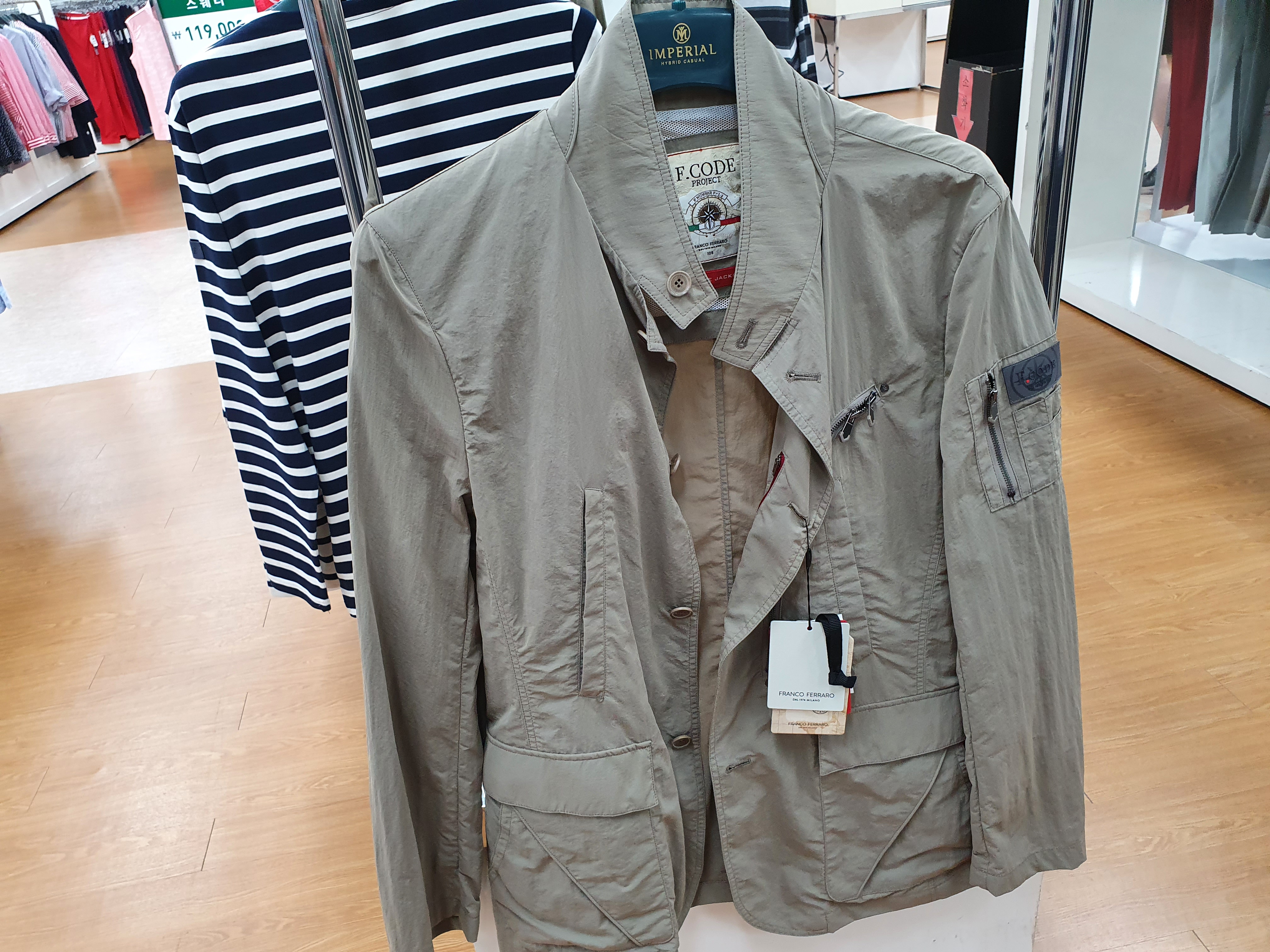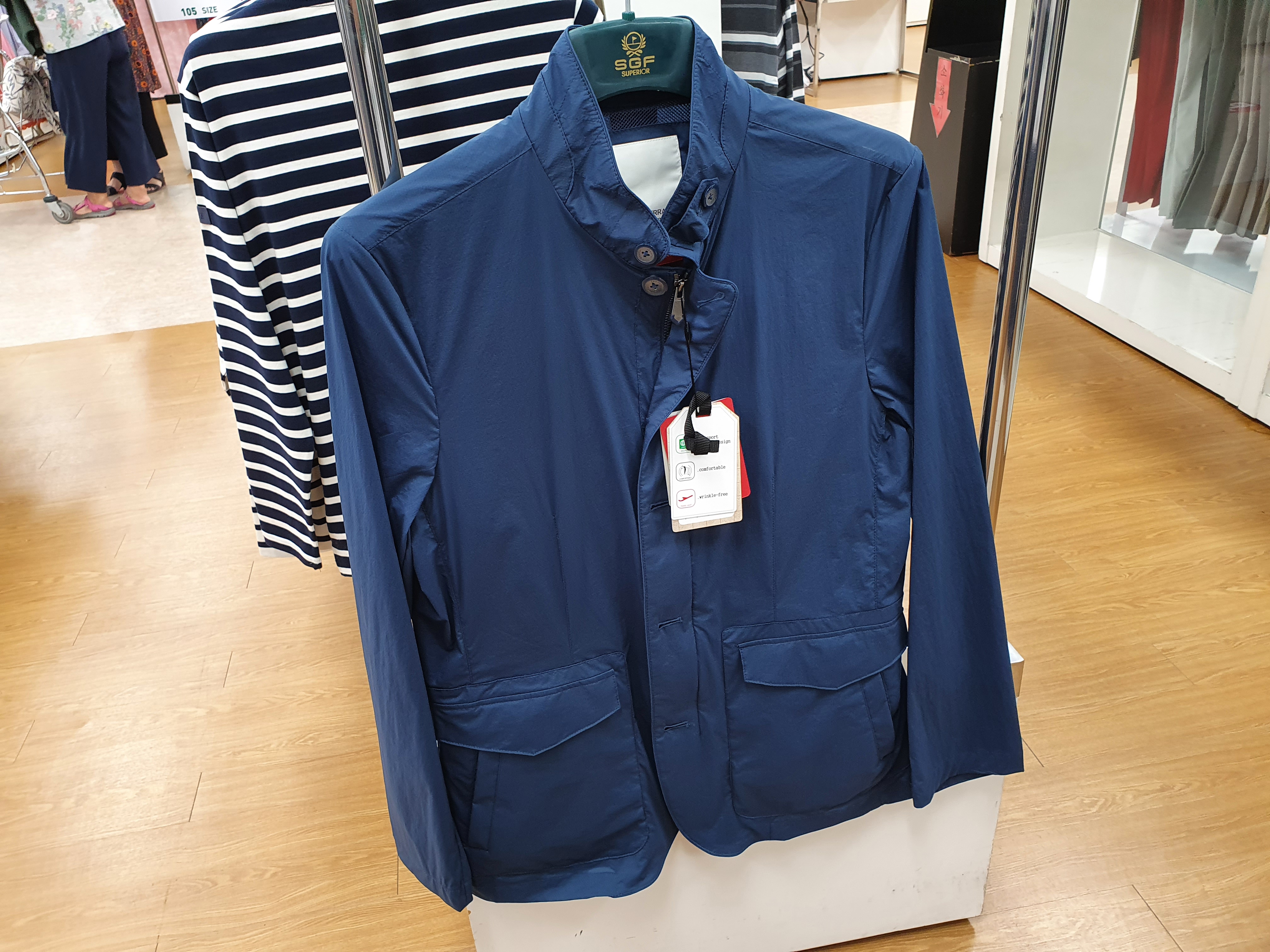 자켓, 점퍼들이 있는데 자켓도 50%행사가 들어가는 모델들이 있습니다. 소재는 매우 시원한 마소재로 보입니다. 정장자켓스타일은 10만원 미만이고 할인하면 더 떨어집니다. 여름이지만 가을자켓들도 어느정도 있었습니다.