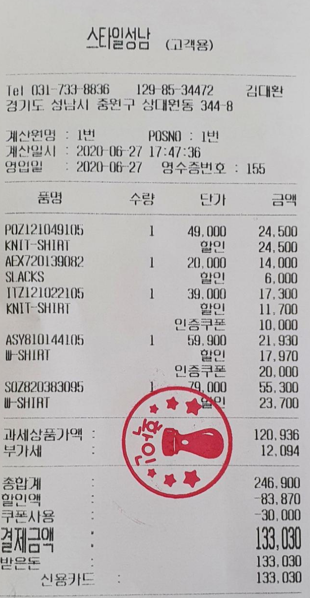 이렇게 5벌을 구매했는데 할인혜택이 매우 많아 즐거운 쇼핑이였습니다. 이곳에서 쇼핑을 하고 이배재로 넘어가면 또 맛집들이 있으니 맛집 투어를 해도 좋은 나들이 코스입니다. 빨리 방문해보세요~~