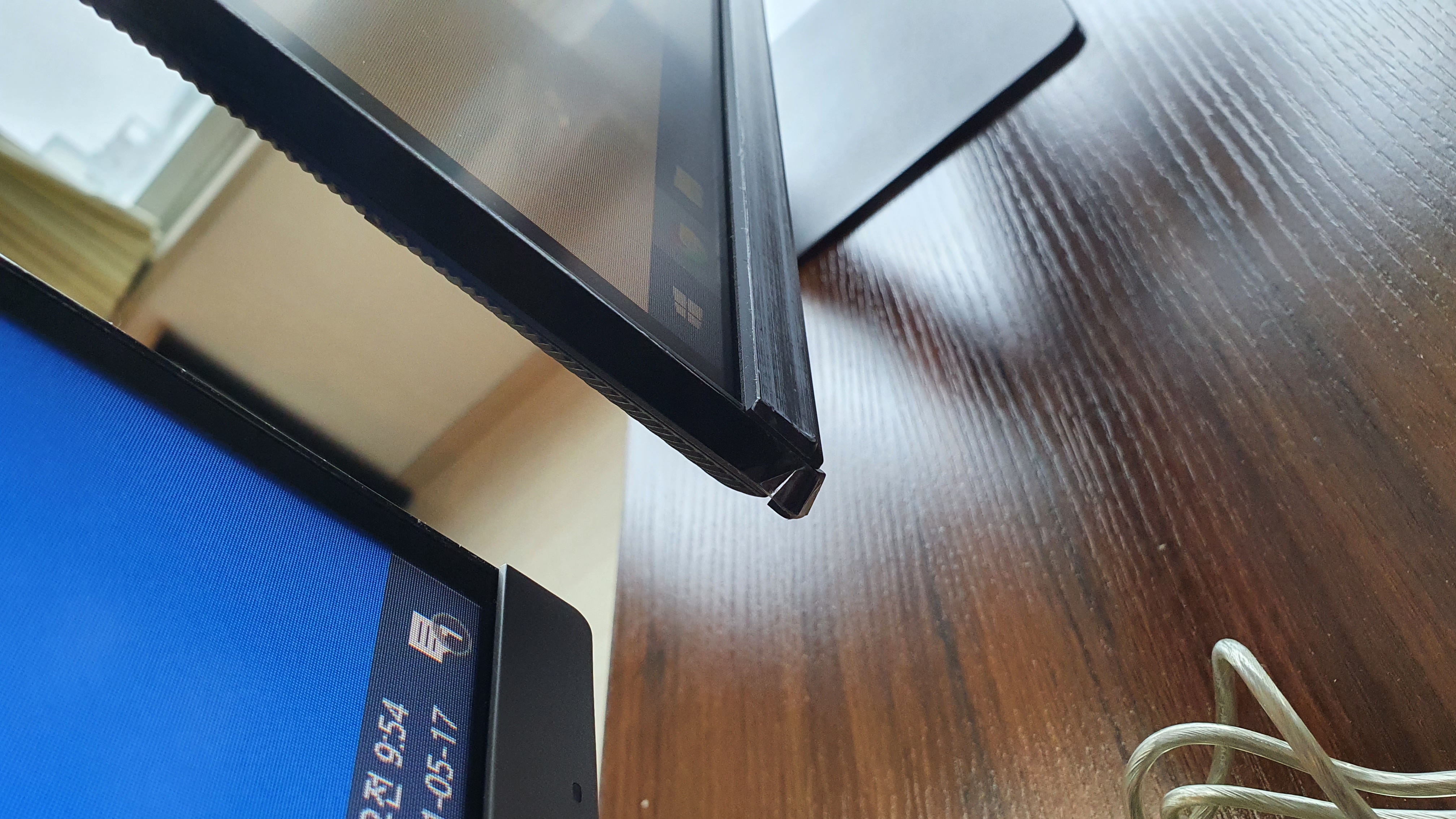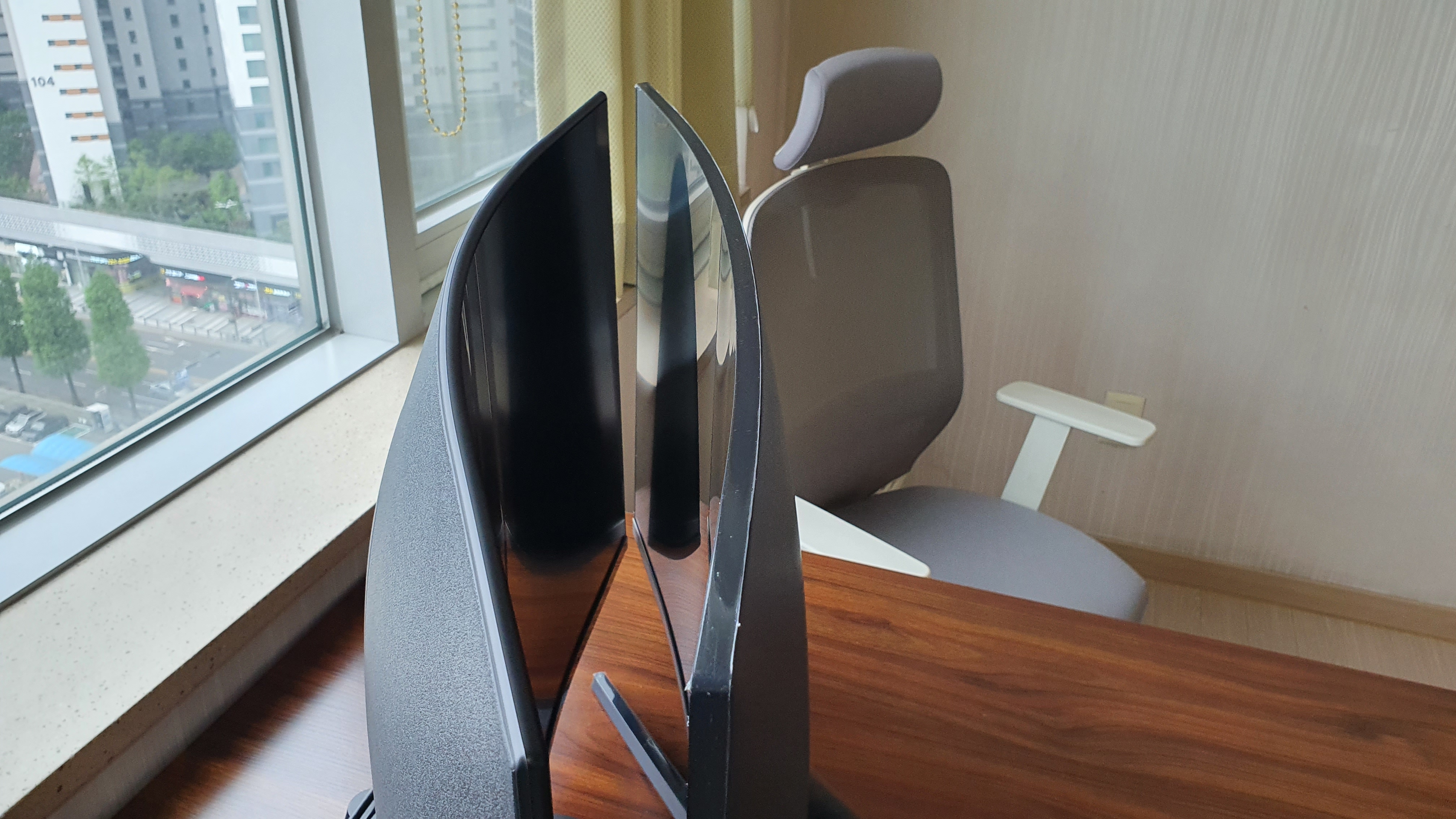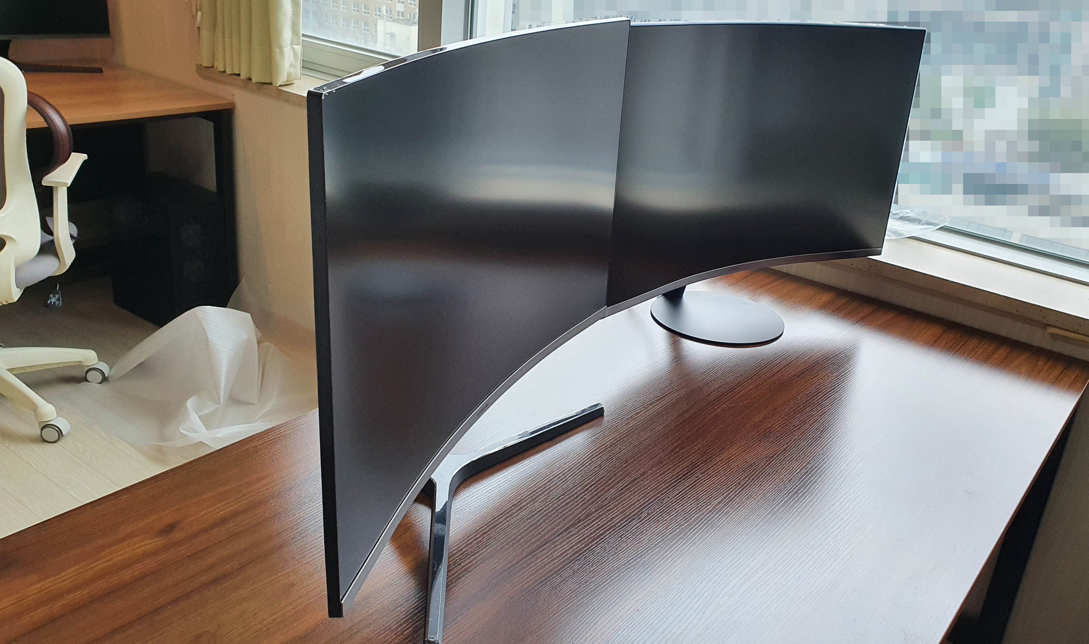 모니터 2대를 곡선대로 붙이니 모니터 뒷쪽에 공간이 너무 크게 생겨 양쪽에 모니터를 놓고 양쪽에서 써야되나 싶을정도입니다. 이런 제품이다보니 상세페이지에 설명이 제대로 할 수 없었던 모니터입니다. 반품할 기회가 된다면 반품하고 싶은 모니터입니다.