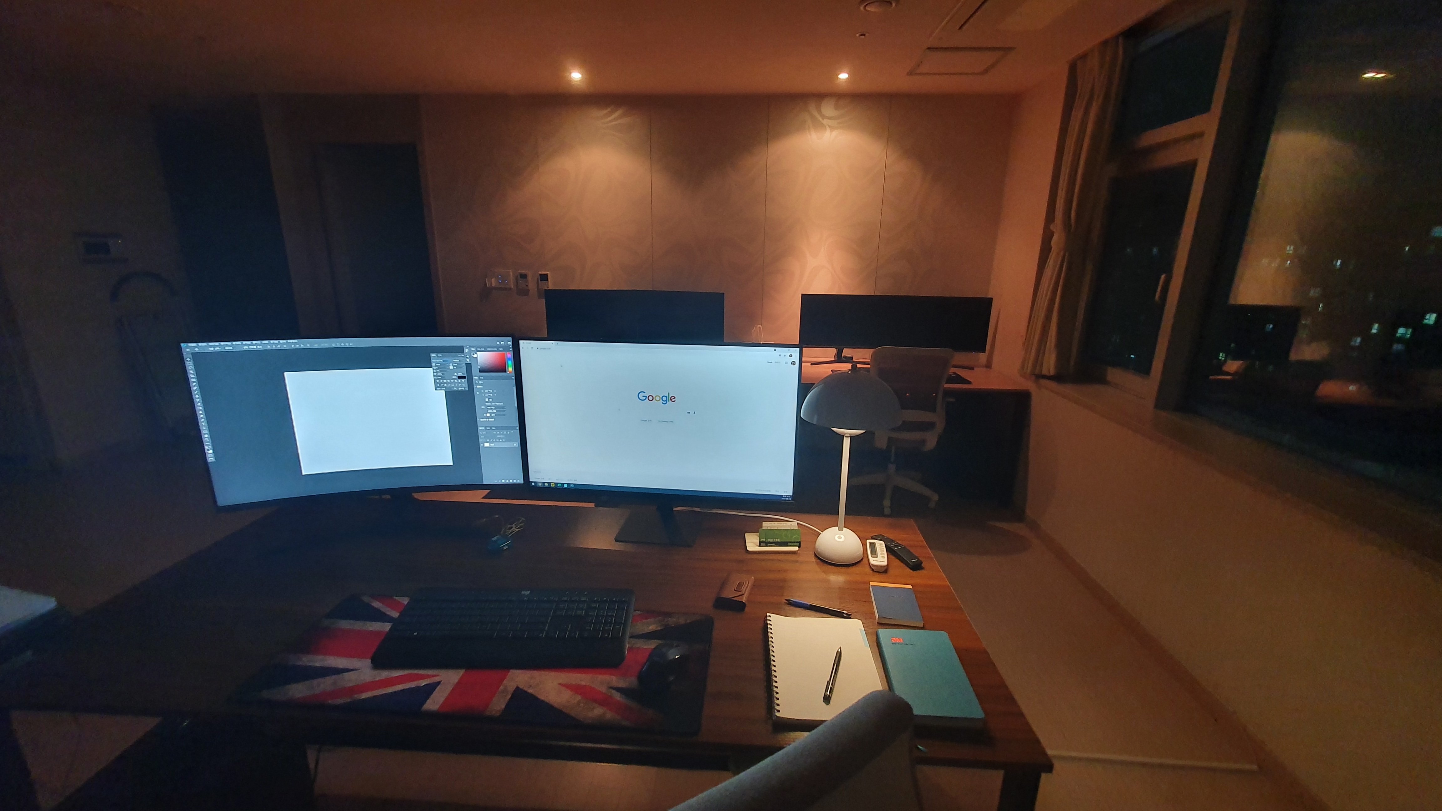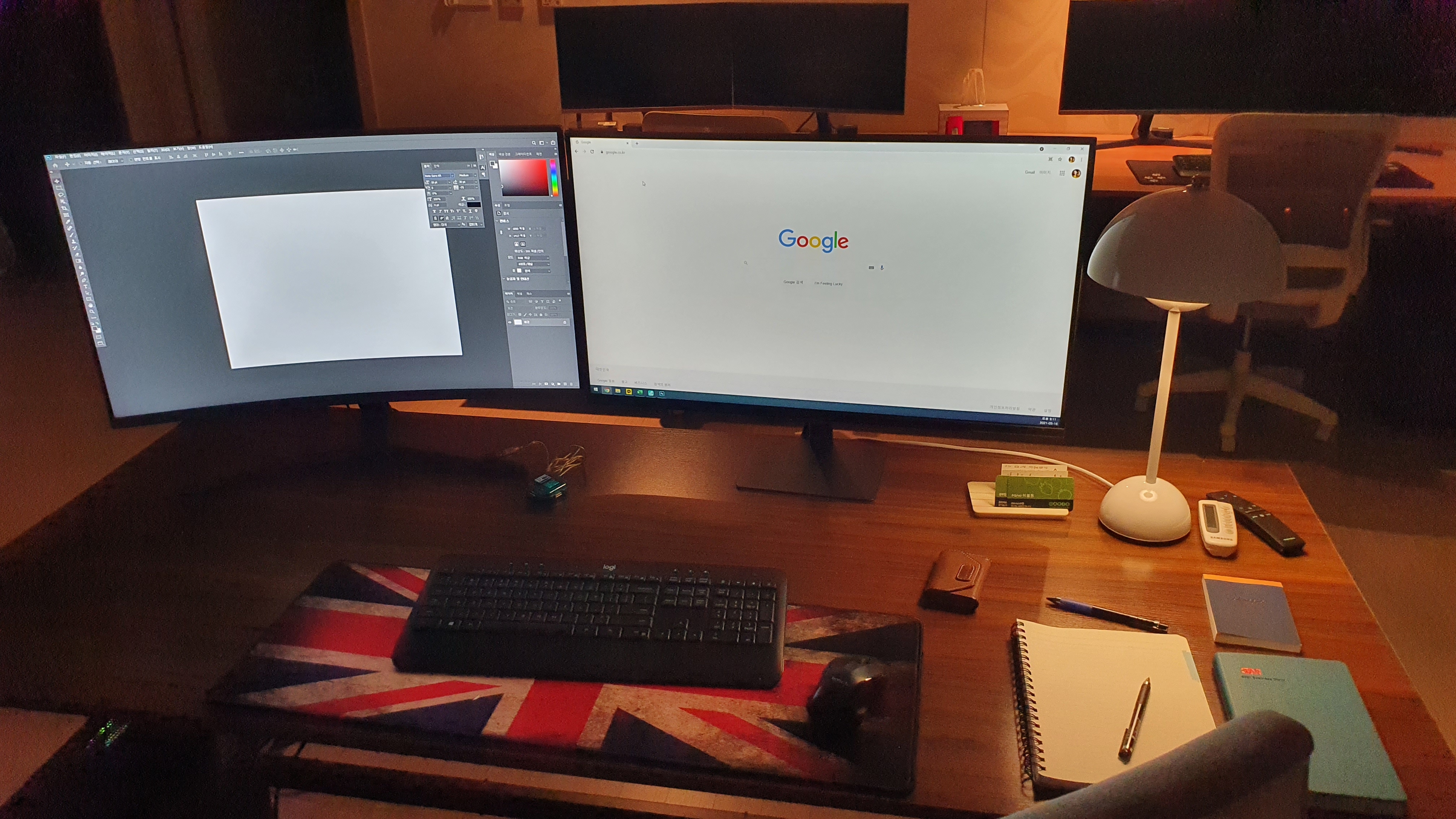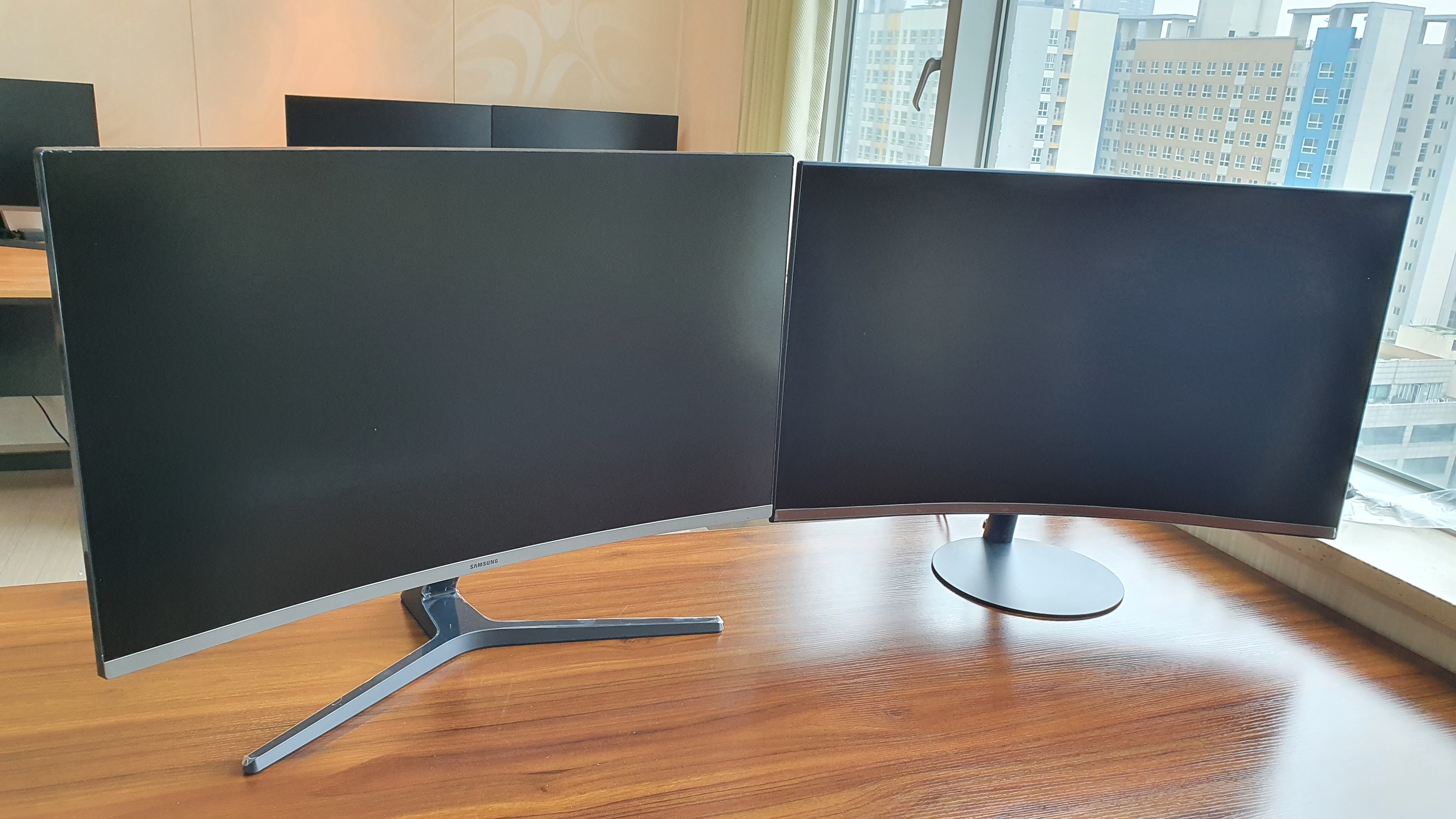 모니터 2대를 곡선대로 붙이니 모니터 뒷쪽에 공간이 너무 크게 생겨 양쪽에 모니터를 놓고 양쪽에서 써야되나 싶을정도입니다. 이런 제품이다보니 상세페이지에 설명이 제대로 할 수 없었던 모니터입니다. 반품할 기회가 된다면 반품하고 싶은 모니터입니다.