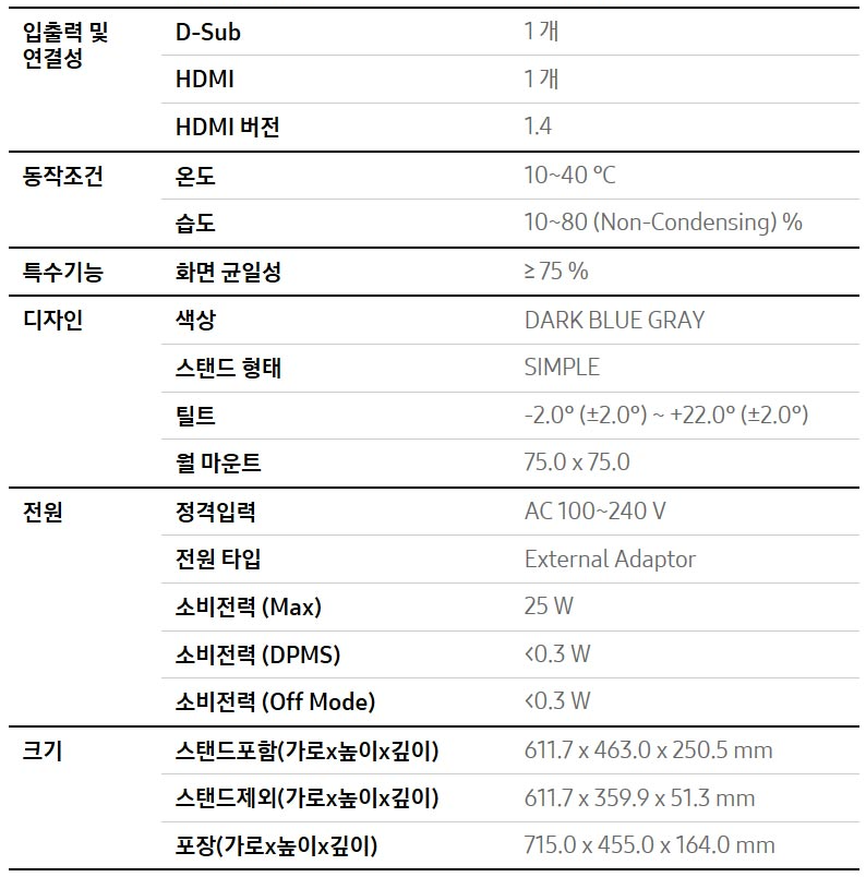 사무용으로 쓰기에 가장 좋은 사이즈로 보여집니다. 디자인이나 색감도 뛰어나고 가격적으로 괜찮았습니다. 설치도 어렵지 않았고 제품의 품질도 좋았습니다. 아쉬운 점은 입력단자가 RGV(VGA)단자와 HDMI로 되어 있어 듀얼모니터 사용시 한대의 모니터에는 젠더를 사용해된다는게 아쉬운 점입니다. 요즘 나오는 그래픽카드는 DVI, DP, HDMI로 되어 있기에 한대는 HDMI TO RGV 케이블을 별도로 준비하여 연결을 마무리 할 수 있었습니다. 듀얼사용시 미리 케이블을 구매하세요.