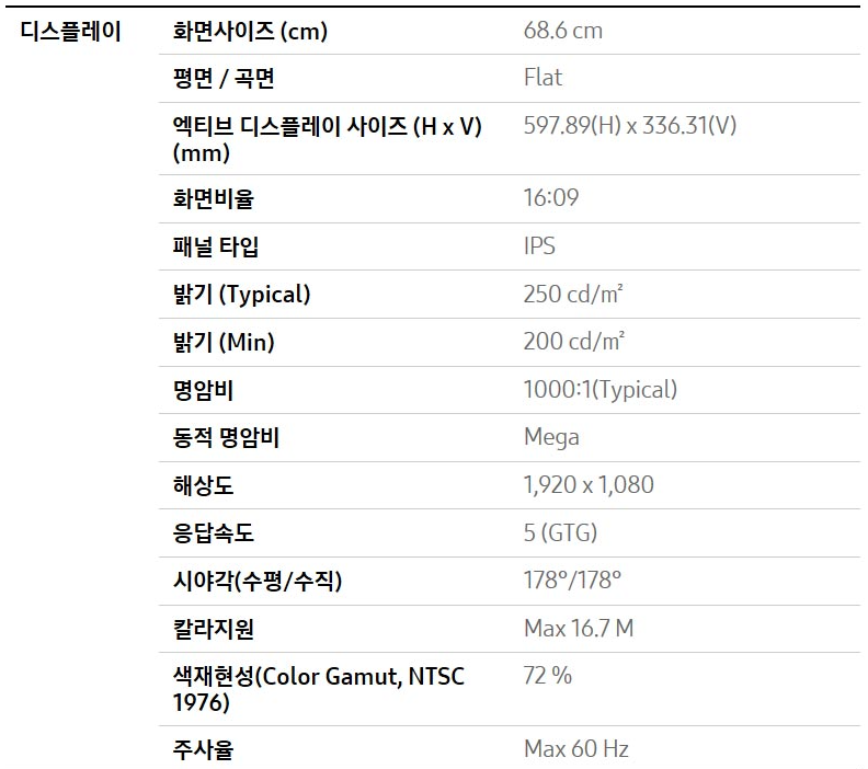 책상은 가로 1,600mm 사이즈에 27인치가 보기에 가장 편했습니다. 큰 고민없이 어디에나 적당한 모니터로 보입니다. 얇은 베젤과 Y형스탠드로 디자인이 좋고 가격도 적당합니다. 디자인, 사무용으로 사용하게 문제가 없을 것으로 보여지는 모니터였습니다. 커브보다는 평면이 좋았습니다.