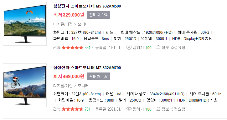 34인치 모니터를 구매할려고 했는데 품절이 발생하여 스마트모니터를 구매했습니다. 출시한지 얼마되지 않은 모니터로 네이버에서 라이브방송할때 구매를 하여 사용하고 있어 만족하고 있어 이것으로 구매했습니다. 32인치 스마트모니터에도 모델명에 차이가 있는데 M5 S32AV500와 M7 S32AV700의 차이는 해상도로 보여집니다.