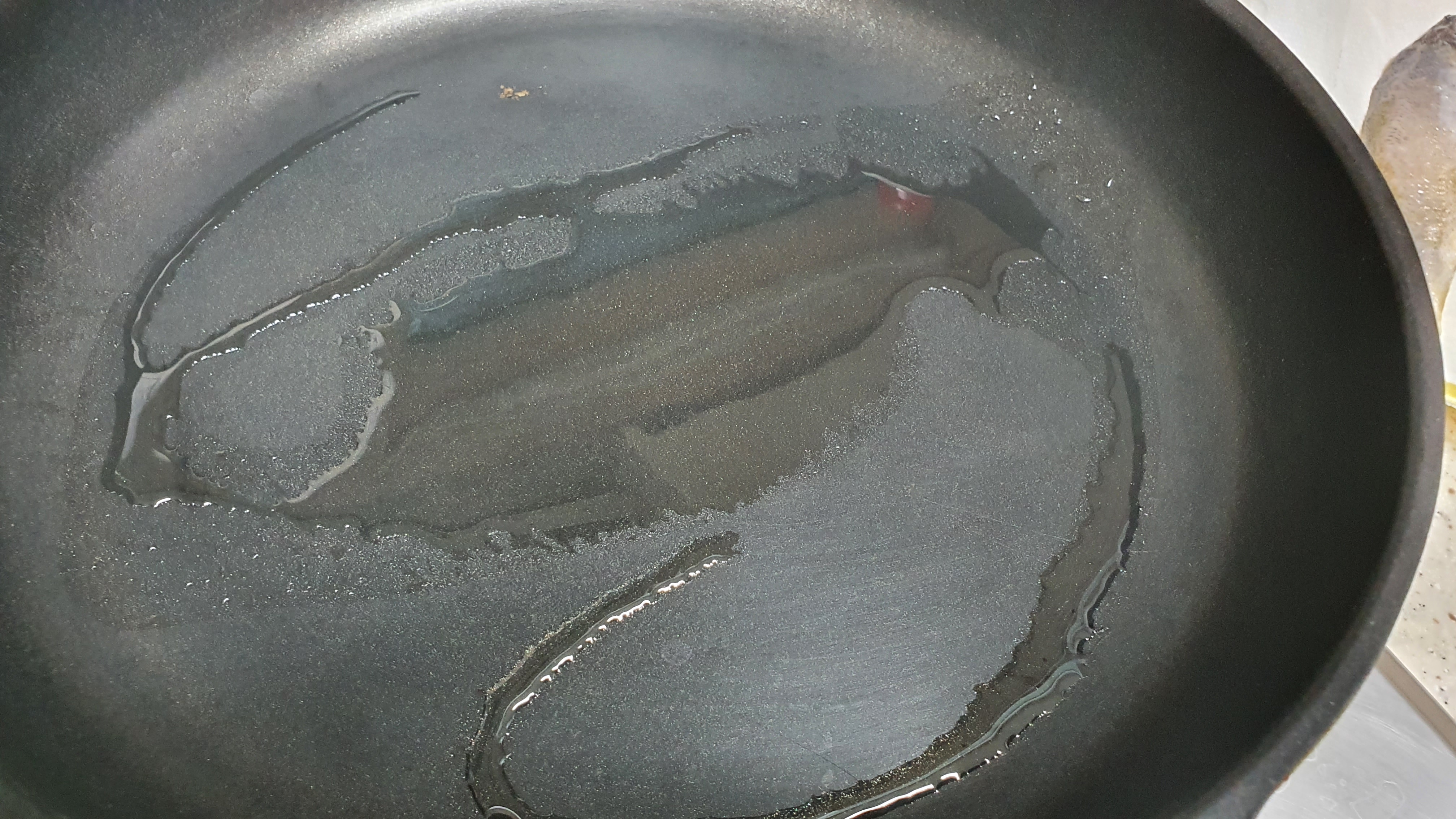 식용유를 많이 넣게 되면 기름이 많이 튈 수 있으니 기름을 조금만 넣어주세요. 굴비에서도 기름이 나오니 기름을 많이 나오니 조금만 넣어야 됩니다. 예열확인은 팬에서 기름이 타기 시작하여 연기가 살짝 피어오르면 충분히 예열이 된 상태입니다. 이때 굴비를 천천히 올려주세요.