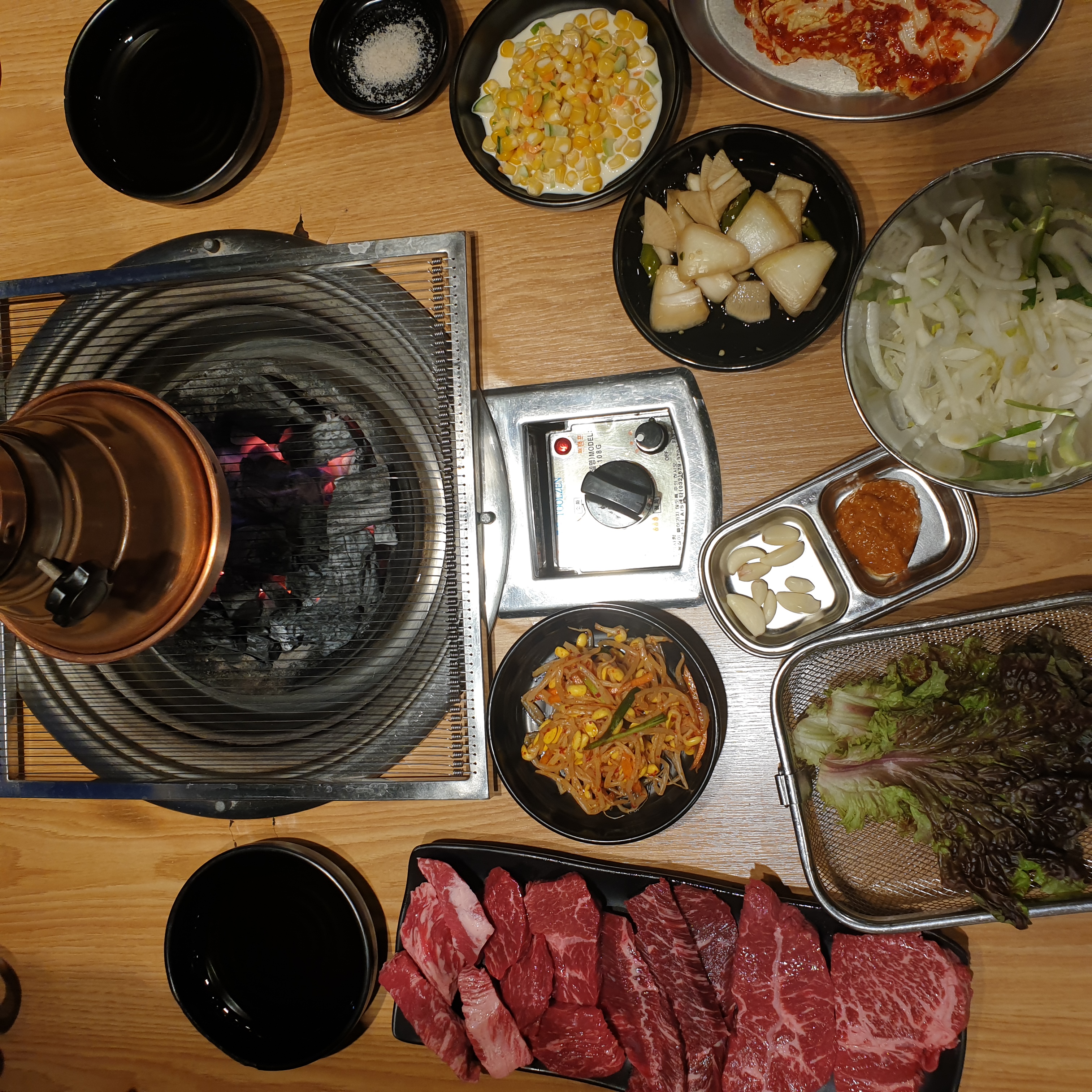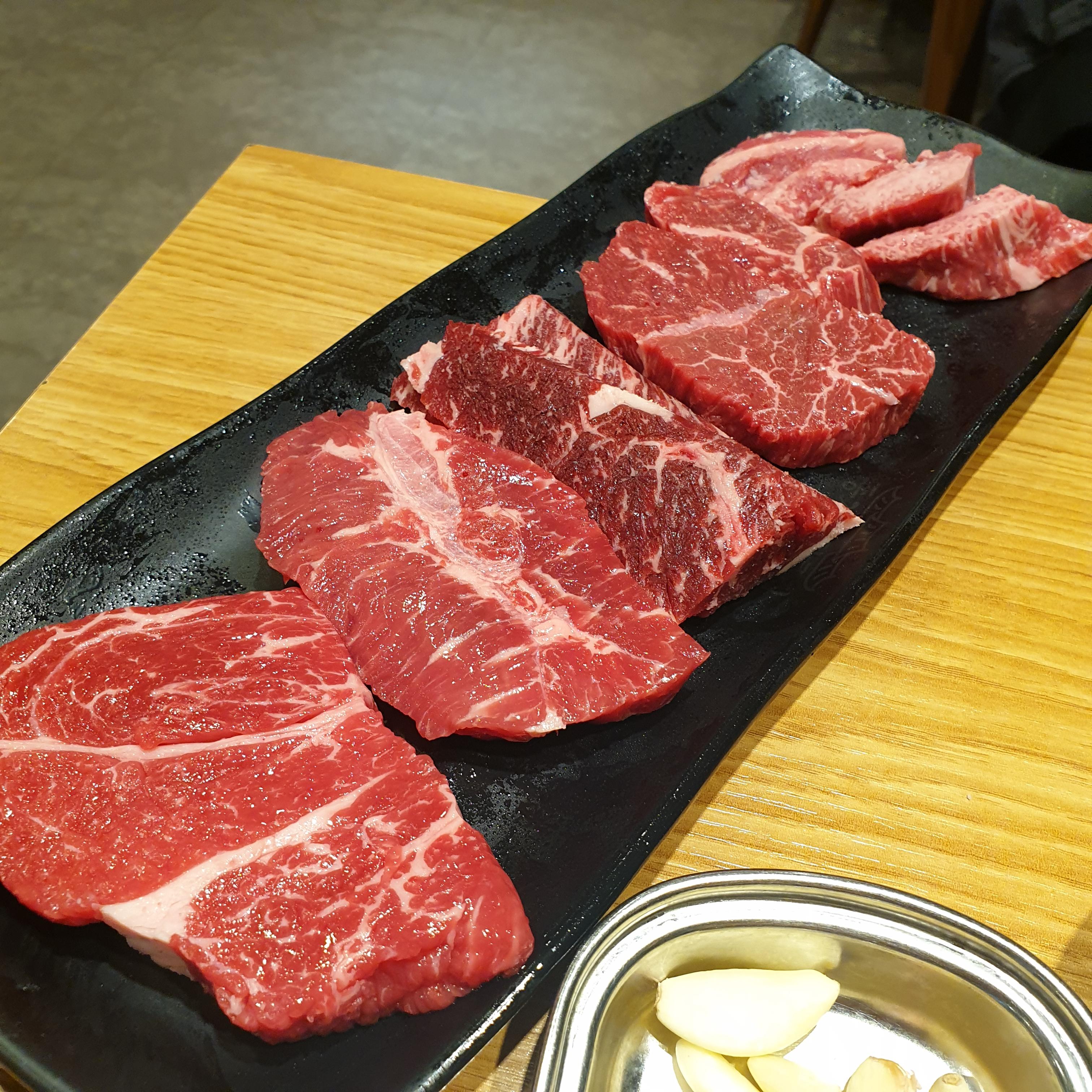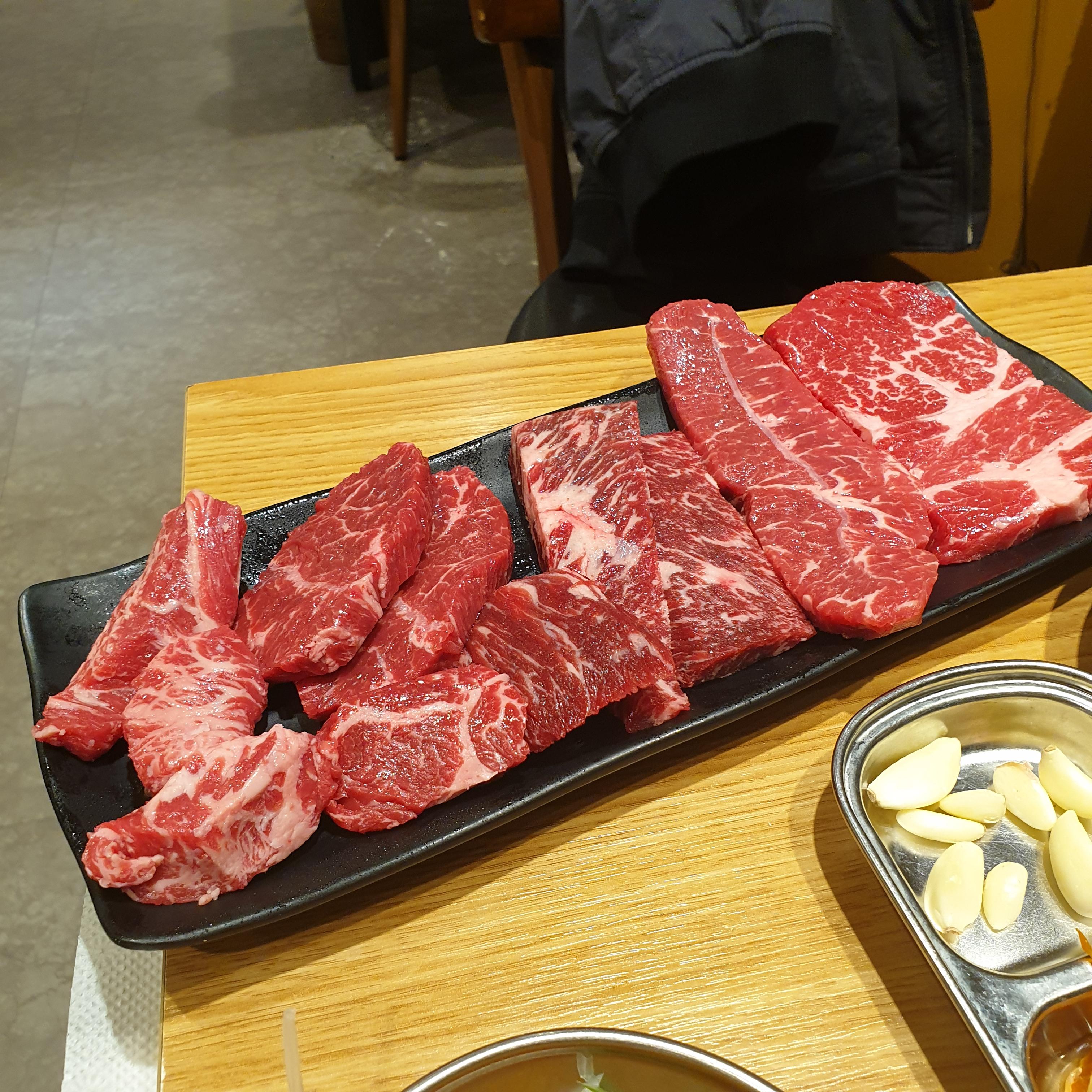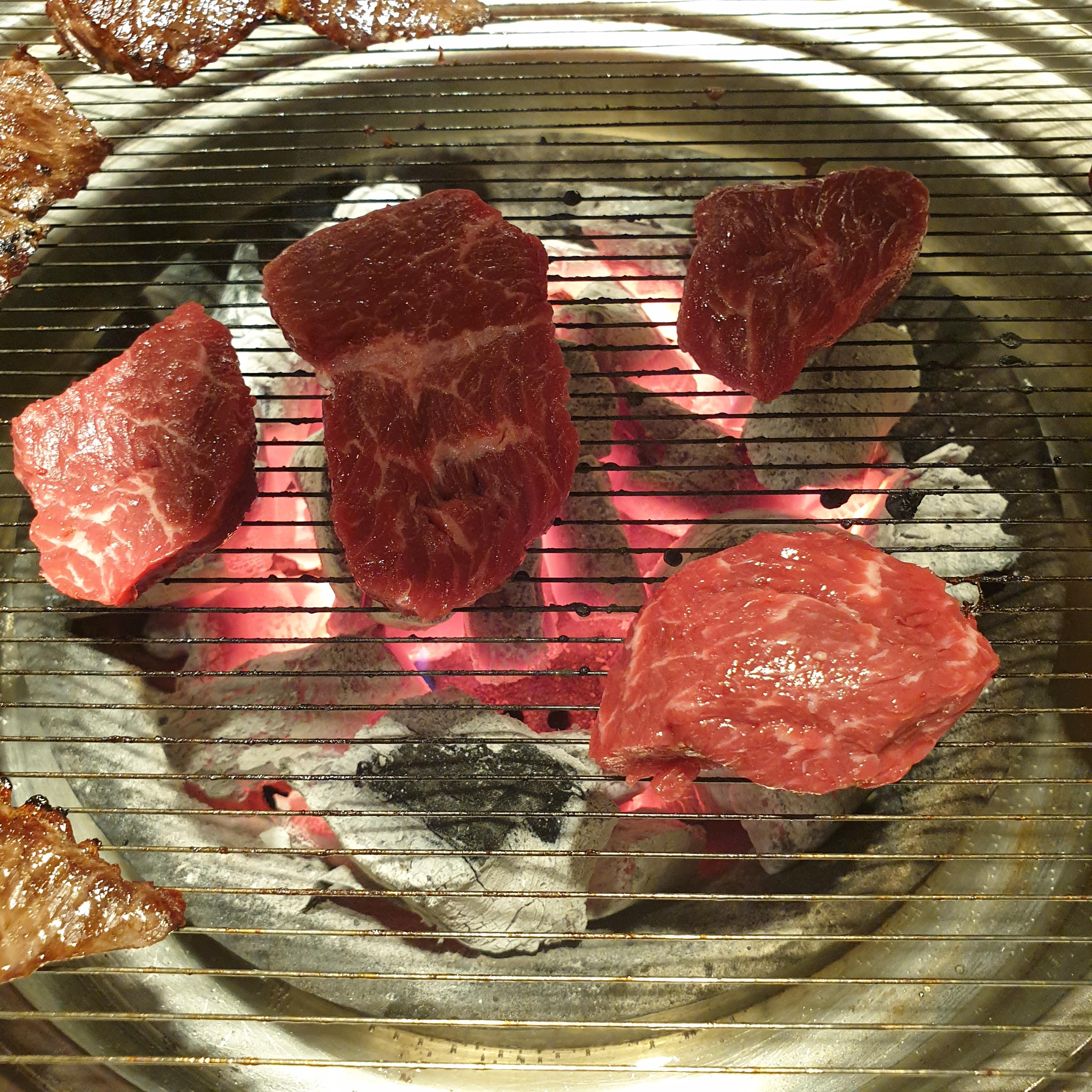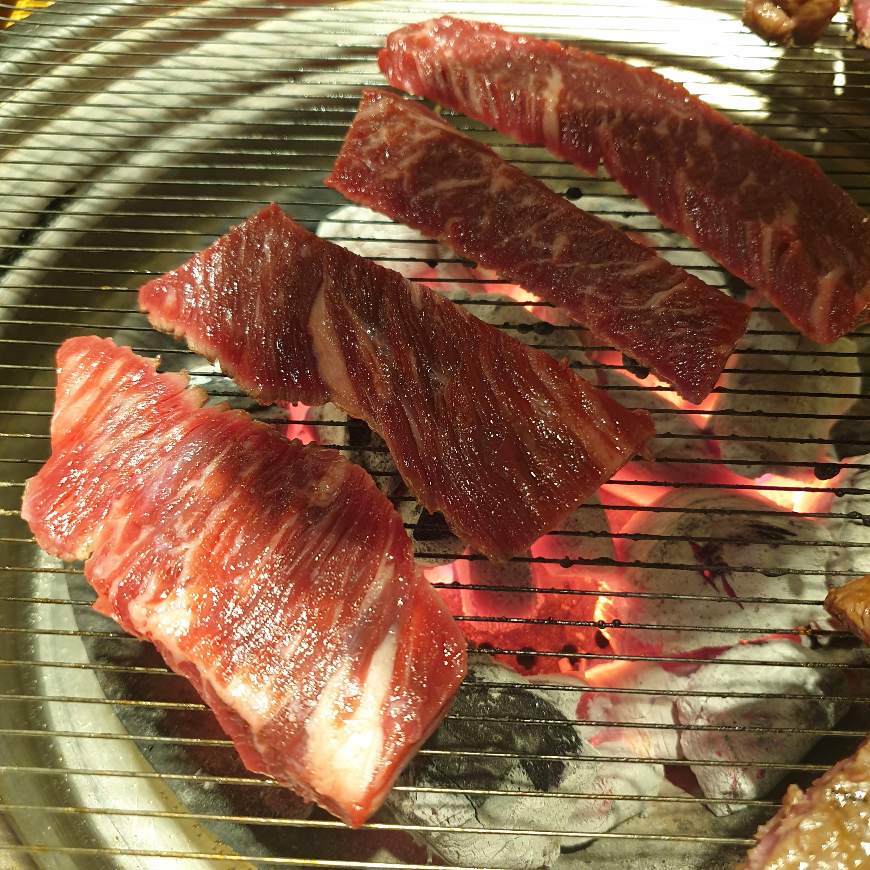 고기는 크게 좋지도 나쁘지도 않은 정도의 소고기로 조각조각난 고기를 여러개 줍니다. 블로그에는 LA갈비도 있었는데 실제로 있는 메뉴판에는 LA갈비가 들어가 있지 않으니 참조하세요. 부위별로 고기를 구웠습니다.