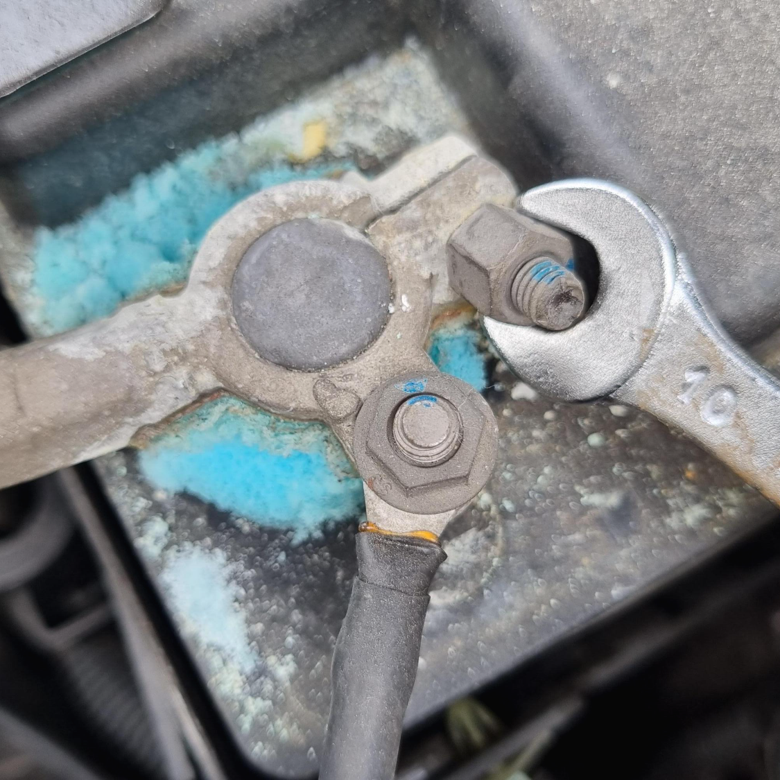 위에 +,- 단자에 푸른색으로 산화가 되었는데 이렇게 되면 배터리 수명이나 기능에 문제가 있을 수 있다고 합니다. 그래서 전 배터리 터미널을 구매했는데 이것도 제조사마다 다르니 꼭 동일한 것으로 구매를 하시거나 여건이 되지 않으면 칫솔이나 천으로 저 부분을 제거하고 다시 사용해도 됩니다.