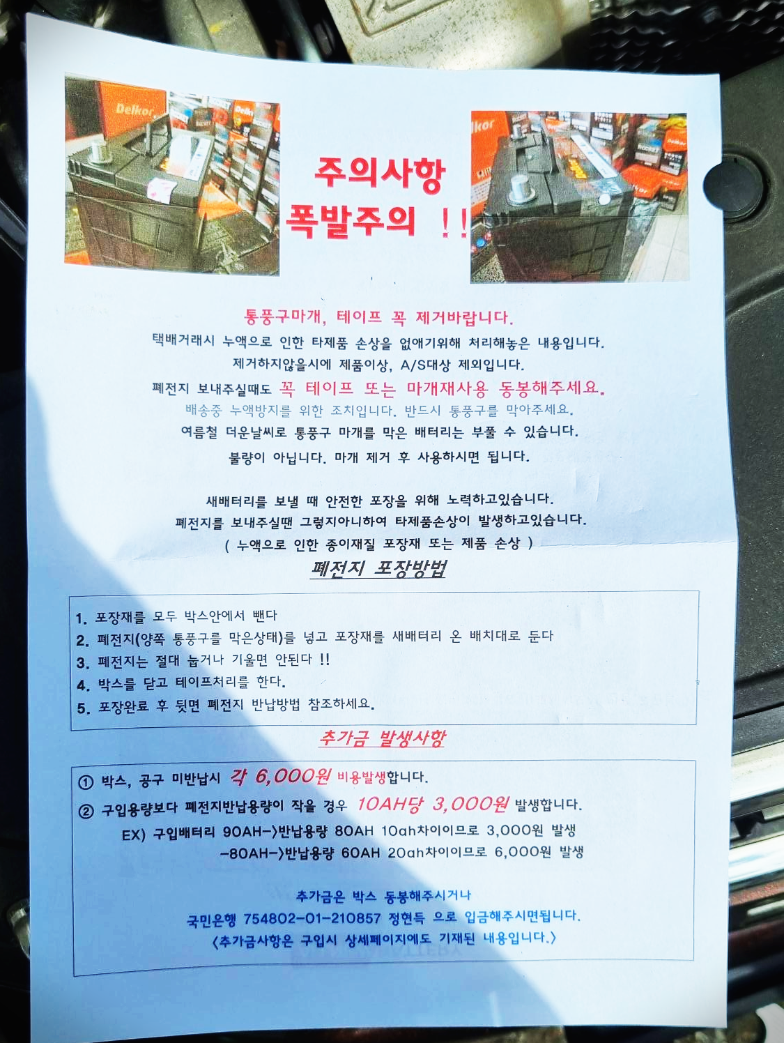 배터리를 자주 교체하는 게 아니다 보니 배터리의 용량이 어디에 쓰여 있는지 모르게 됩니다. 폐배터리를 회수를 해가고 용량이 달라 추가금 3,000원을 다시 입금하라고 합니다. 확인용으로 가지고 있어 주세요.