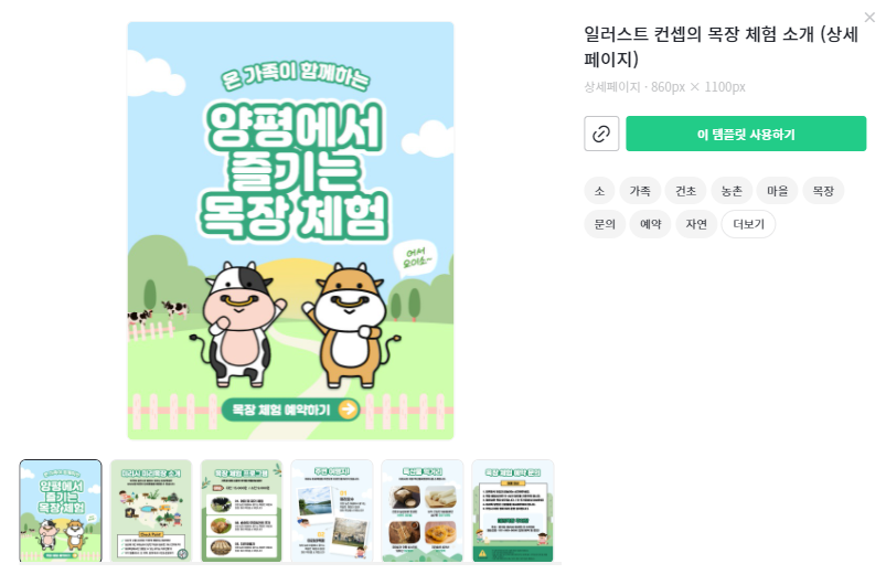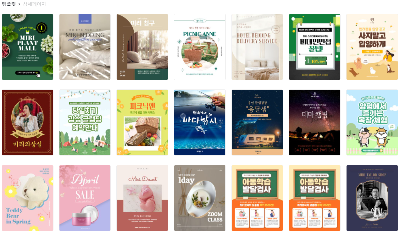 직접 디자인을 한다면 상단메뉴에 있는 [템플릿]으로 이동합니다. 원하는 타입을 선택하면 됩니다. 상세페이지, 이벤트 페이지를 제작하는 방법은 클릭 몇번으로 제작할 수 있습니다.
