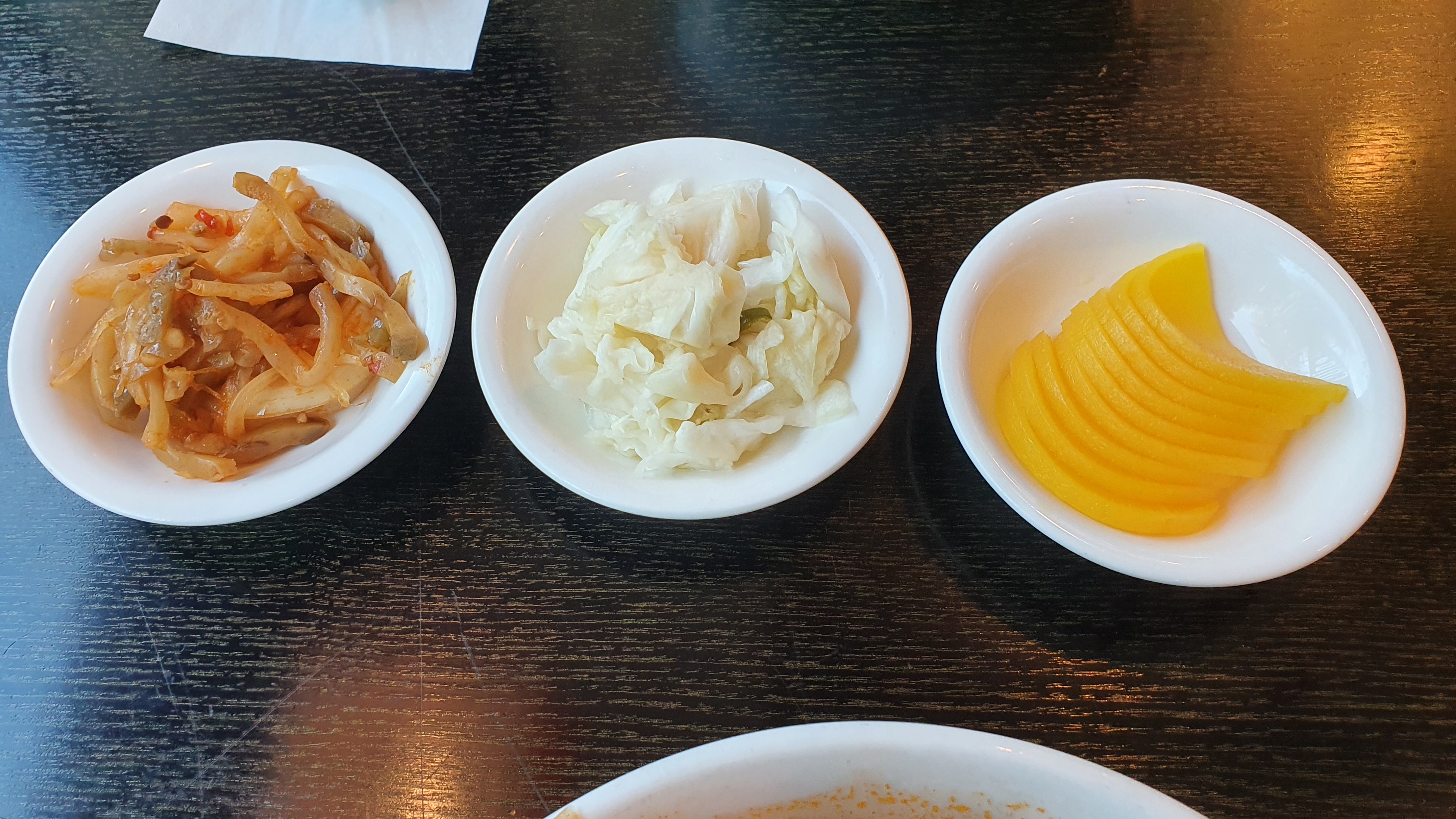 기본 반찬은 짜사이, 양배추 절임, 단무지가 나옵니다.