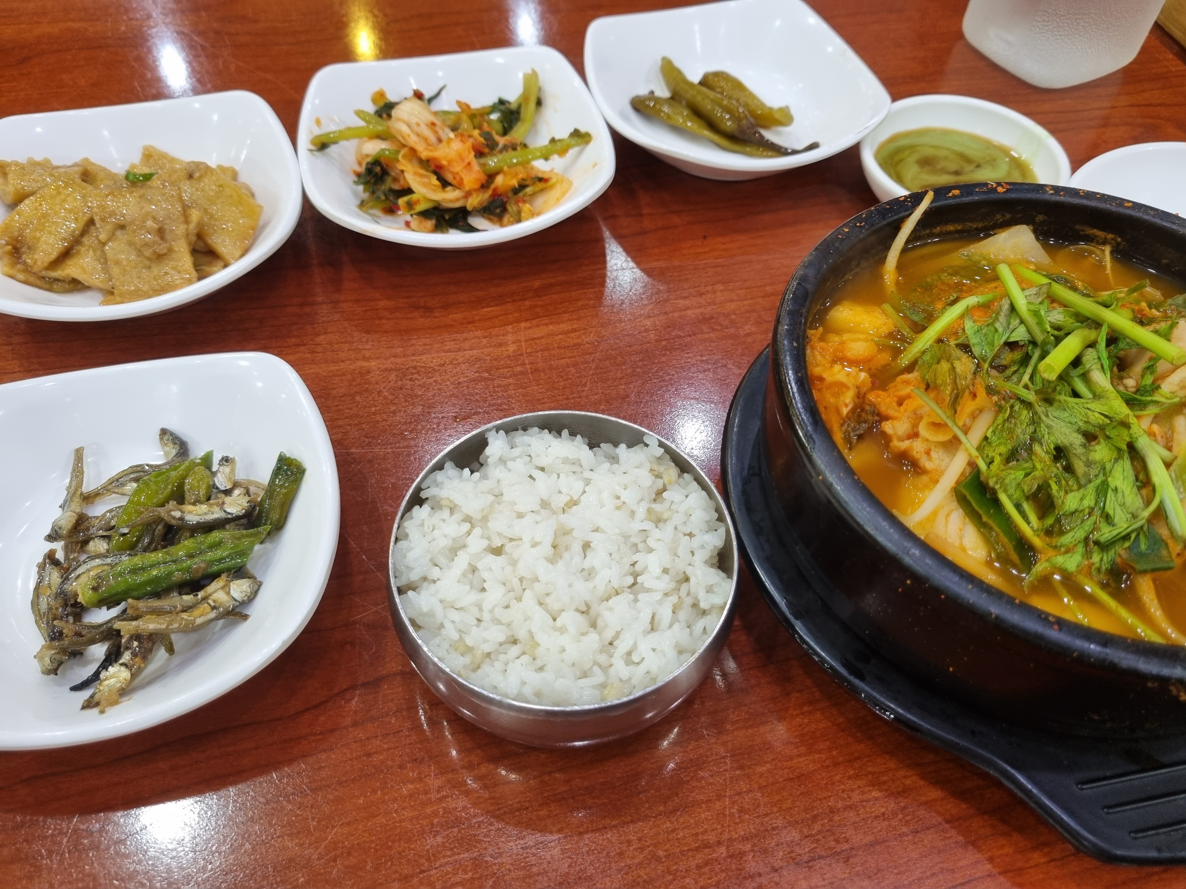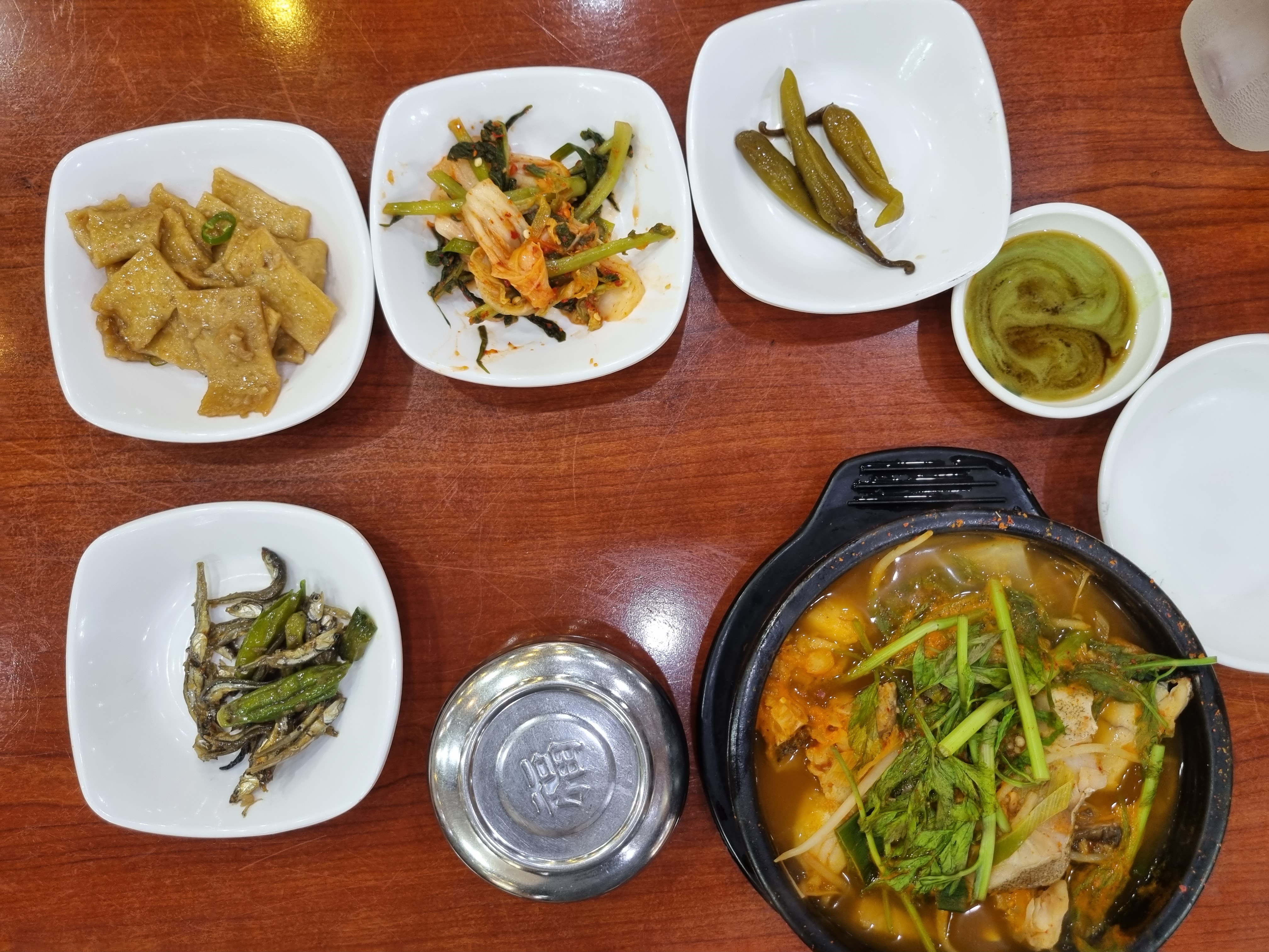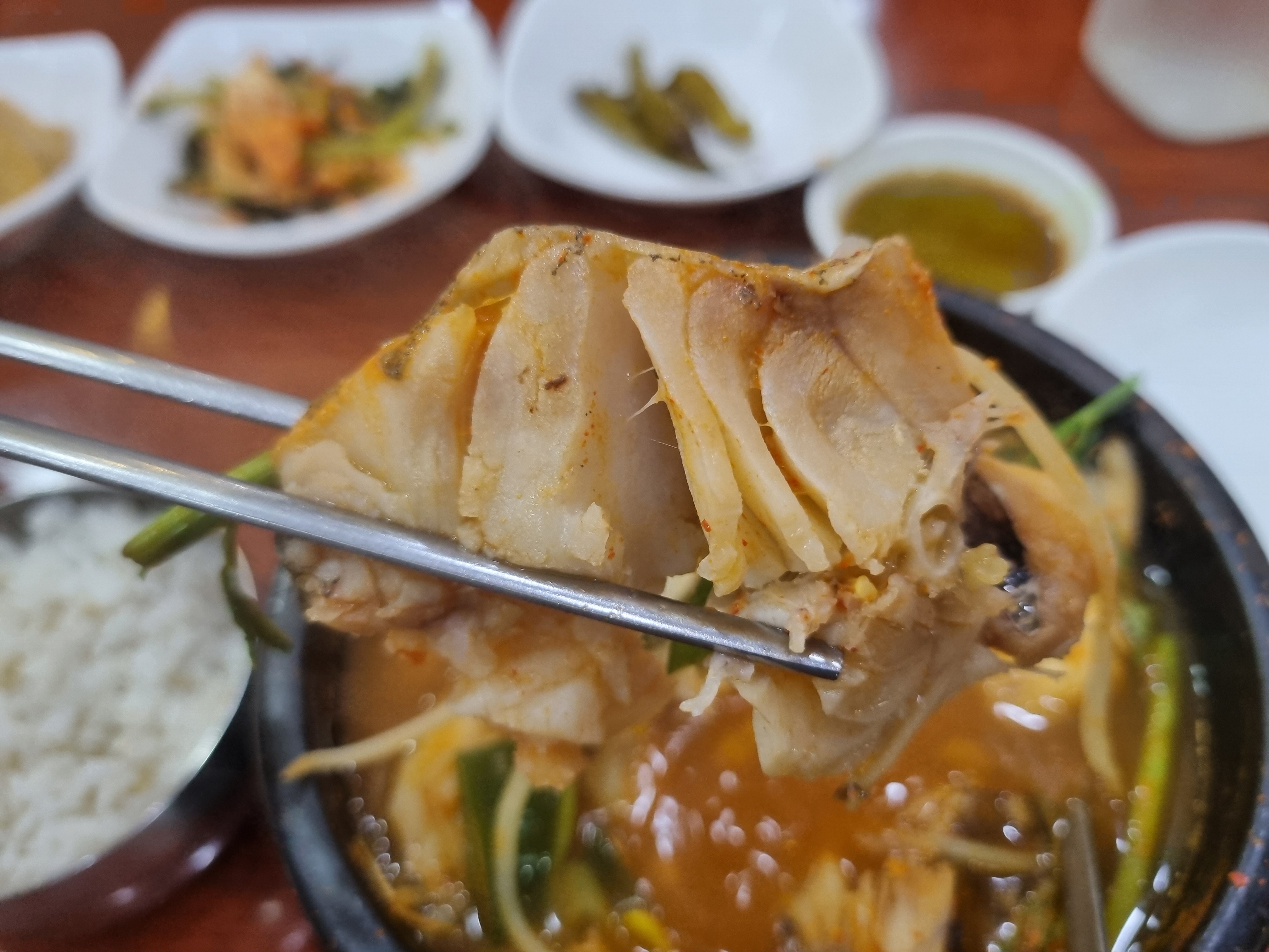 시골에서 맛있게 먹는 심심한 맛을 느낄 수 있었는데, 탕에 있는 미나리는 달달하고 아삭한 식감을 주고 대구가 생태처럼 맛있습니다. 밑반찬으로 나오는 열무김치, 멸치볶음, 고추장아찌, 어묵볶음도 달지 않고 맛있게 먹을 수 있었습니다.
