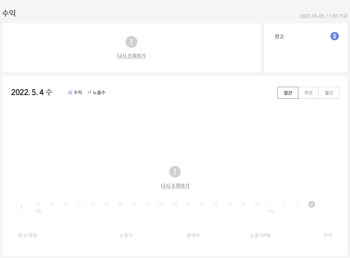카카오 애드핏과 구글 애드센스가 다시 조회하기만 나오게 됩니다. 특히 야간에 보면 에러가 자주 나타나게 됩니다. 처음에는 이것이 야간이라 안되거나 점검이라 안보여지는 것으로 알 수 있습니다.