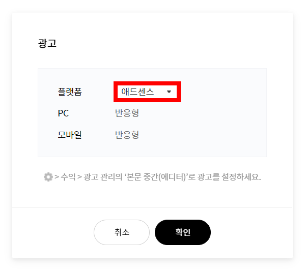 ⚙️>수익>광고관리의 '본문 중간(에디터)'로 광고를 설정하세요.