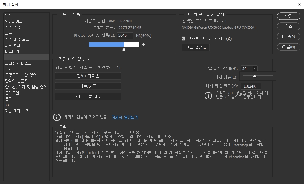 아주 쉬운 방법으로 포토샵 되돌리기(뒤로가기)의 횟수를 조정할 수 있습니다. 단 횟수를 계속 늘리면 속도저하가 문제가 될 수 있으니 적당히 늘려주면 됩니다. 작업 내역이 최대 1000번까지 되다보니 리터칭을 하거나 쉬지 않는 작업을 하고 마음에 들지 않을때 유용하게 써먹을 수 있습니다.