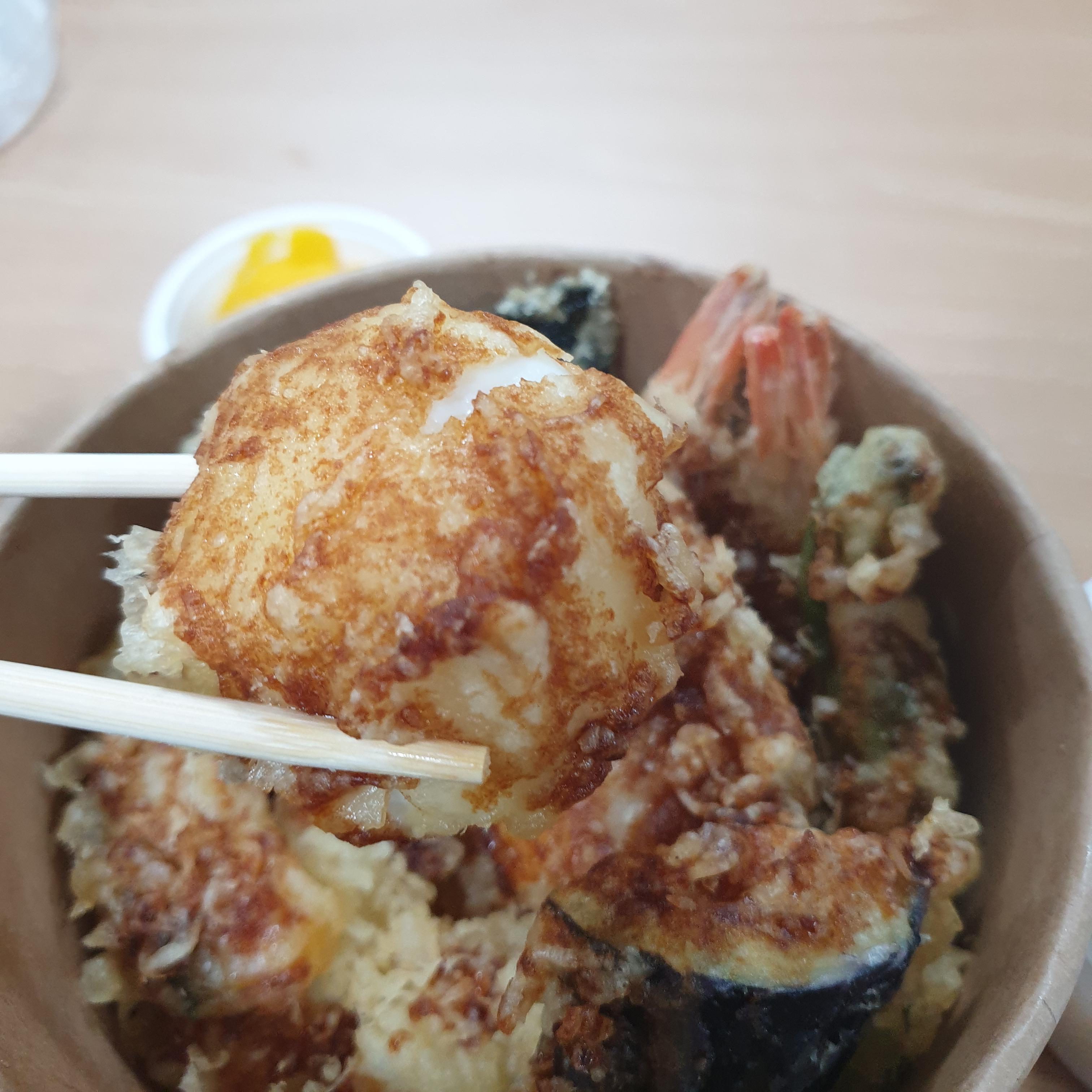 새우튀김, 단호박, 가지, 꽈리고추, 김,온센타마고(반숙란)가 들어가 있습니다.