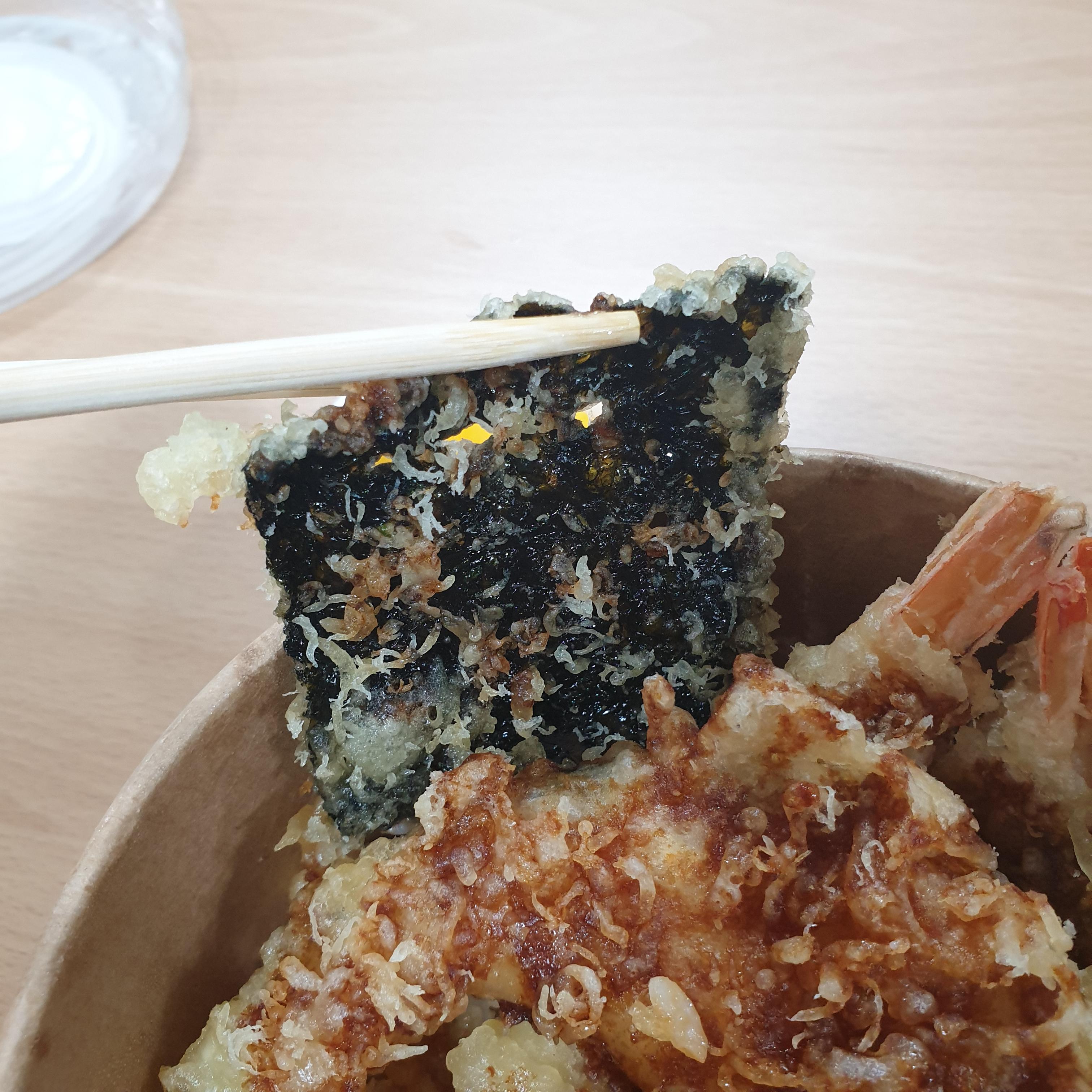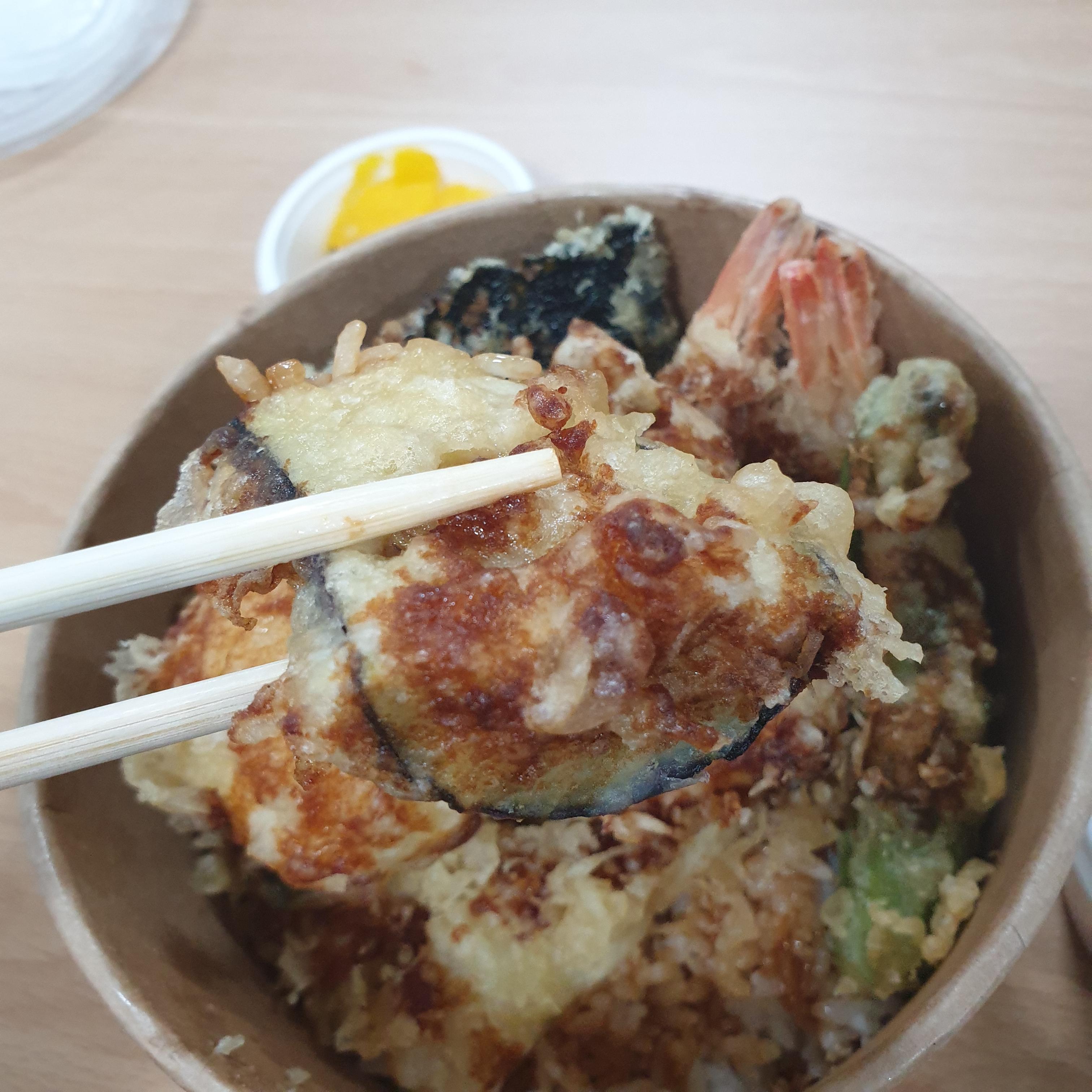 새우튀김, 단호박, 가지, 꽈리고추, 김,온센타마고(반숙란)가 들어가 있습니다.