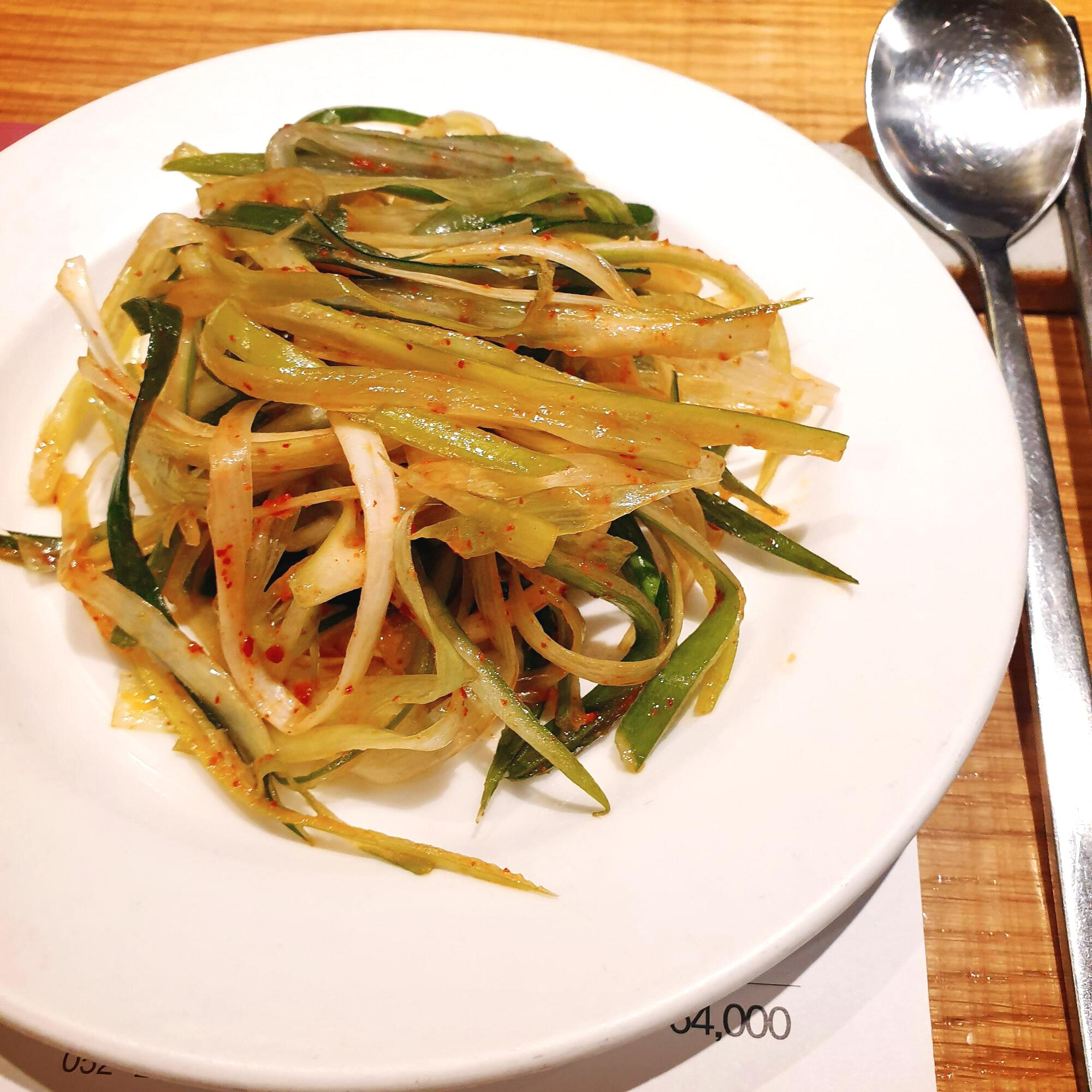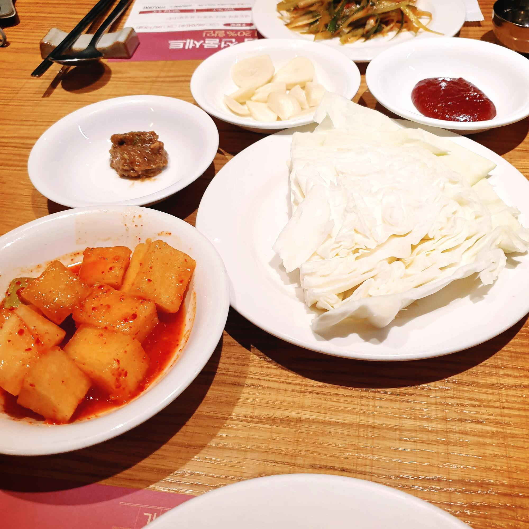특별한 기본 반찬이 없고 깍두기, 파채, 양배추, 생마늘만 나옵니다.