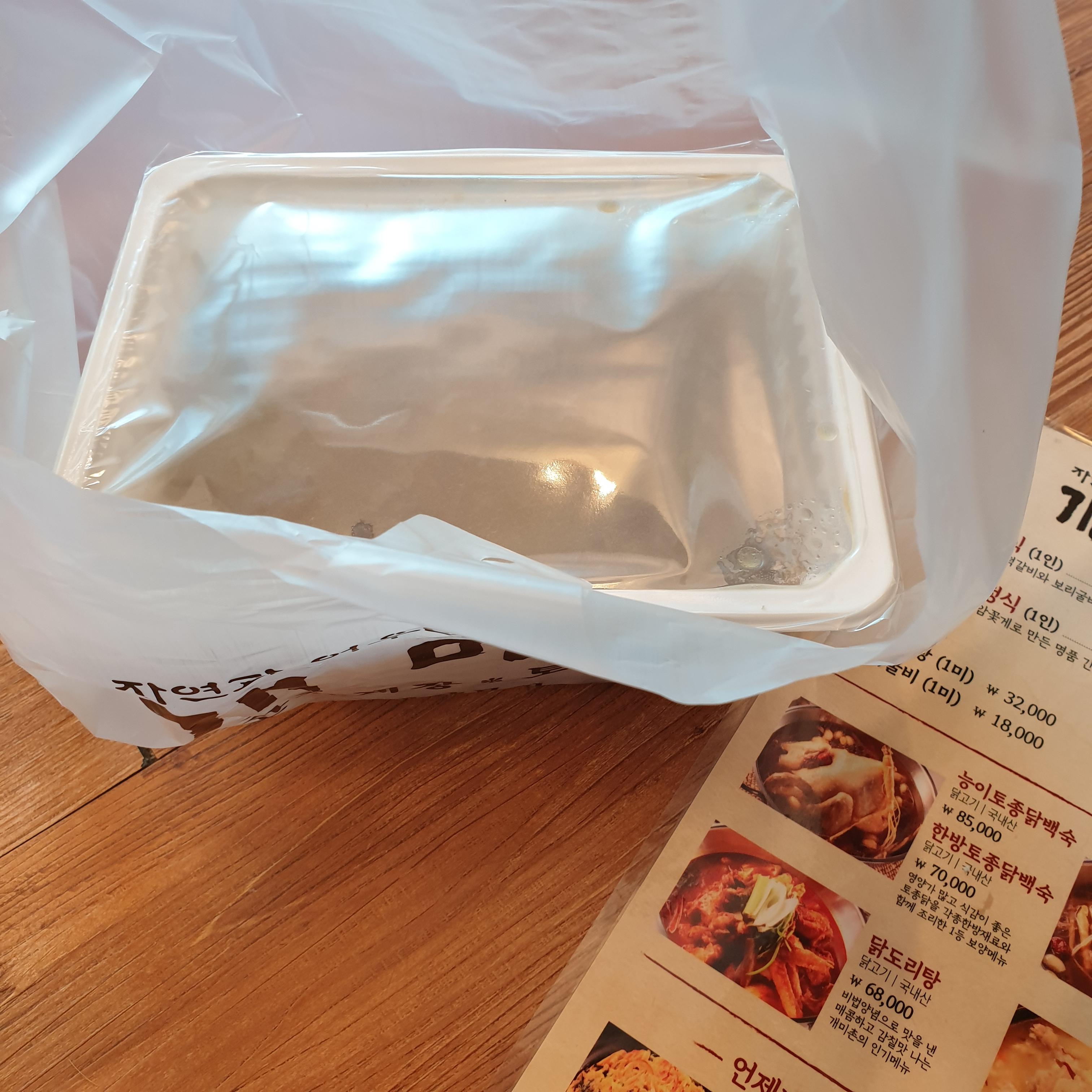 오리백숙은 반이상이 남아 죽과 함께 포장을 요청하여 이렇게 가지고 갈 수 있게 포장을 해줍니다.