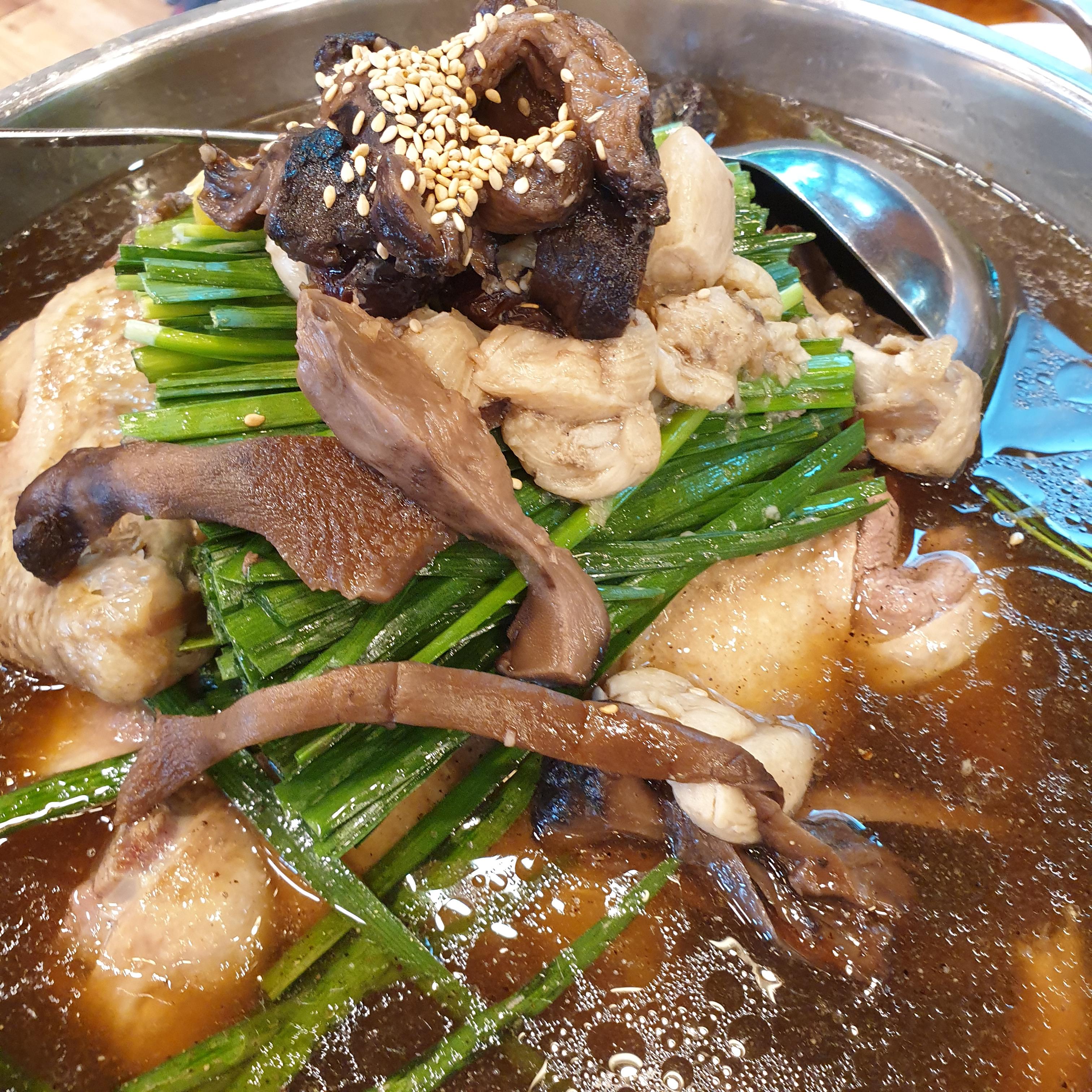엄청나게 큰 오리 한마리와 그 위에 부추와 능이, 마늘이 푹 고아져 나옵니다.