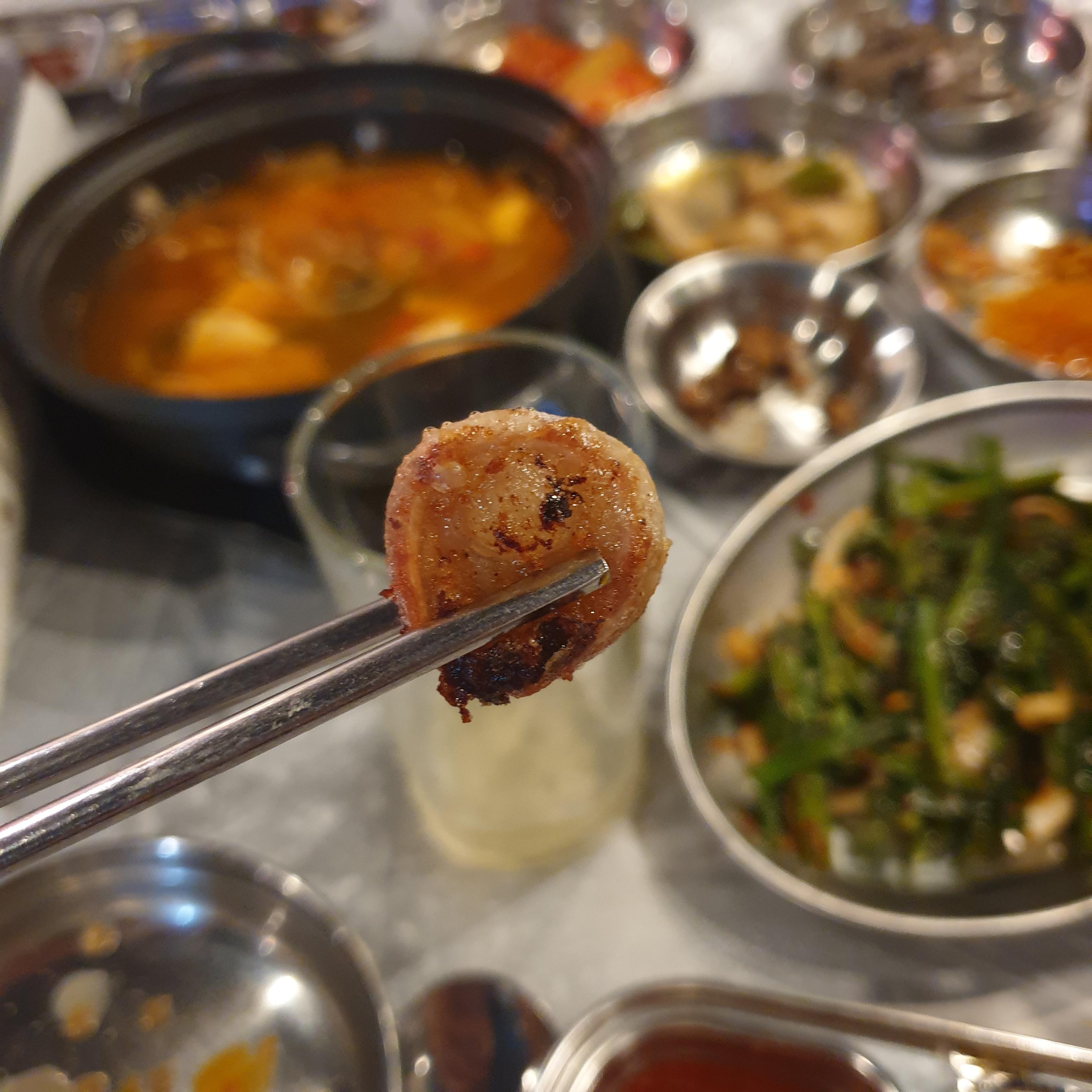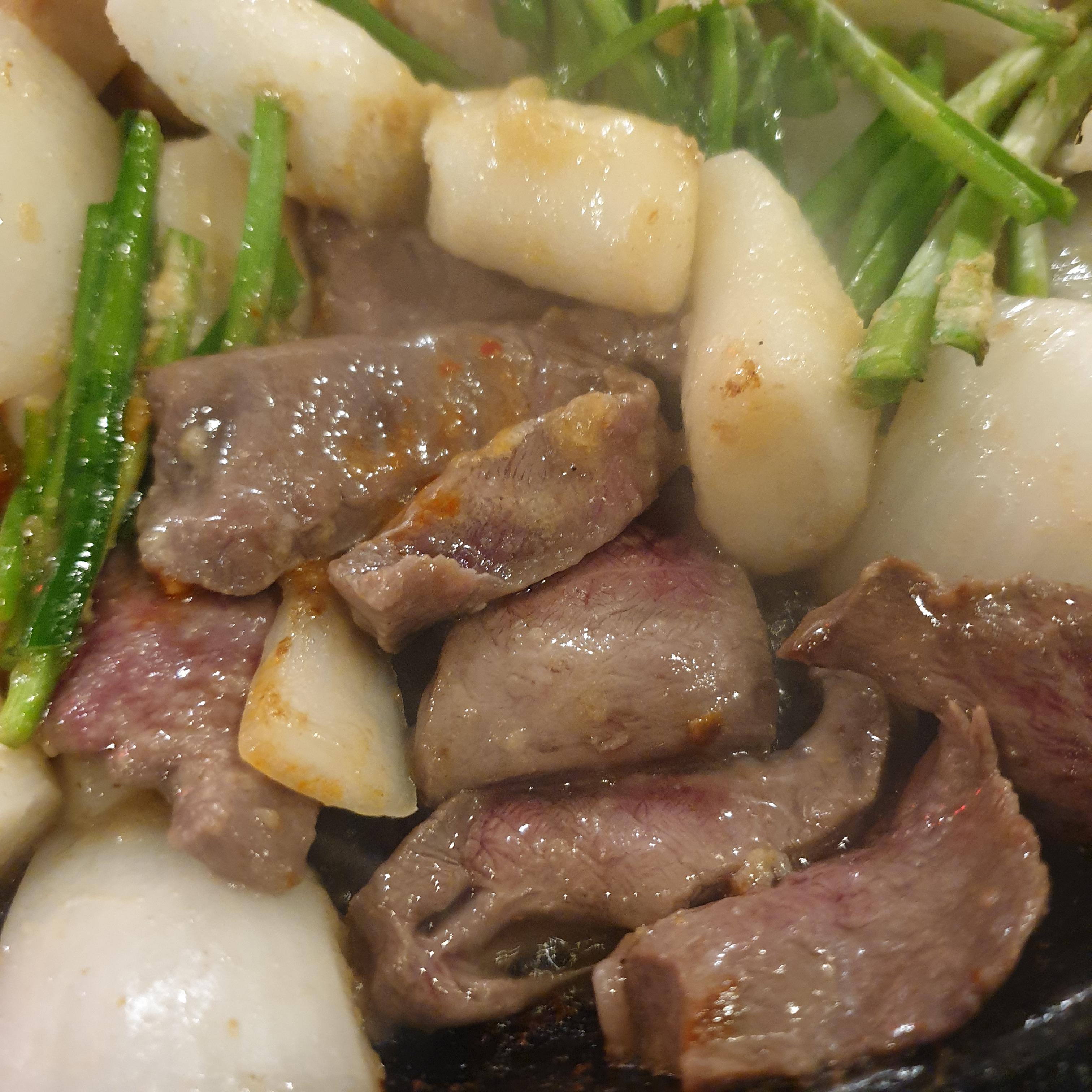 염통은 완전히 익기 전에 먹어야 부드럽게 먹을 수 있고 대창은 곱이 많이 들어가 있습니다. 특양은 다른 곳보다 두께가 얇았습니다. 모두 국내산 한우로 보이지만 곱창, 대창, 막창은 국내산 육우이고 특양과 갈비살은 수입산입니다.