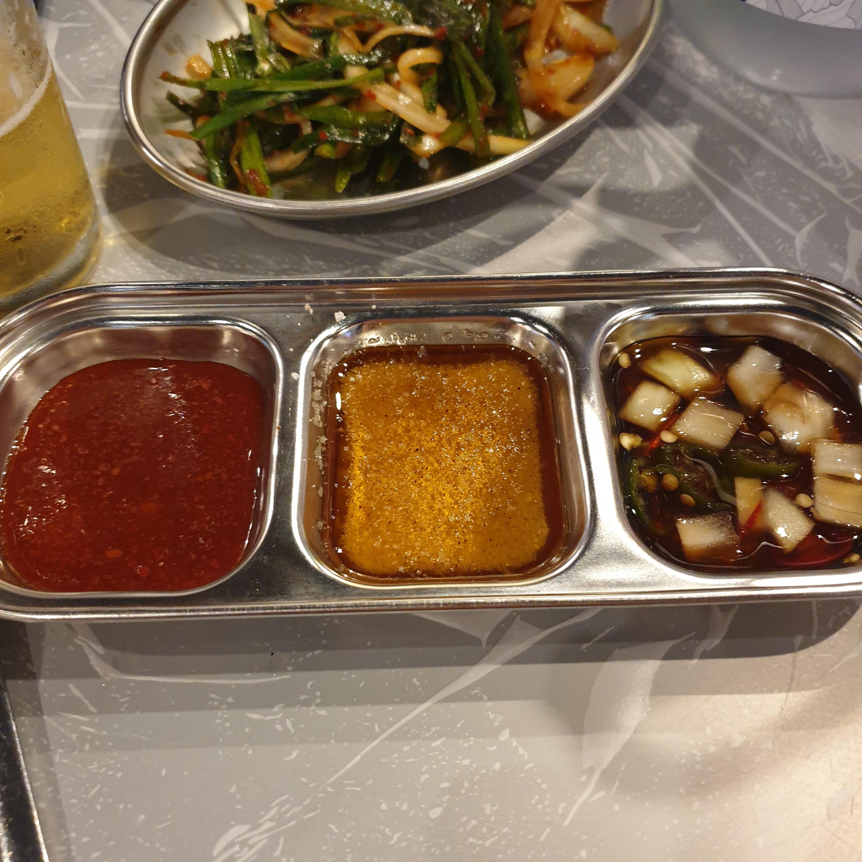처음 세팅으로 김치와 순두부가 들어가 있는 김치콩나물국이 나옵니다. 파김치, 천엽, 장아찌, 표고버섯와사비, 콩나물무침, 부추무침이 나오고 3종 양념장(간장, 소금장, 양념장)이 준비됩니다.