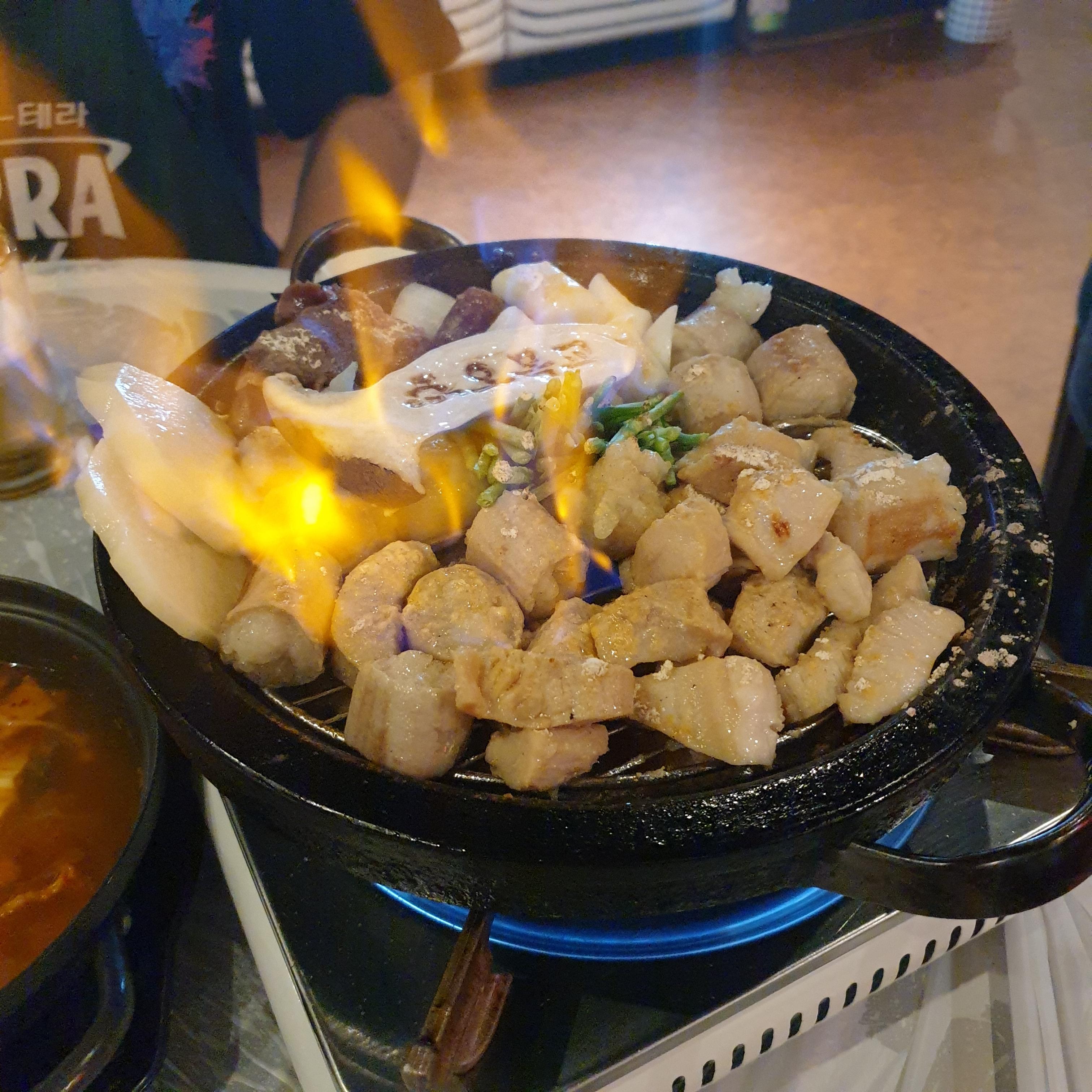 굽던 도중 불쇼를 보여줍니다. 잡내도 없어지고 볼 거리도 있어 재미있습니다.