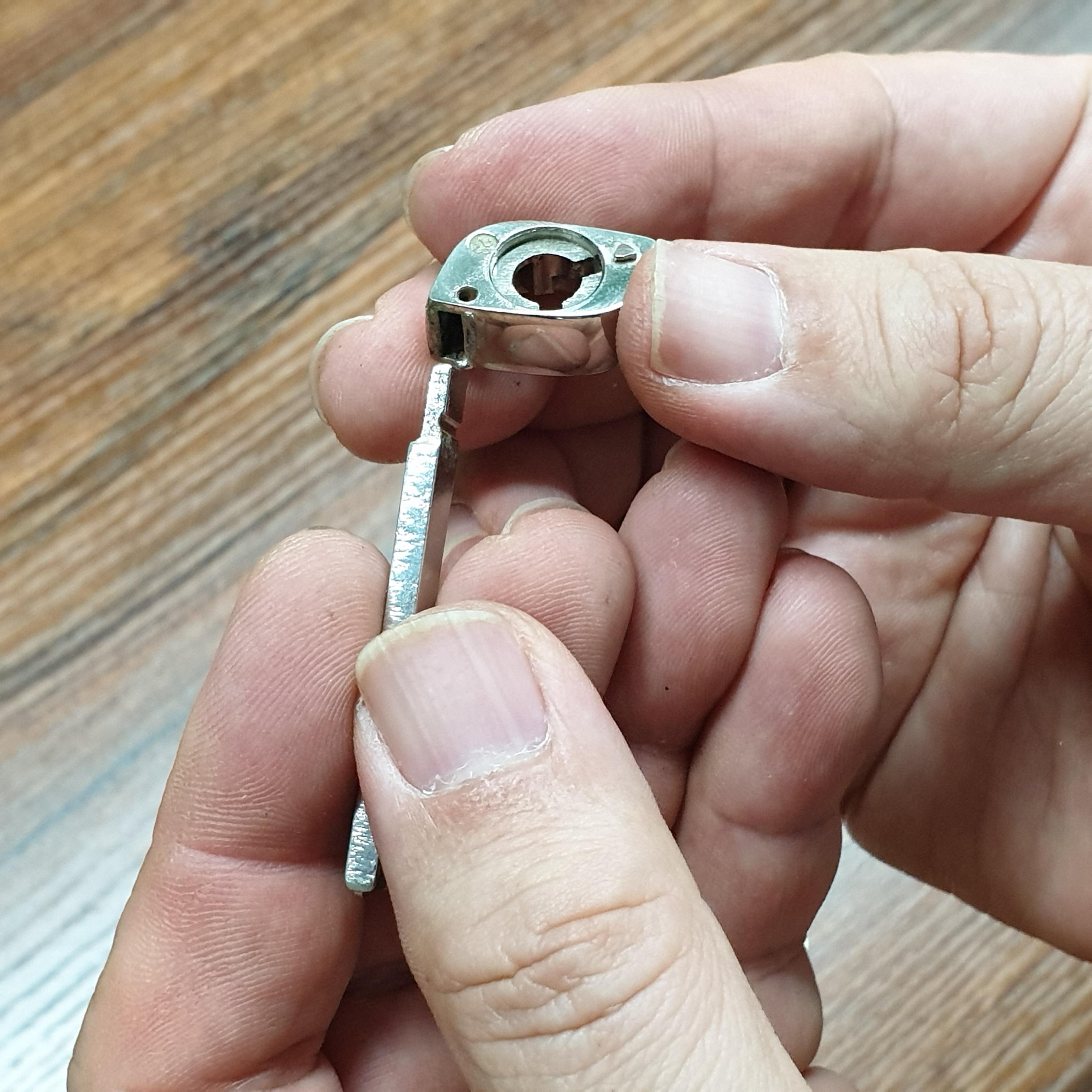 7. 교체할 키홀더에 이제 키를 꽂아준 다음 아까 뺀 걸쇠를 꽂아주면 됩니다. 걸쇠를 꽂아 키가 흔들리거나 빠지지 않아야 정상입니다.