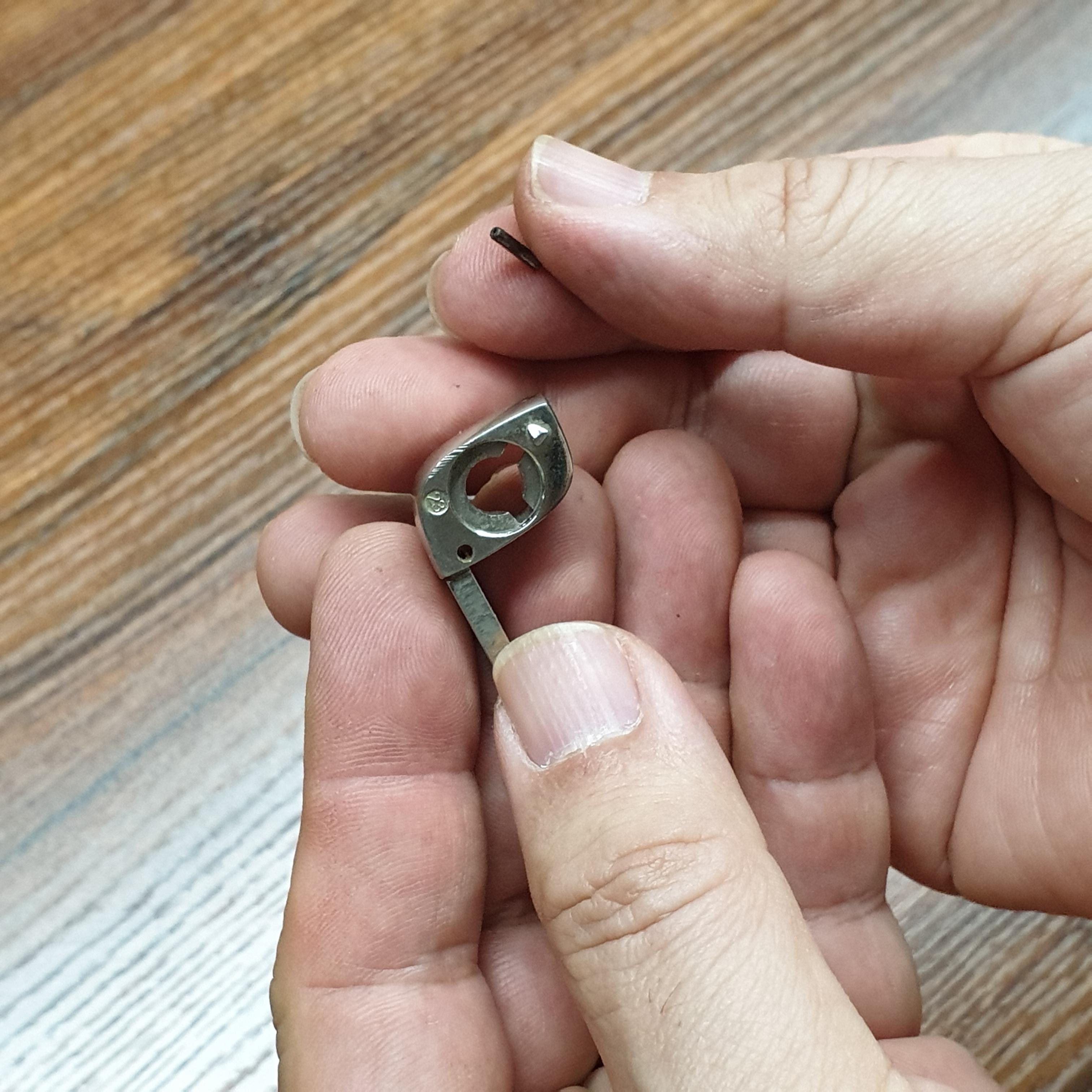 3.키를 분리하기 위해서는 '정(凿)=노미'가 필요한데 저렇게 작은 굵기가 없습니다. 송곳으로 해봤지만 송곳보다도 얇아야 합니다. 집에서 쉽게 찾을 수 있는 클립(더블클립)을 사용하면 쉽게 할 수 있습니다. 구부러져 있는 더블클립을 사용을 했는데 클립에서 손잡이 부분을 해체하여 사용하였습니다.