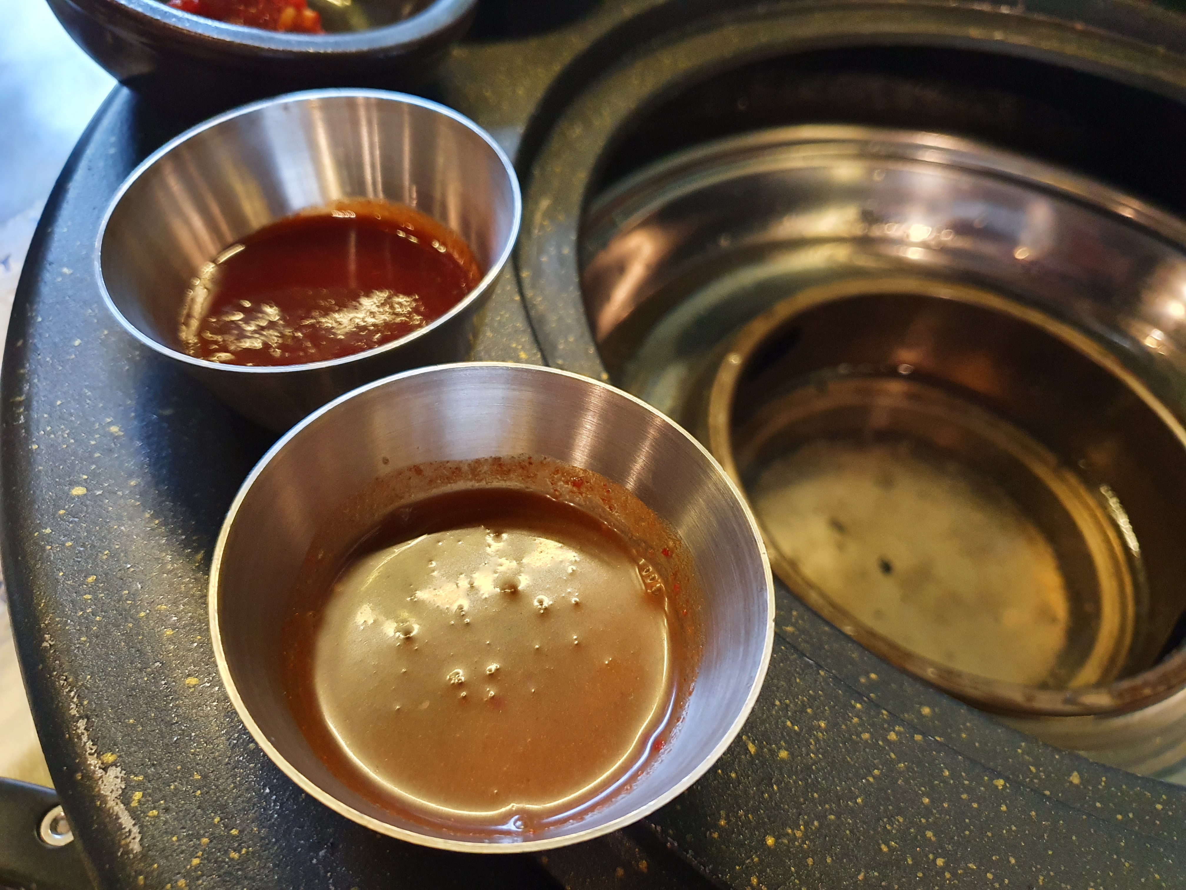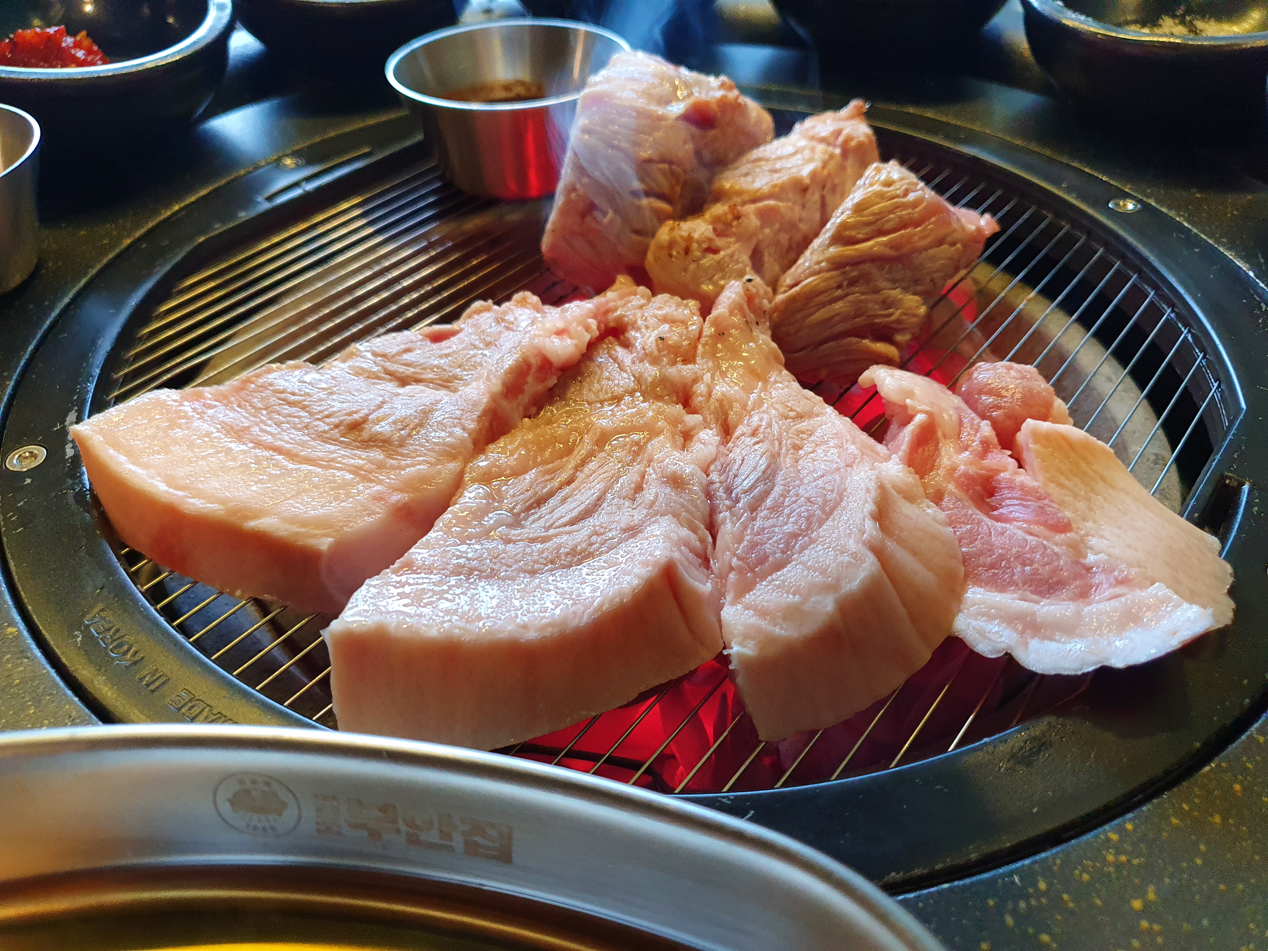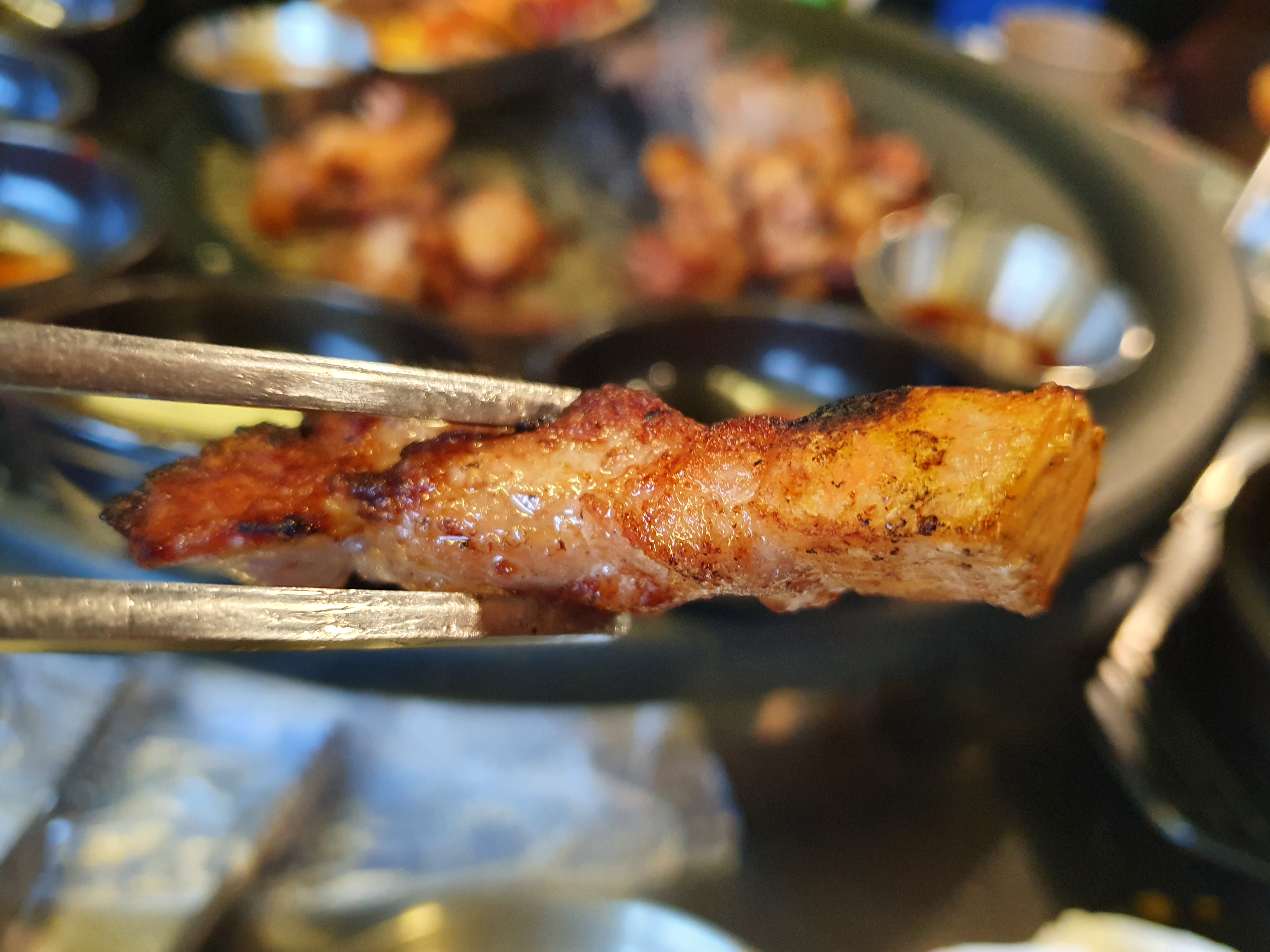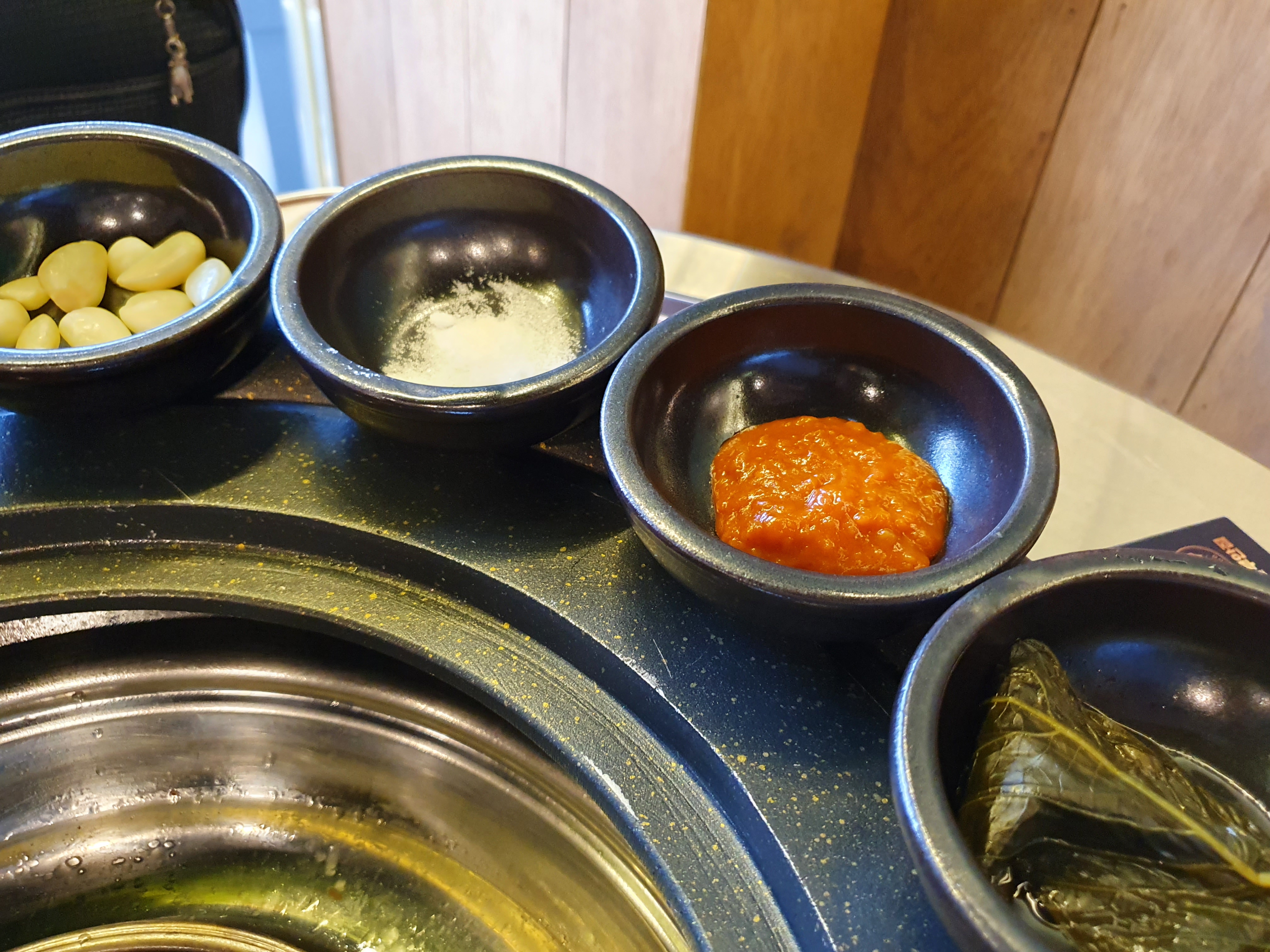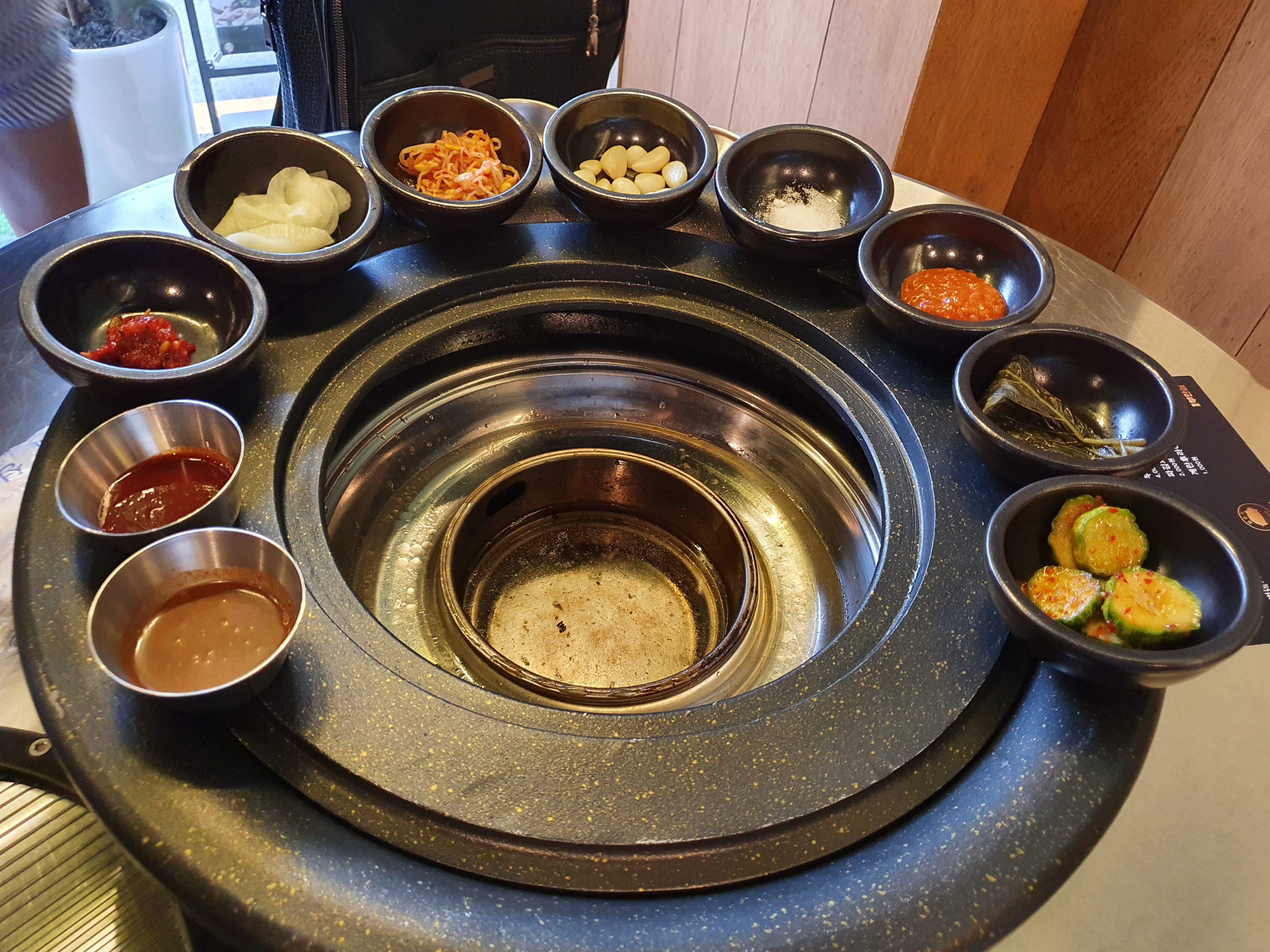 이곳이 다른 고깃집과 크게 다른건 화로옆으로 둘러서 밑반찬이 나옵니다. 사진을 찍을 수 밖에 없는 조명과 세팅으로 모두 몇컷을 찍습니다. "보기 좋은게 먹기도 좋다"를 실천하고 있는 음식점이였습니다. 그런데 여기에 함정이 있습니다. 그릇이 작고 가지수가 많아 보일뿐 다른 고기집하고 비슷하다는게 함정입니다. 그럼에도 추천하는 이유는 고기의 맛이 괜찮았고 SNS에도 반응이 좋기 때문입니다.