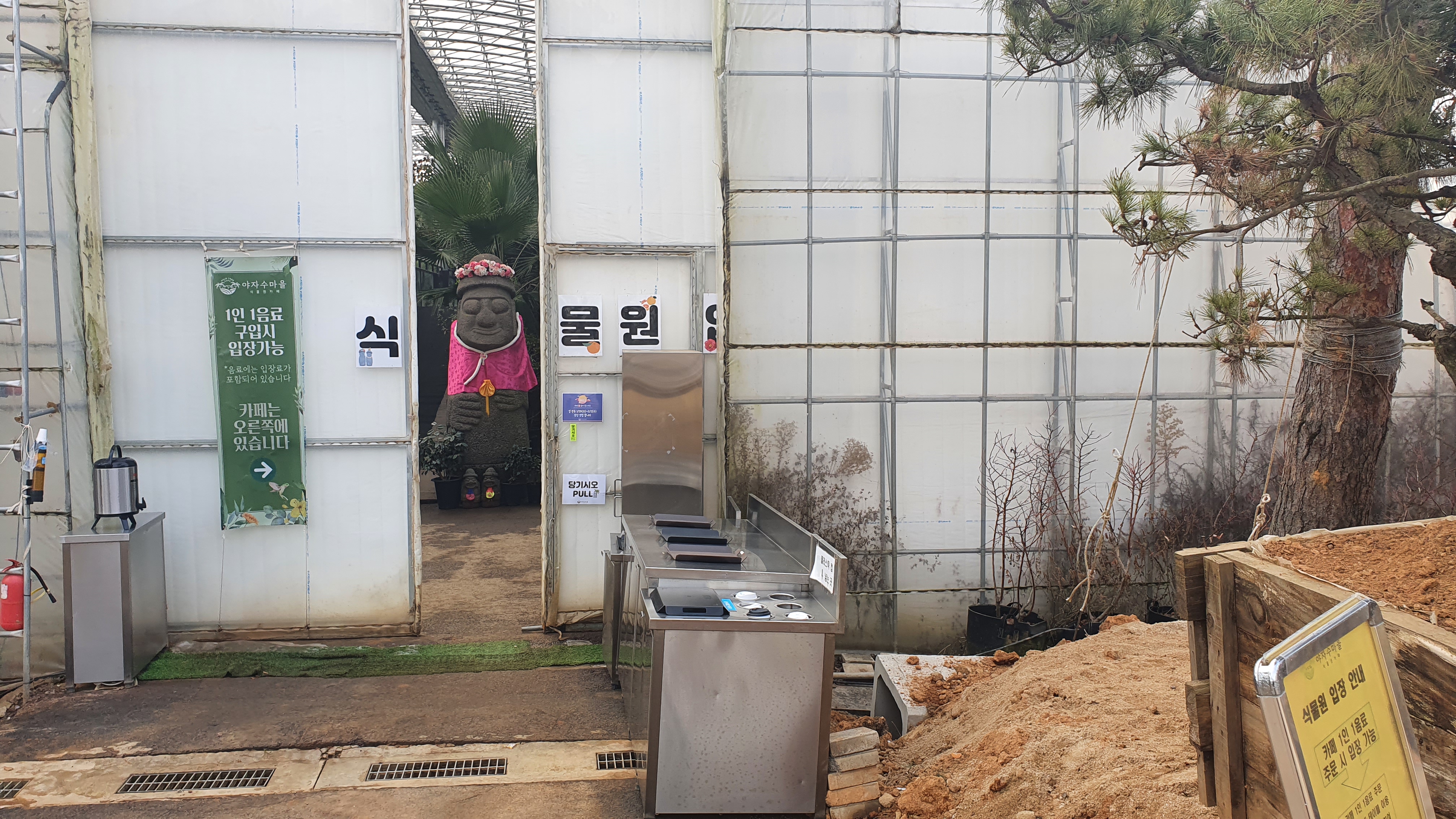 식물원에 들어갈려면 카페에서 음료1잔씩을 마셔야 하는데 기본적인 아메리카노가 7,500원으로 다른 음료는 9,000원까지 받고 있었다. 제주도 가서 볼게 없어서 보는 야자수를 여기에서 이 돈을 내고 봐야된다는게 너무 아까워서랄까? 우리는 그냥 외형만 구경하기로 했다. 카페를 이용해야지만 해변에 있는 벤치를 이용할 수 있게 되어 있어 카페를 이용하지 않는다면 굳이 갈 필요는 없는 곳이였다. 비포장도로에 산 꼭대기에 있어 추천하지는 않는다.
