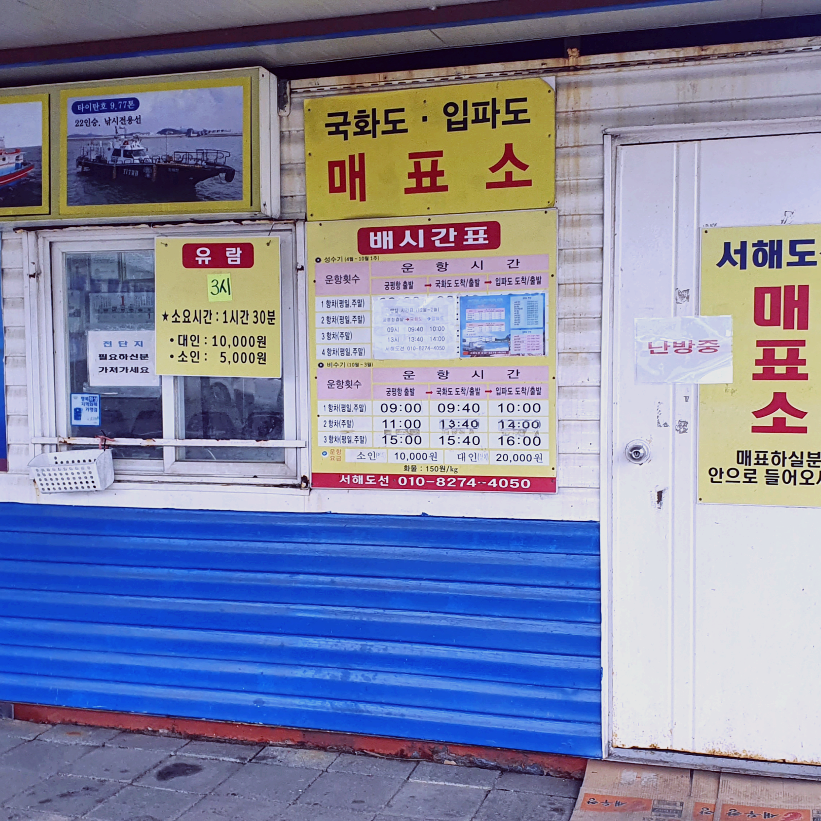 성수기와 비수기로 되어 나뉘어 있습니다. 겨울에는 9시,13시에 출발하고 성수기에는 9시, 11시, 15시로 보여집니다. 정확한 시간이 궁금하다면 '서해도 매표소 (010-8274-4050)'으로 전화해서 문의하면 됩니다. 운항요금은 왕복요금으로 대인 20,000원, 소인 10,000원입니다. 화물은 1kg당 150원 추가